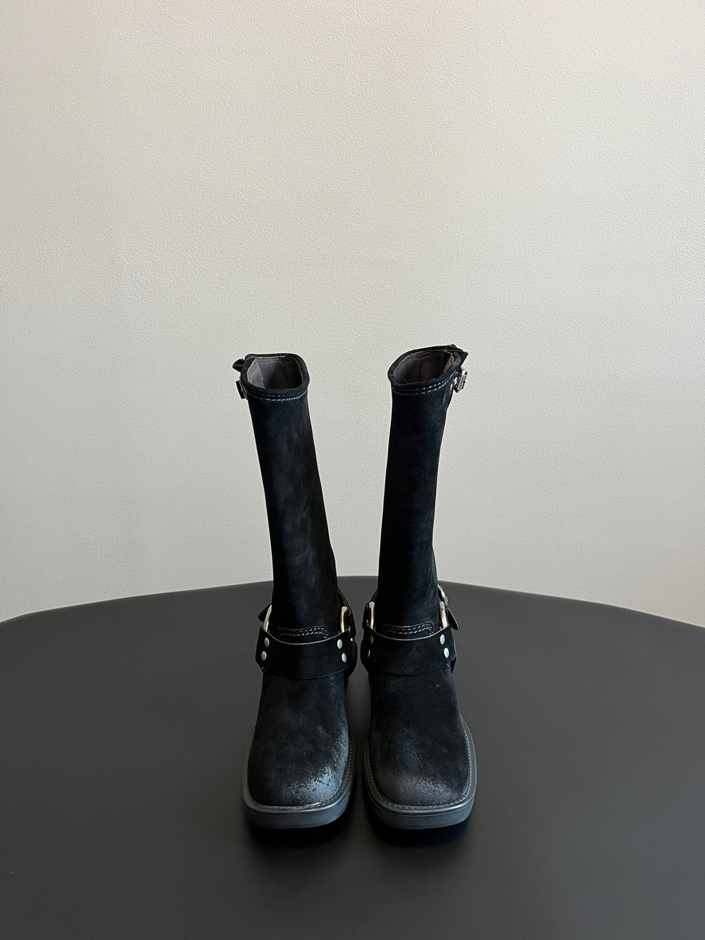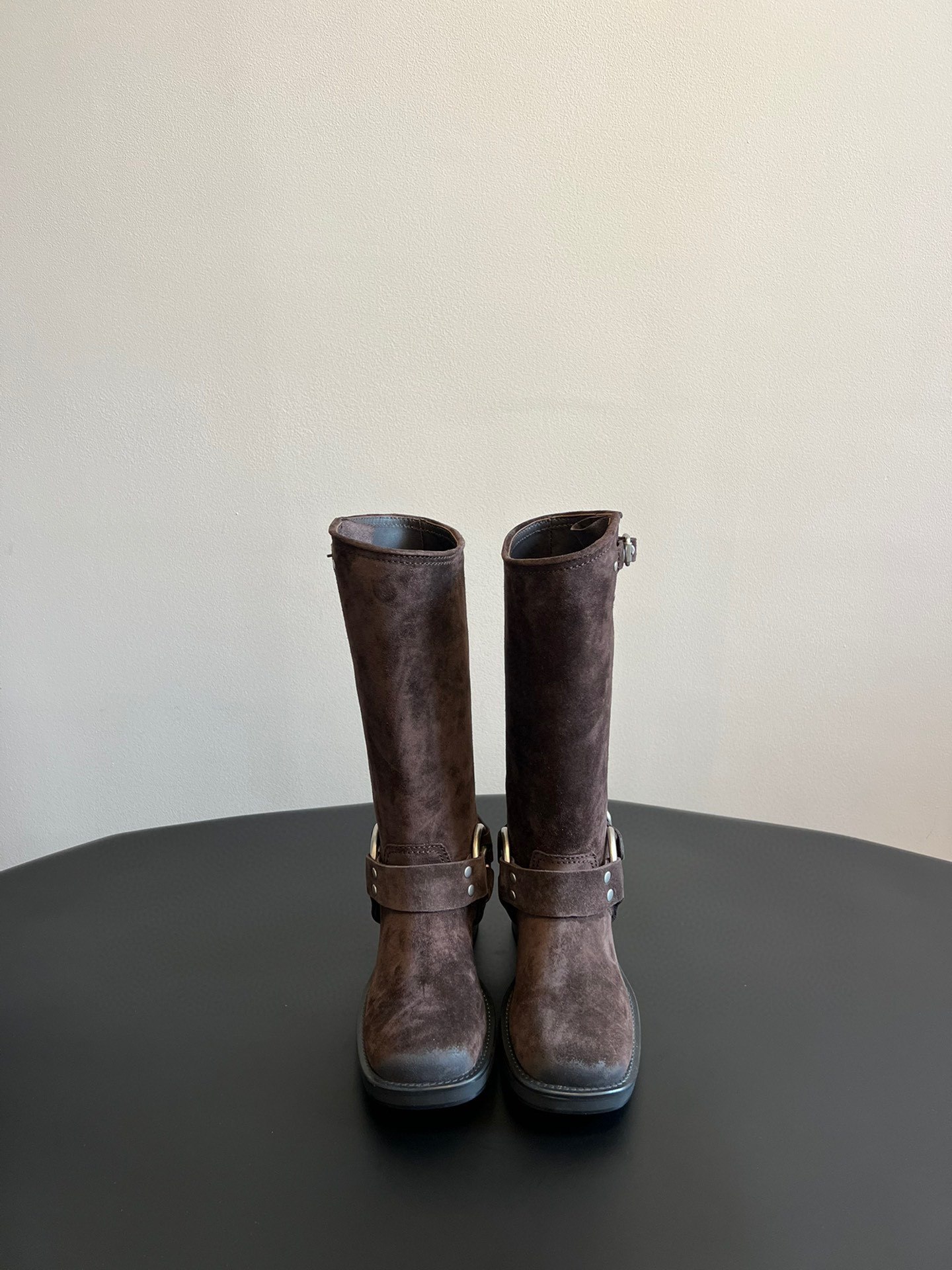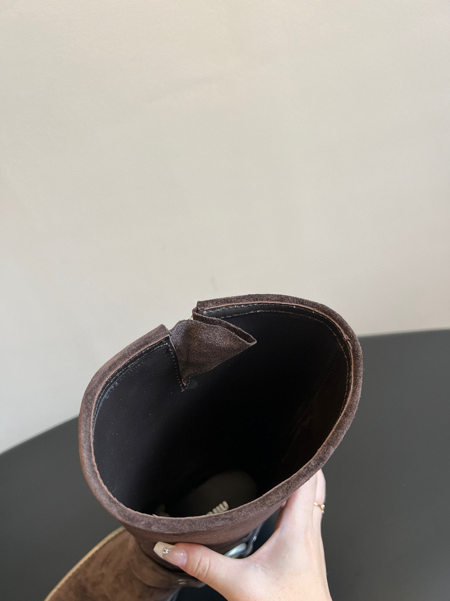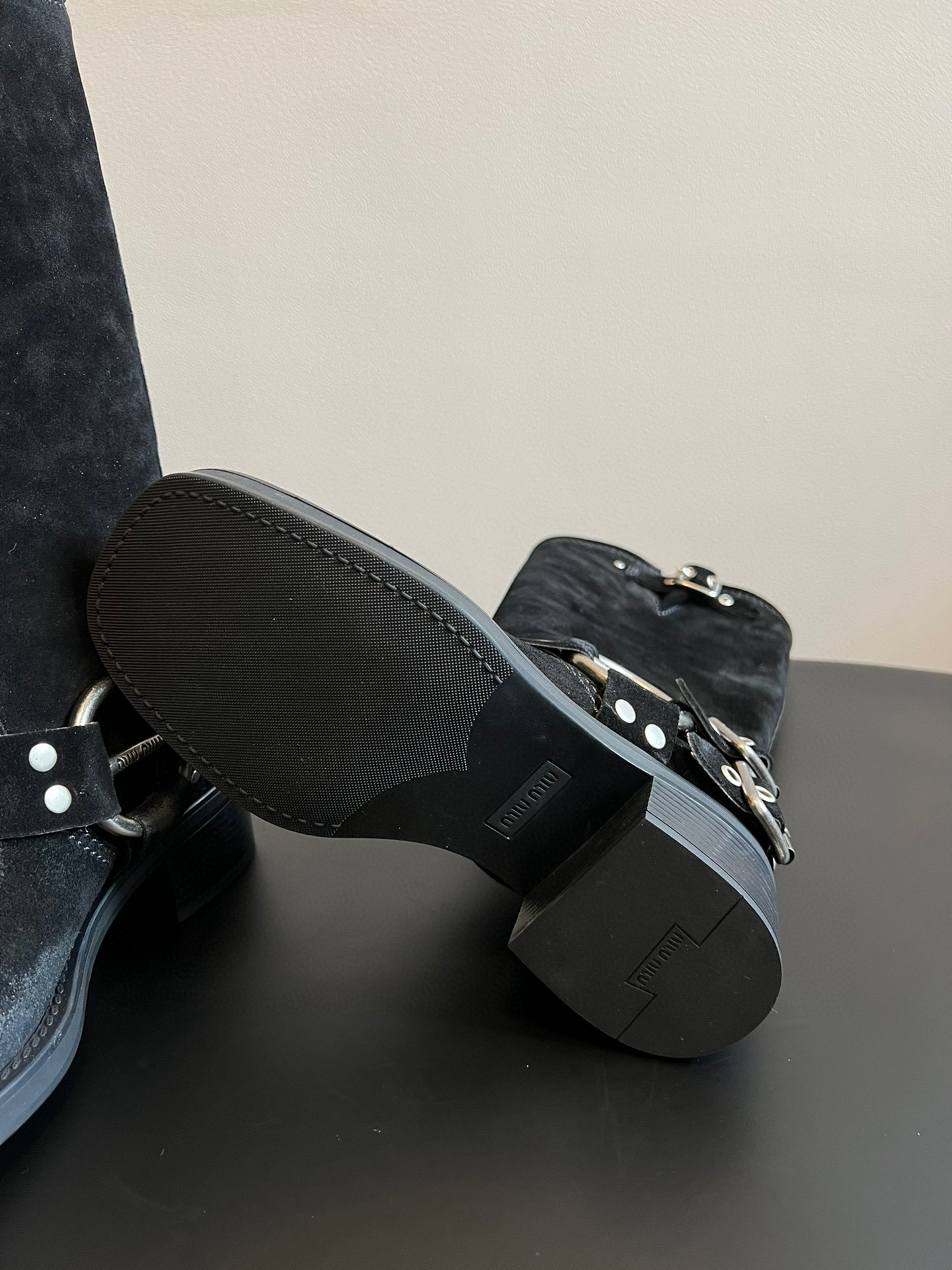 NIGO MiuMiu Women's Fall And Winter Two-Tone Cowhide/Suede Two-Buckle Nodel Mid-Calf Boots Shoes #nigo97265