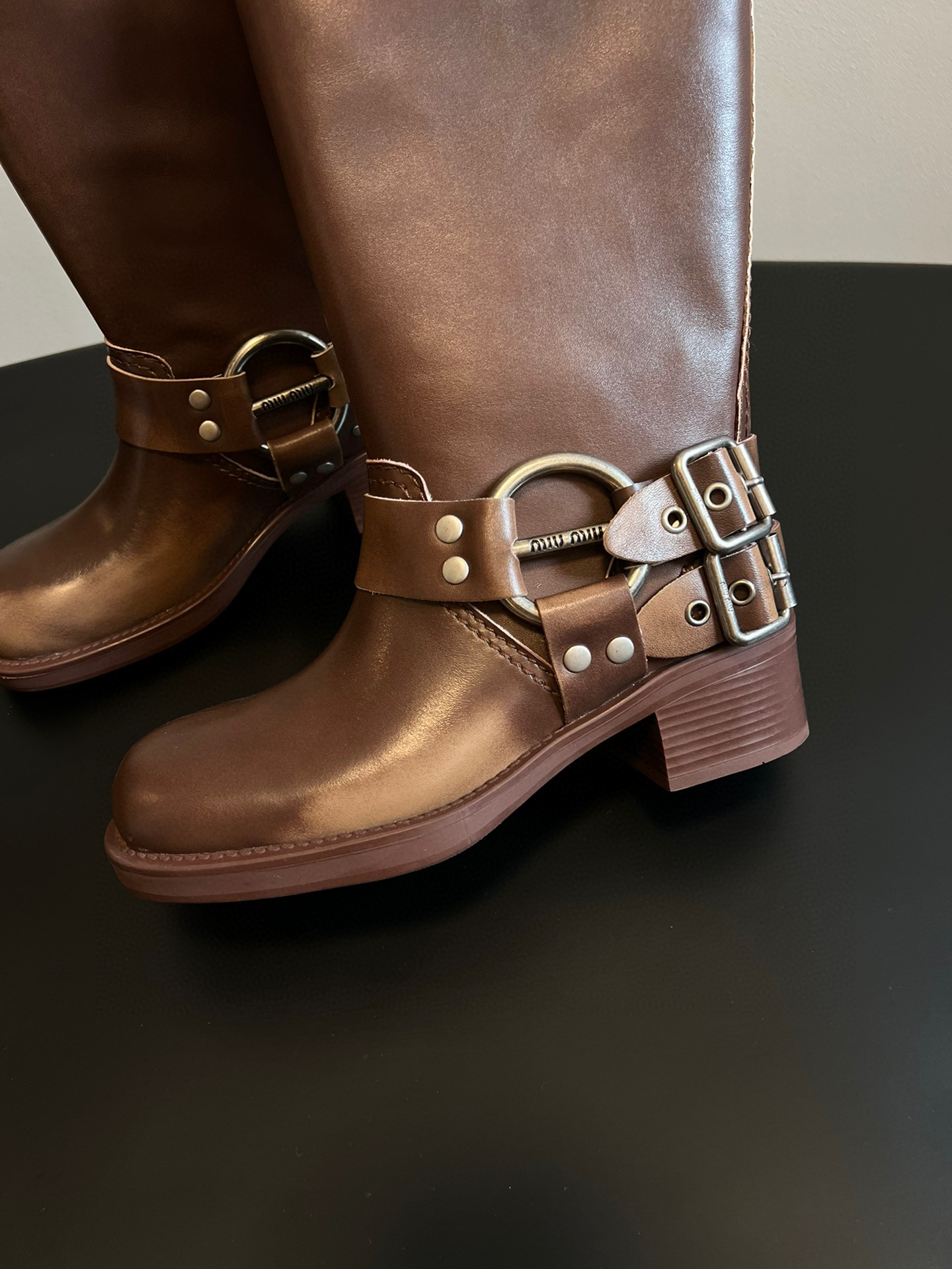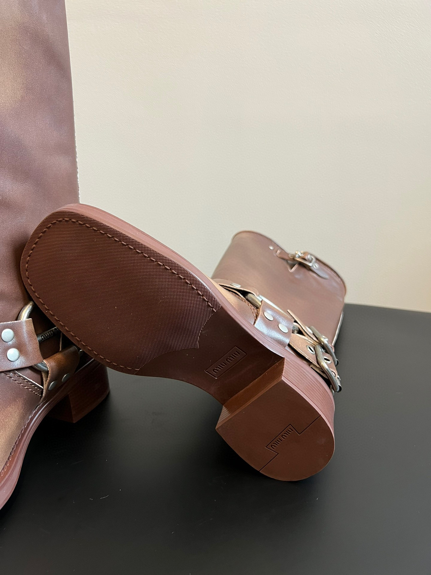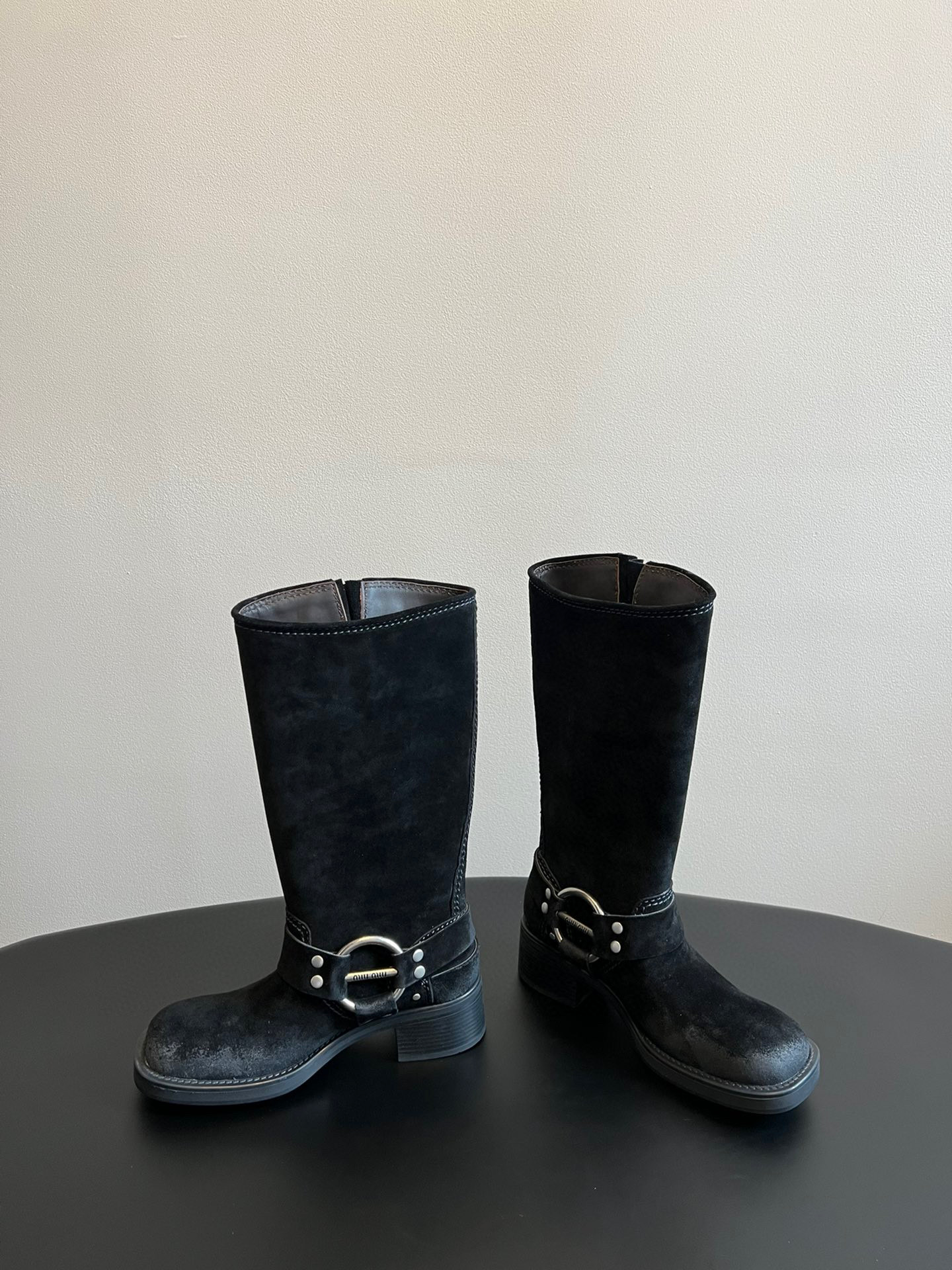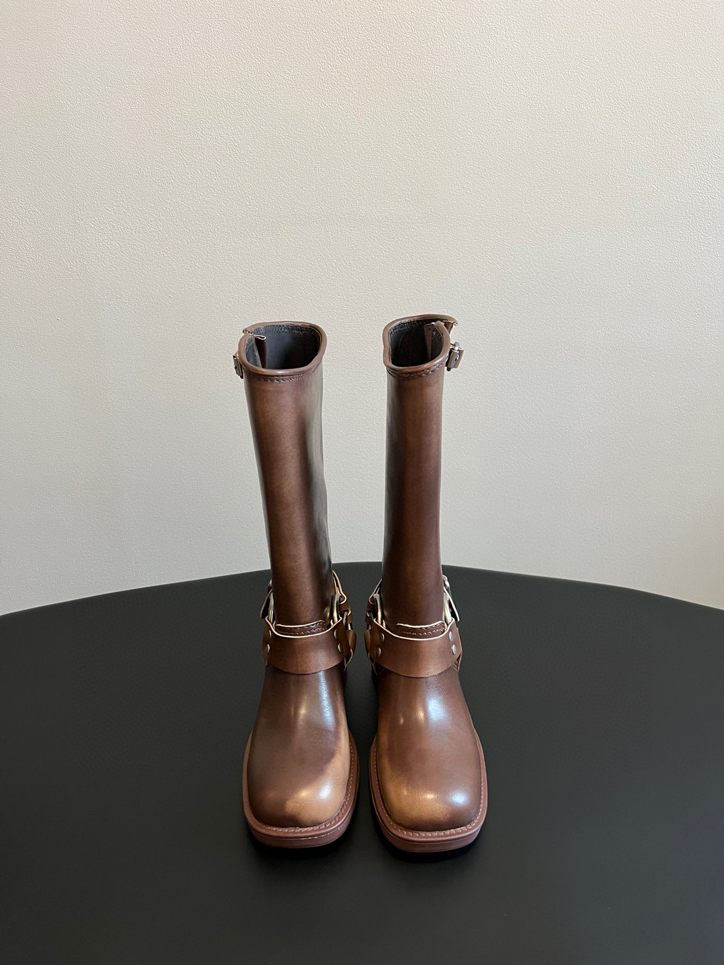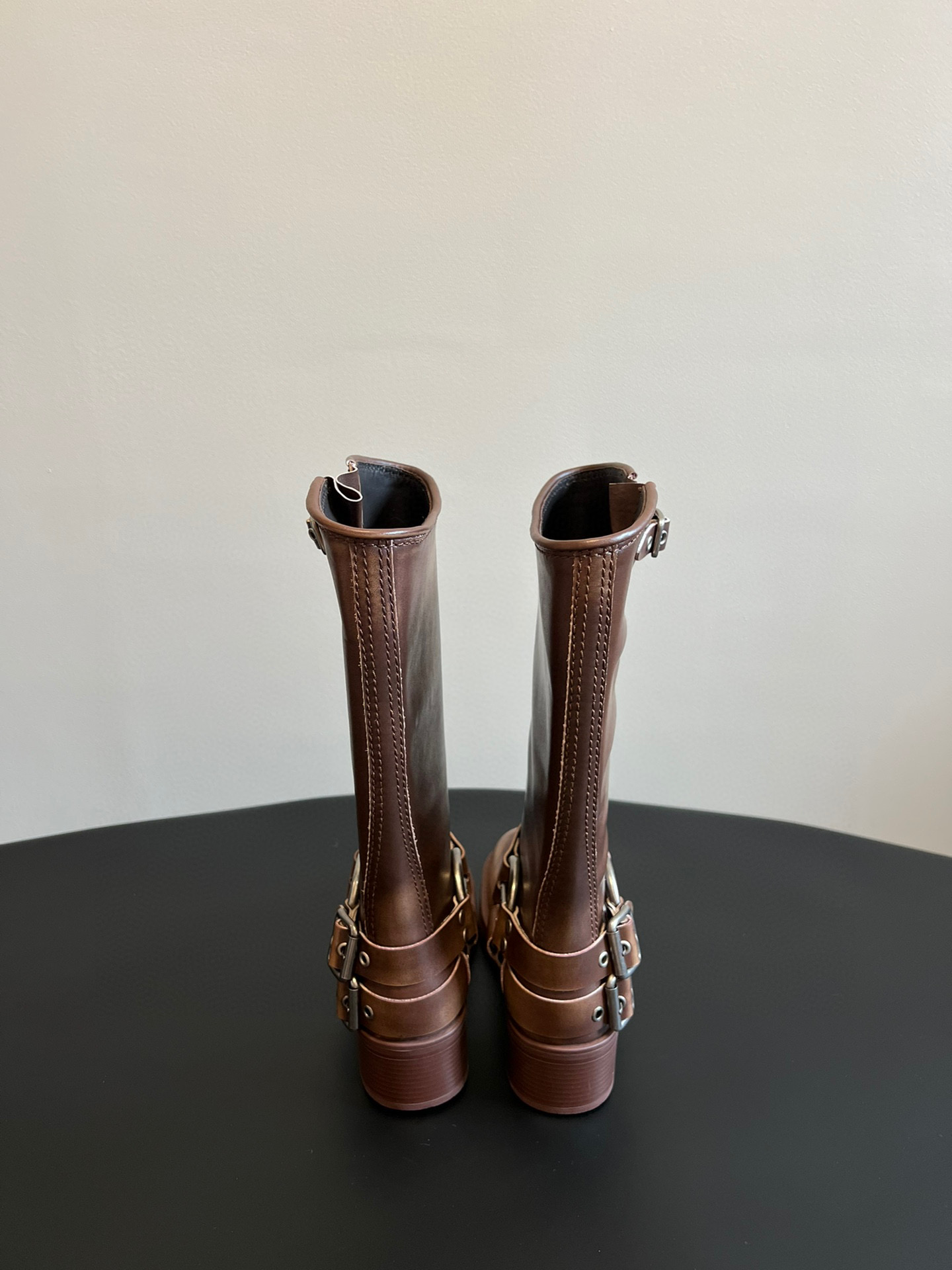 NIGO MiuMiu Women's Fall And Winter Two-Tone Cowhide/Suede Two-Buckle Nodel Mid-Calf Boots Shoes #nigo97265