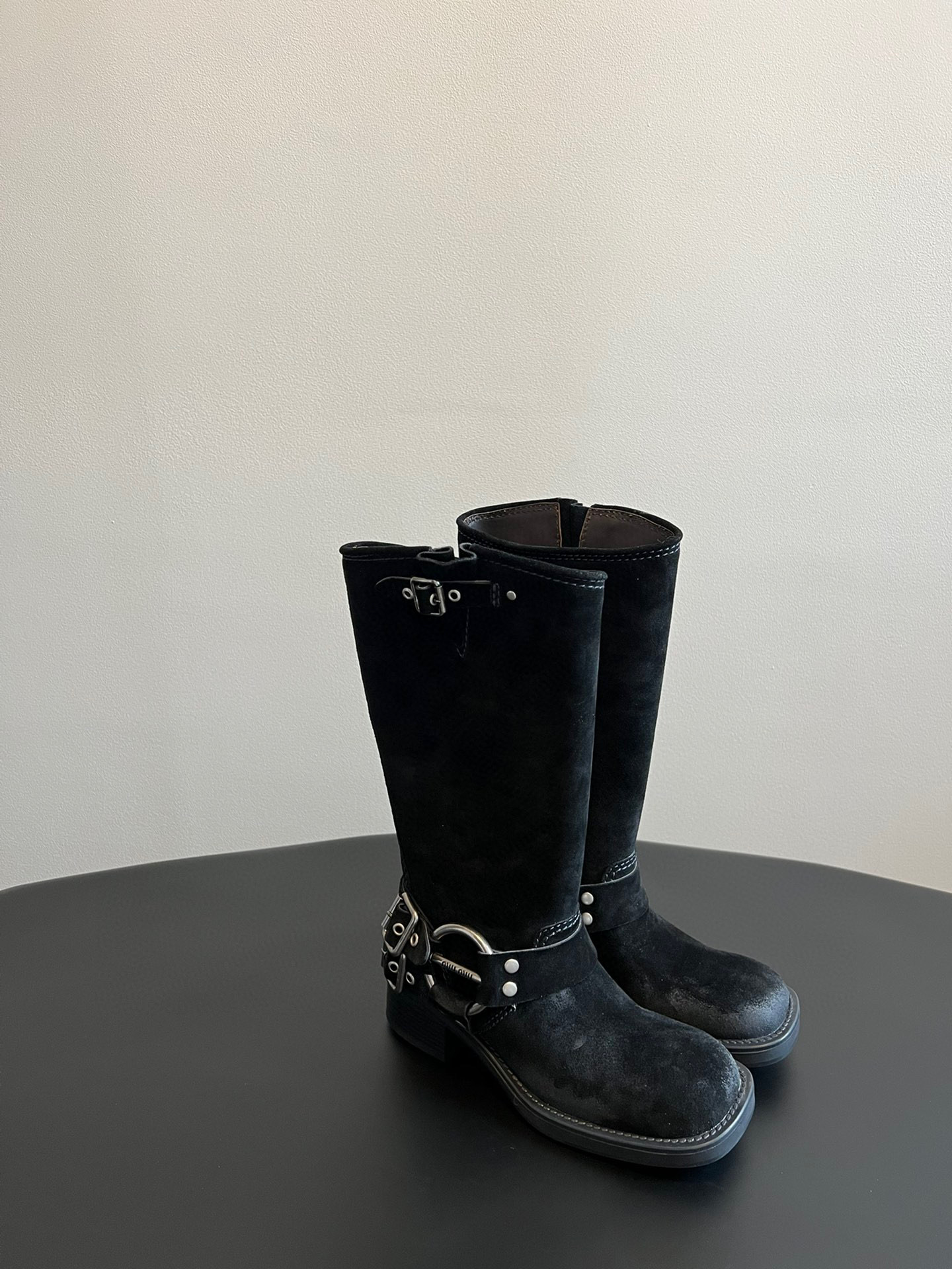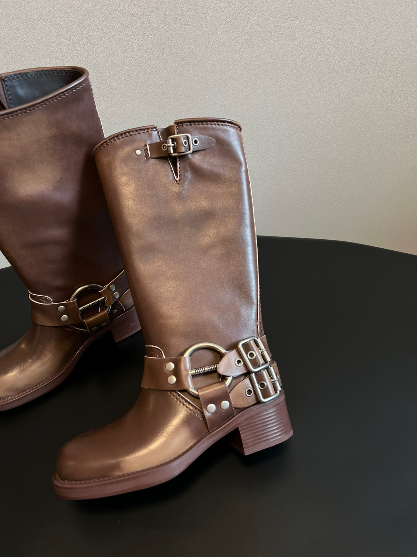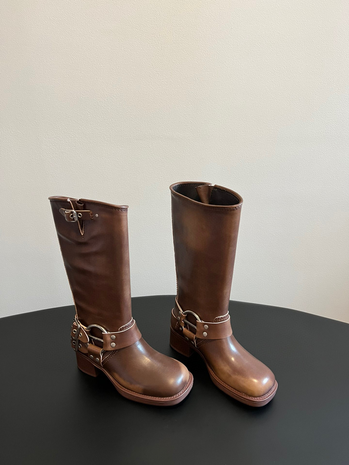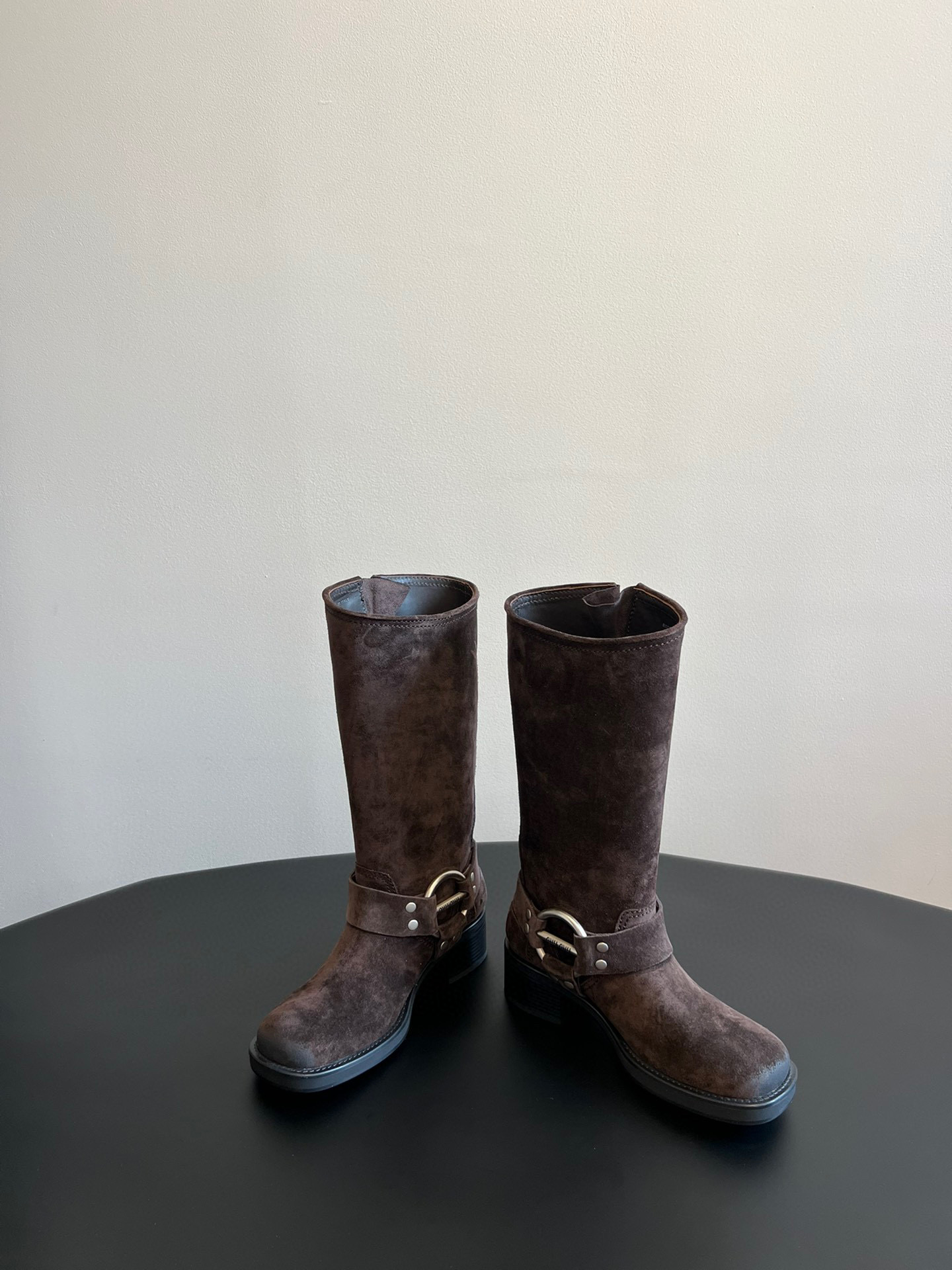 NIGO MiuMiu Women's Fall And Winter Two-Tone Cowhide/Suede Two-Buckle Nodel Mid-Calf Boots Shoes #nigo97265