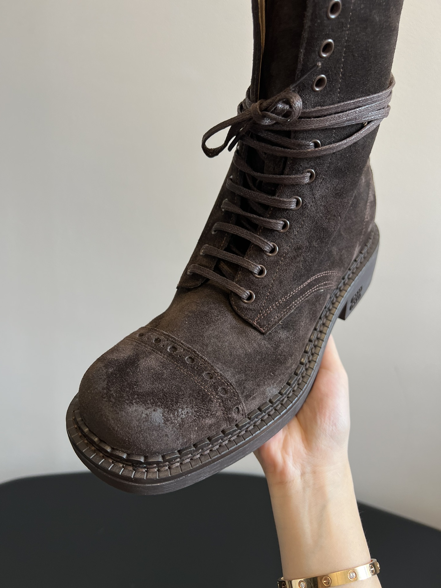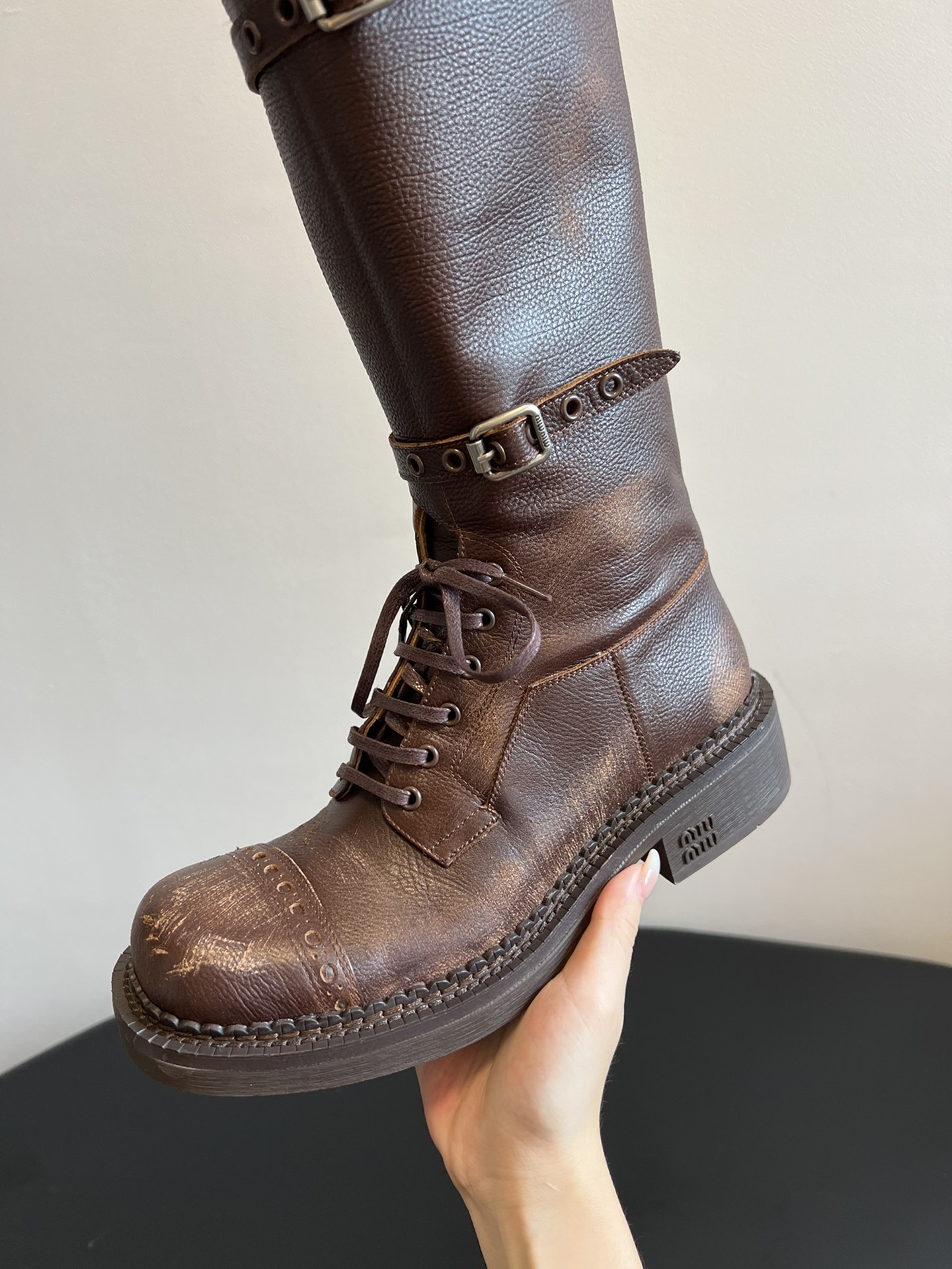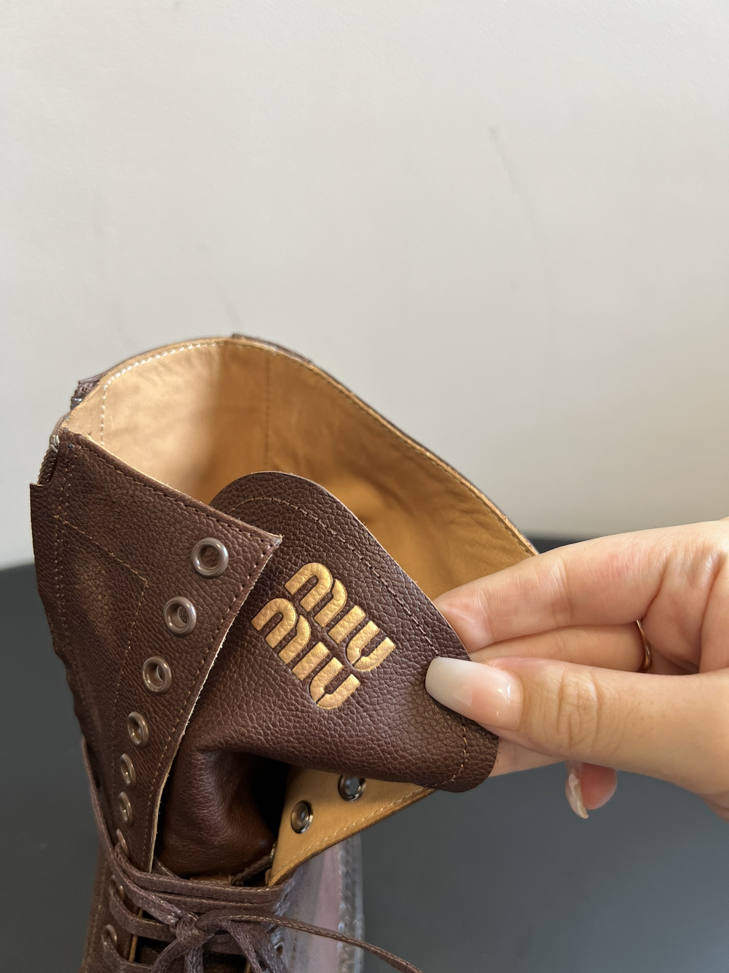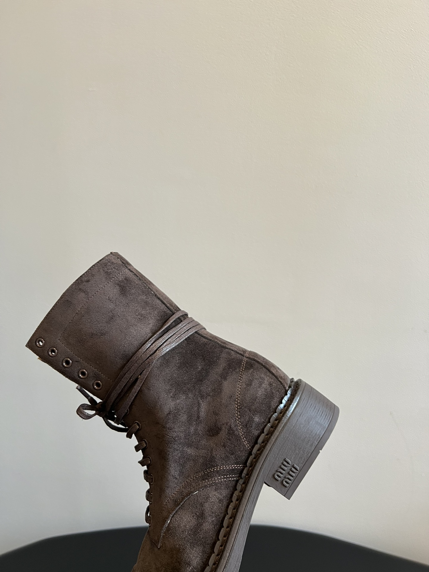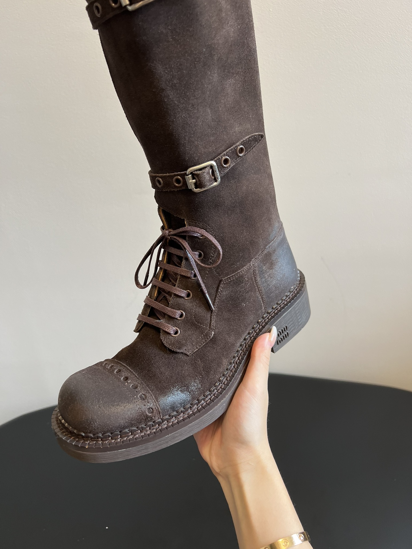 NIGO MiuMiu Women's Four Seasons Biker Style Retro Leather Buckle Boots Lace-up Cowhide Boots Casual Shoes Short Boots Suede High Shoes Ngvp #nigo9154