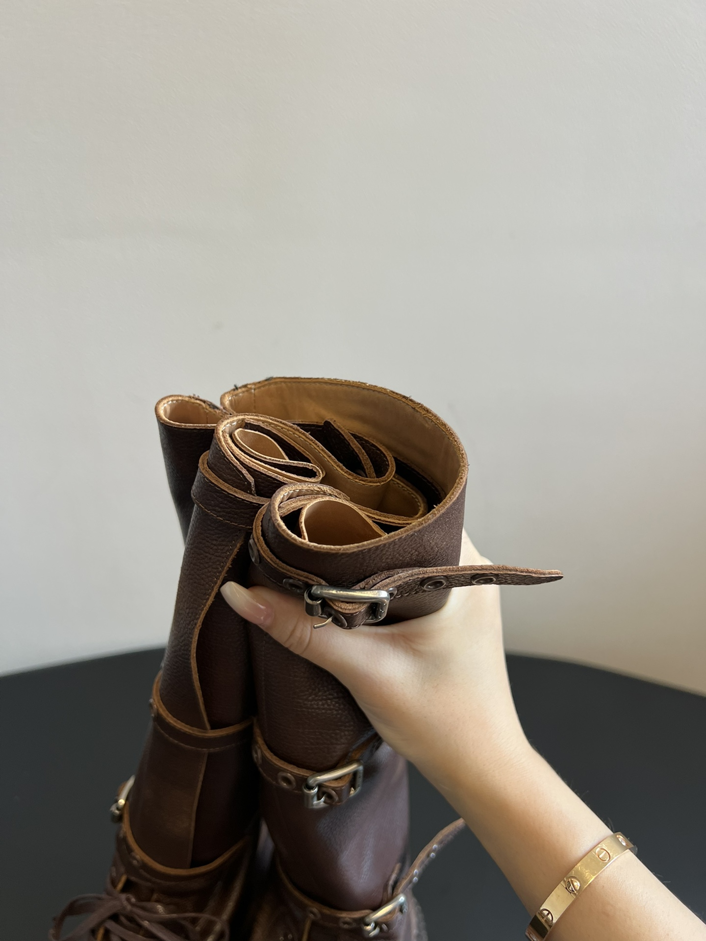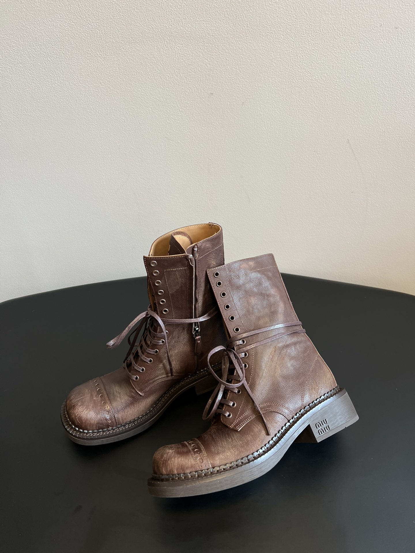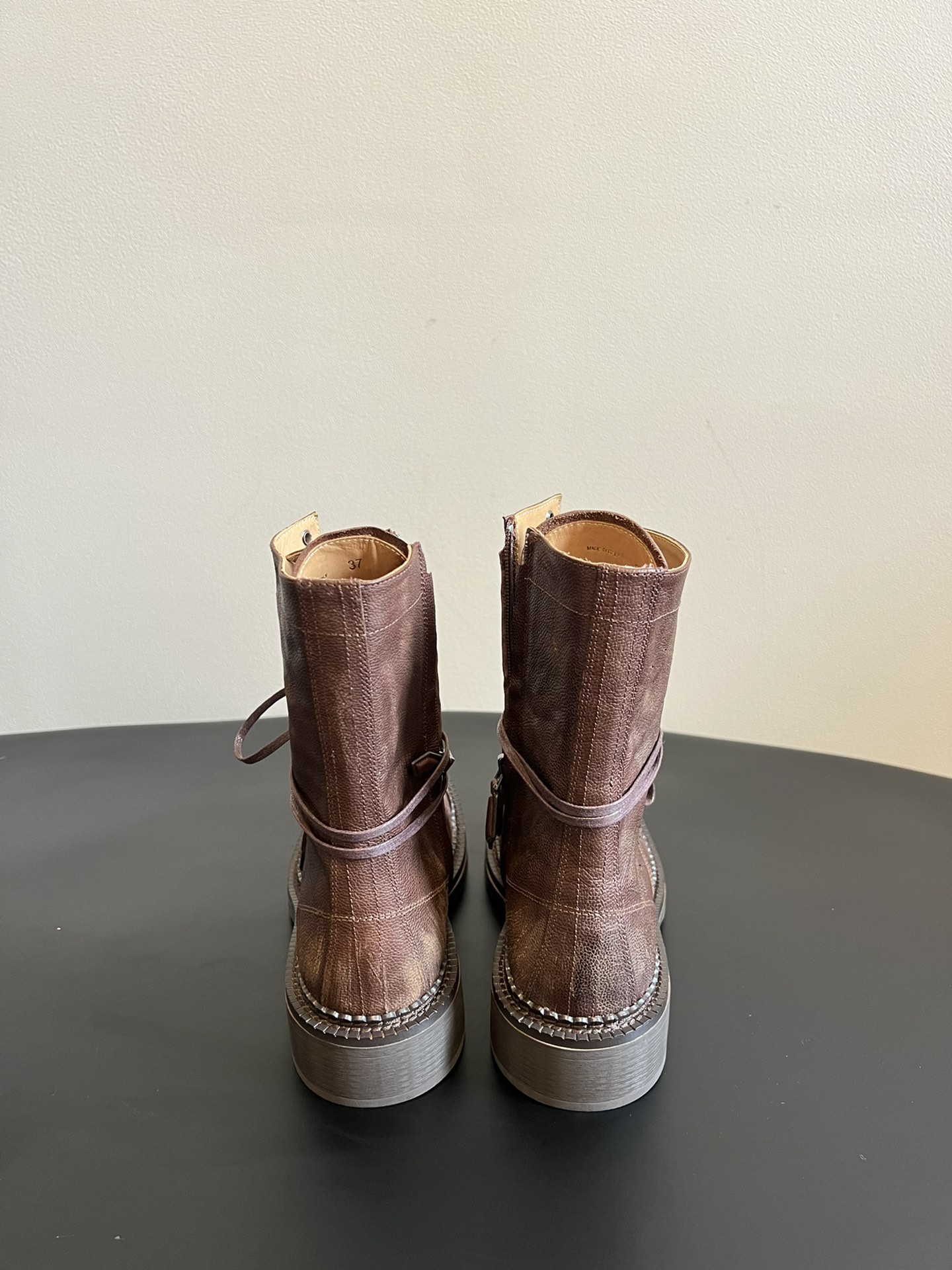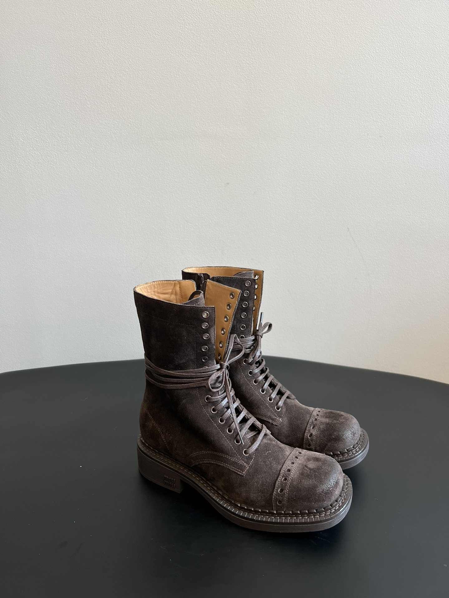 NIGO MiuMiu Women's Four Seasons Biker Style Retro Leather Buckle Boots Lace-up Cowhide Boots Casual Shoes Short Boots Suede High Shoes Ngvp #nigo9154