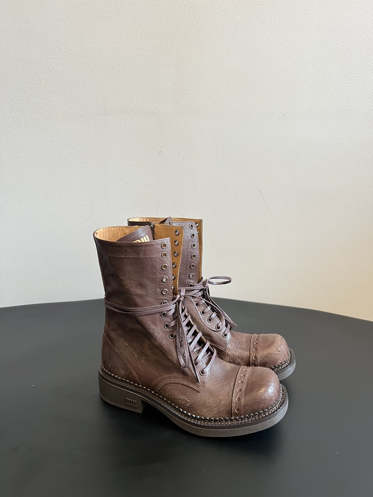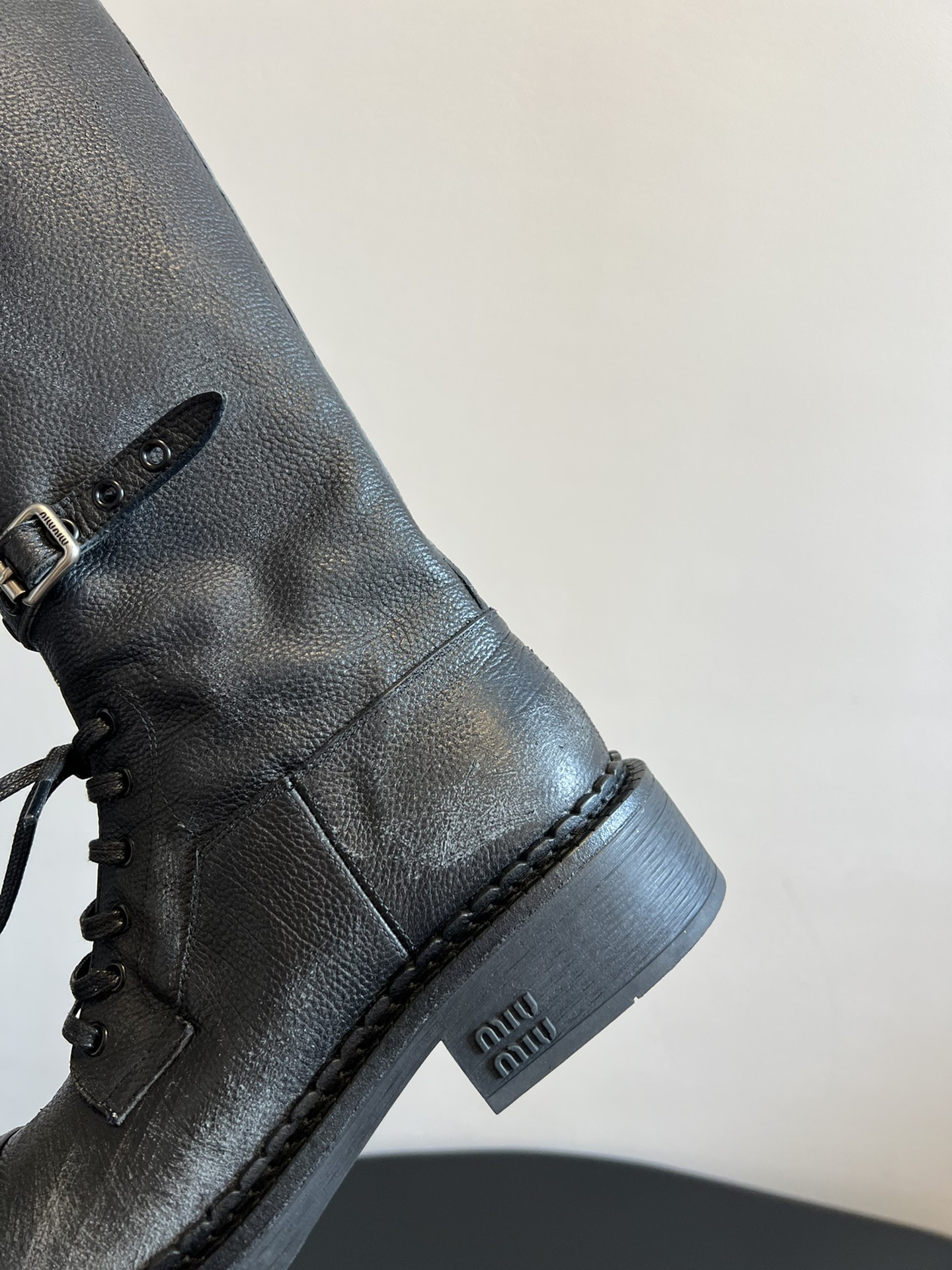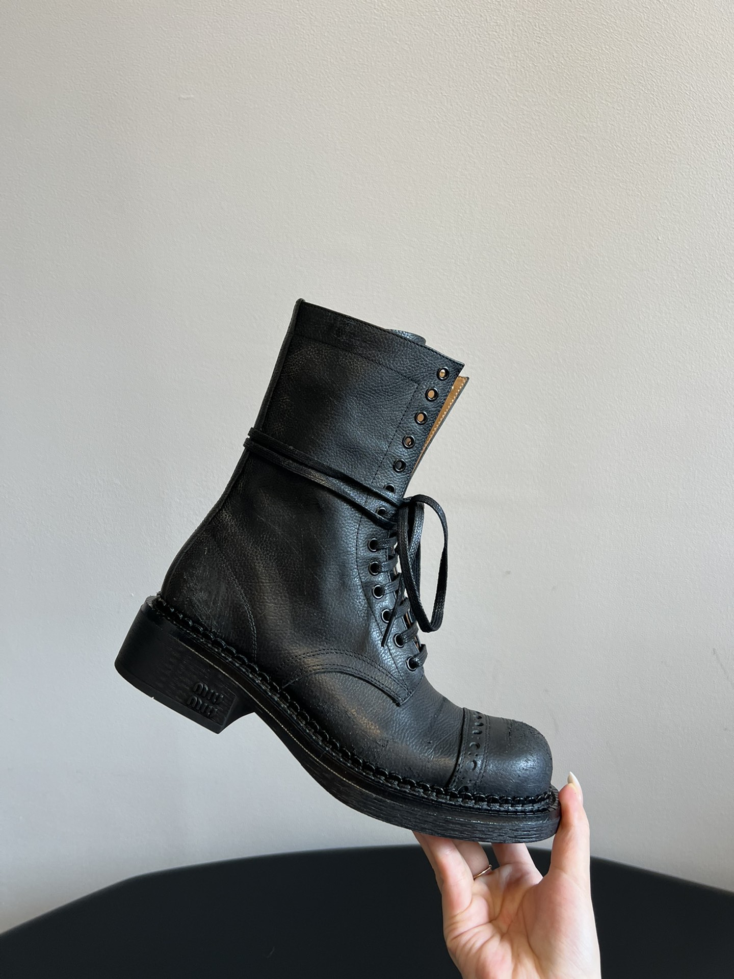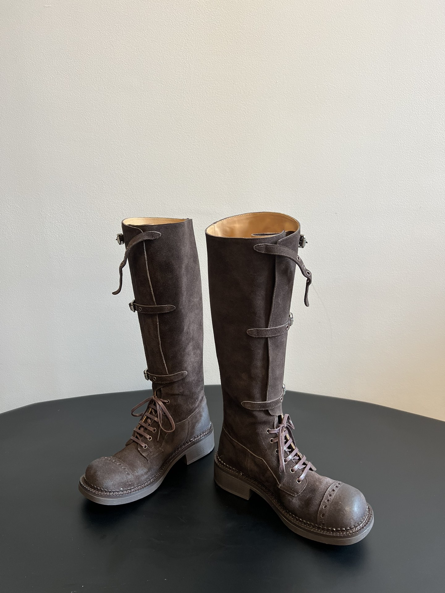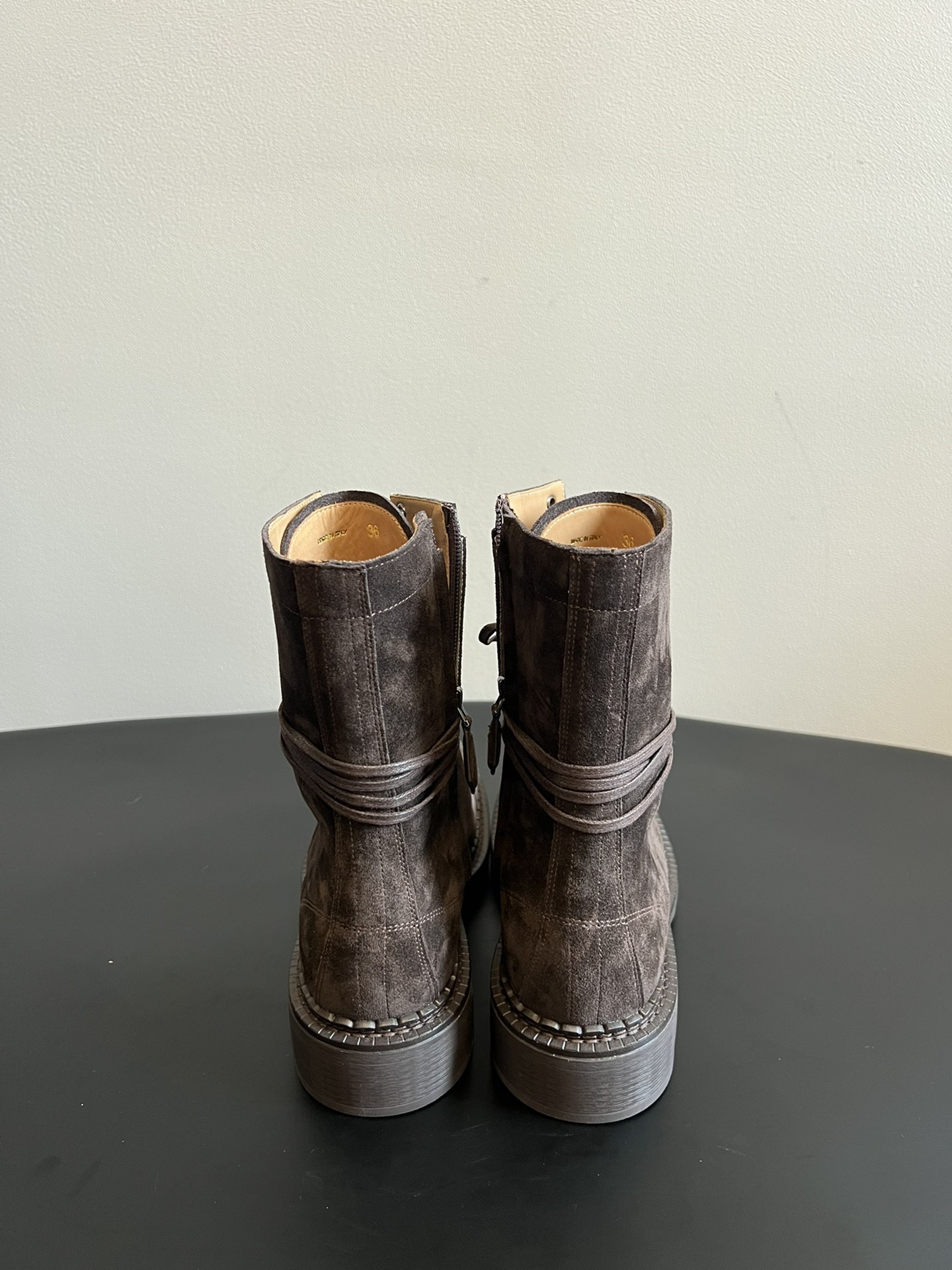 NIGO MiuMiu Women's Four Seasons Biker Style Retro Leather Buckle Boots Lace-up Cowhide Boots Casual Shoes Short Boots Suede High Shoes Ngvp #nigo9154