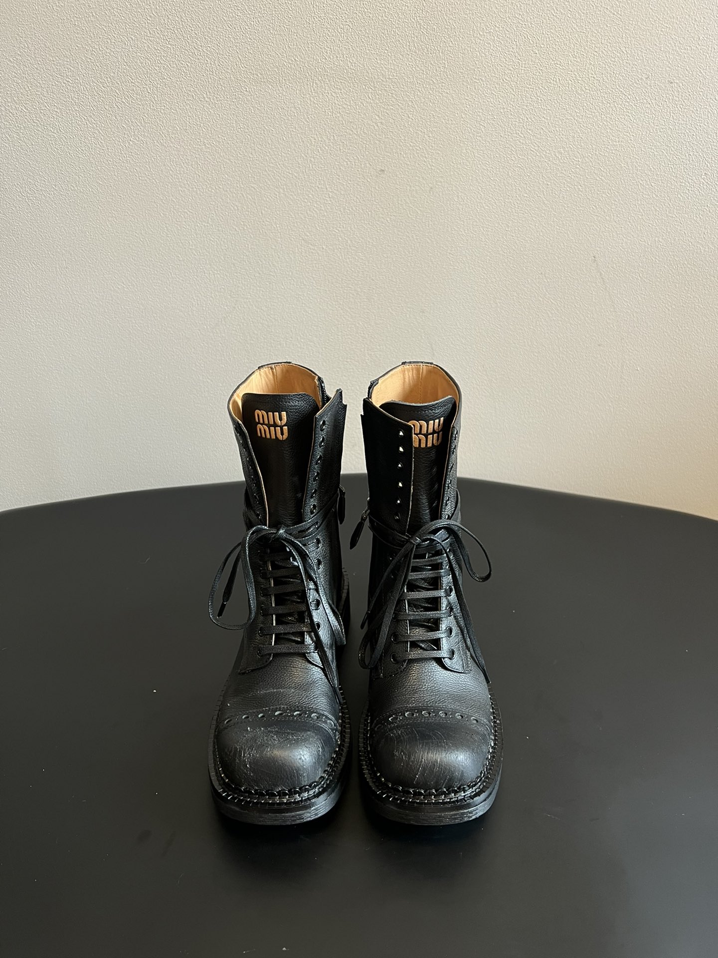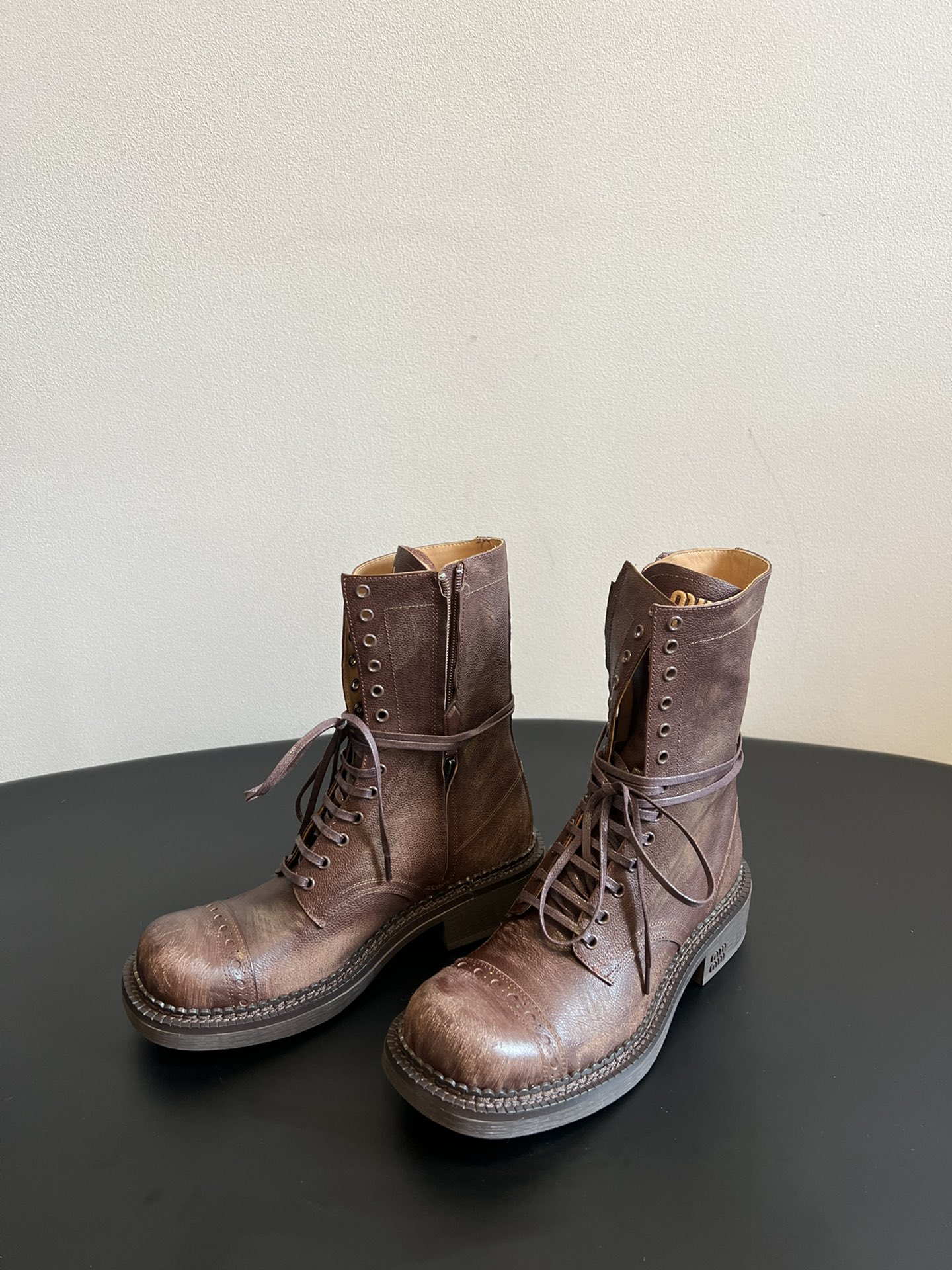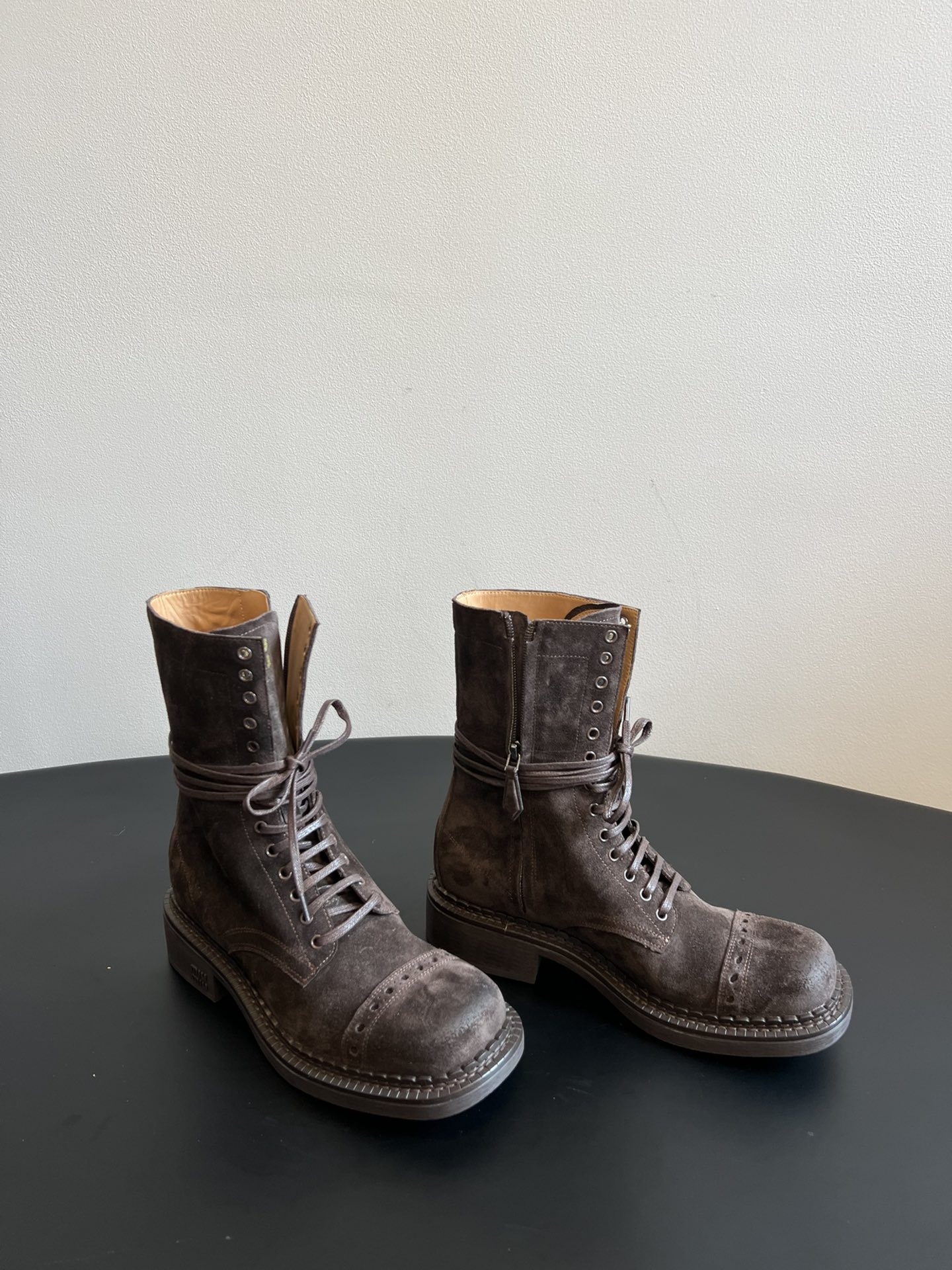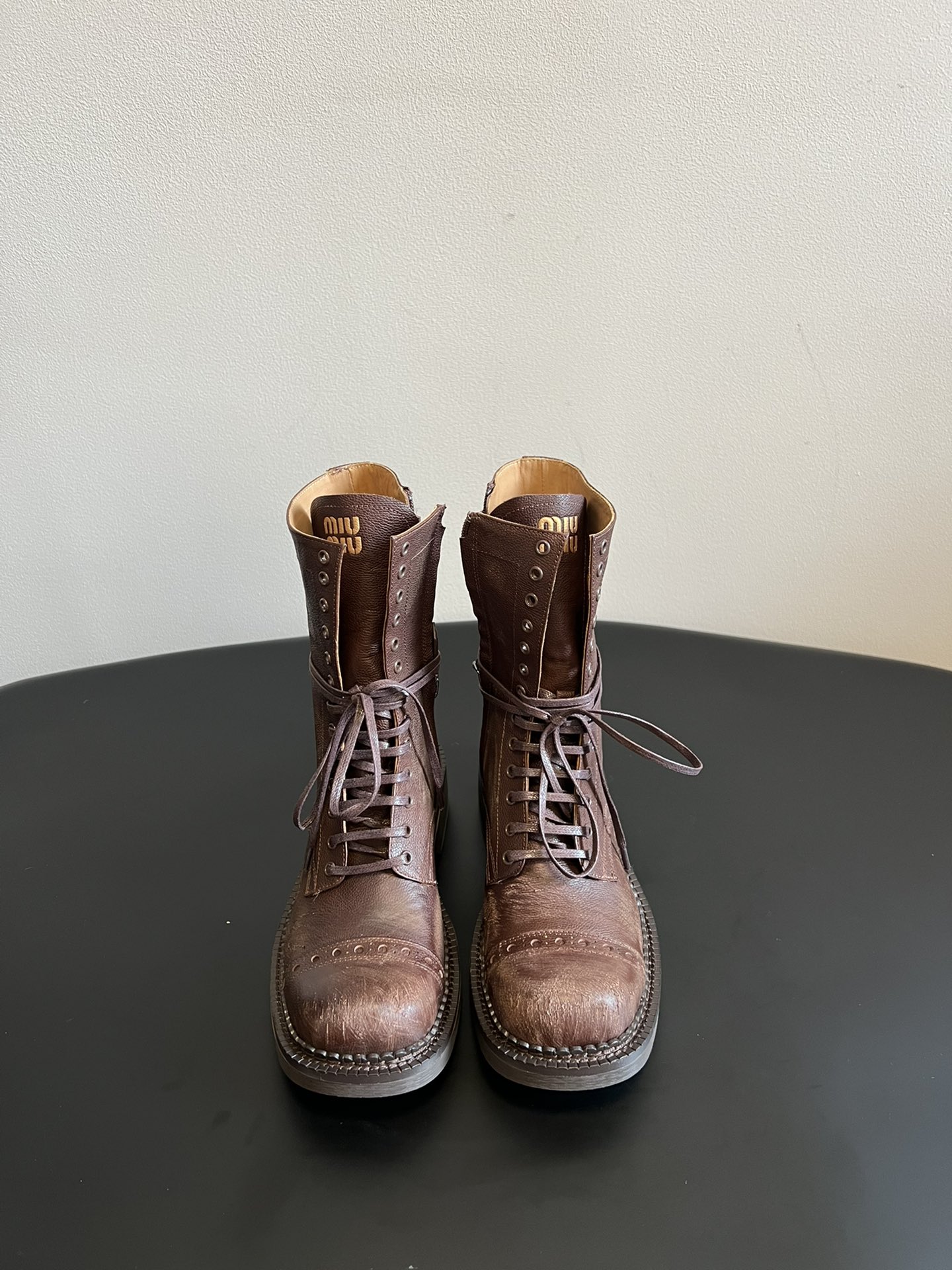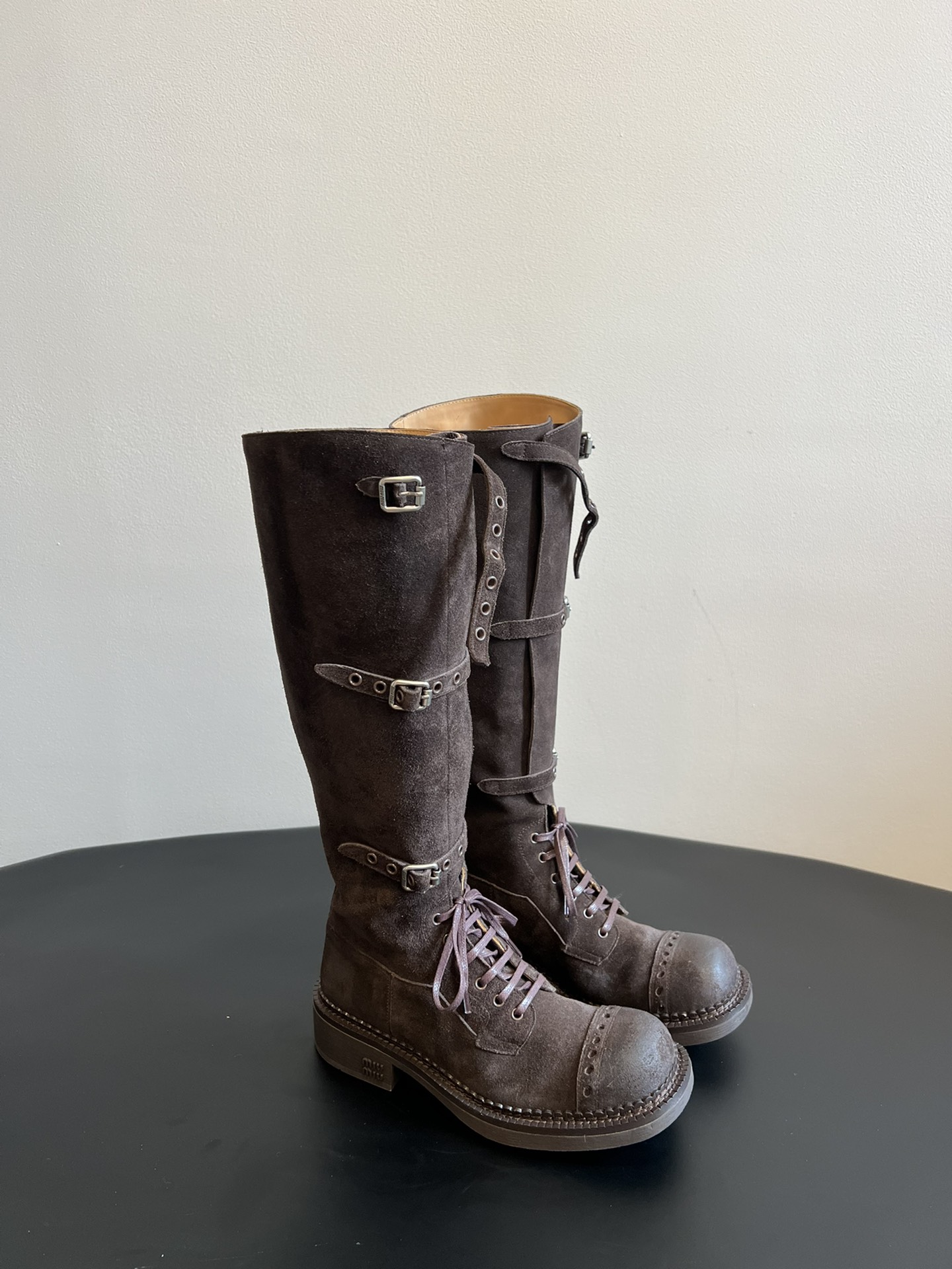 NIGO MiuMiu Women's Four Seasons Biker Style Retro Leather Buckle Boots Lace-up Cowhide Boots Casual Shoes Short Boots Suede High Shoes Ngvp #nigo9154