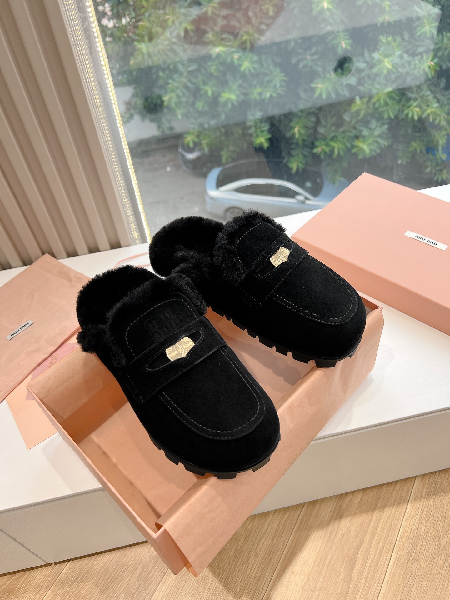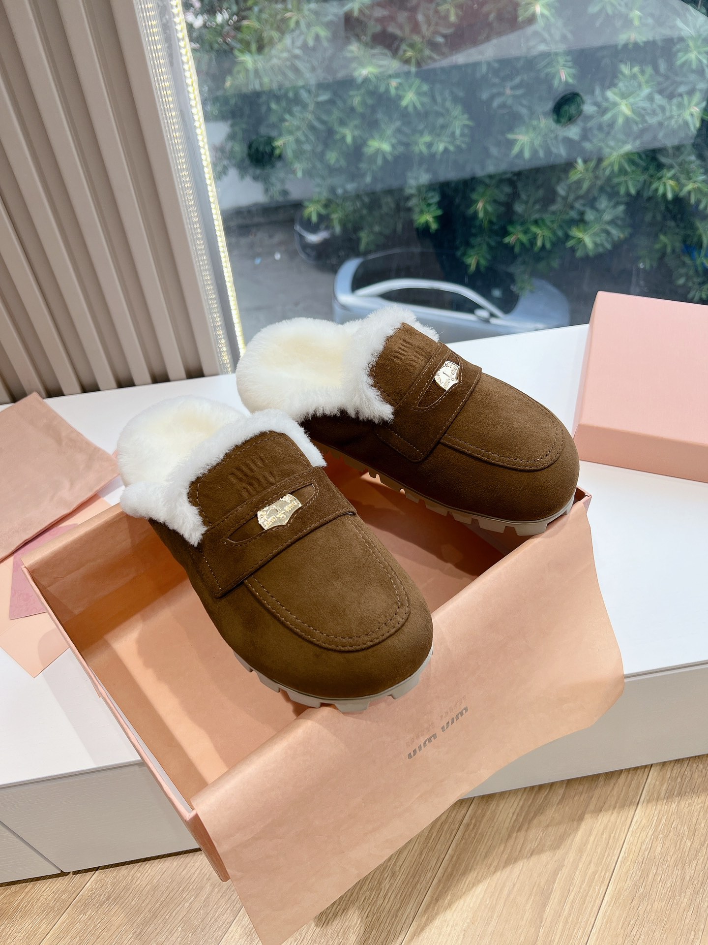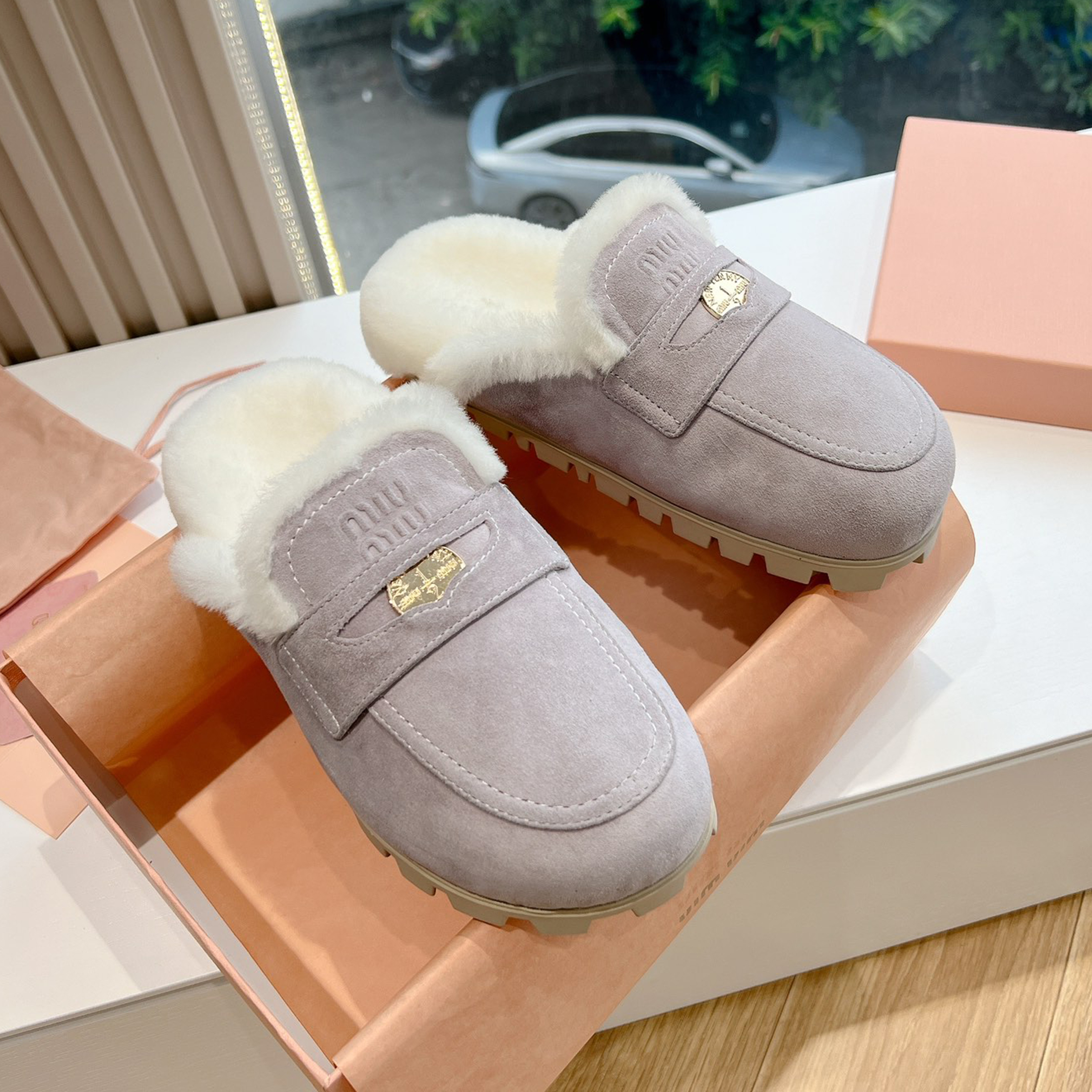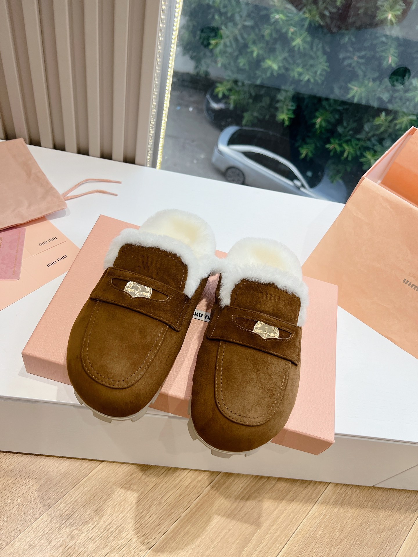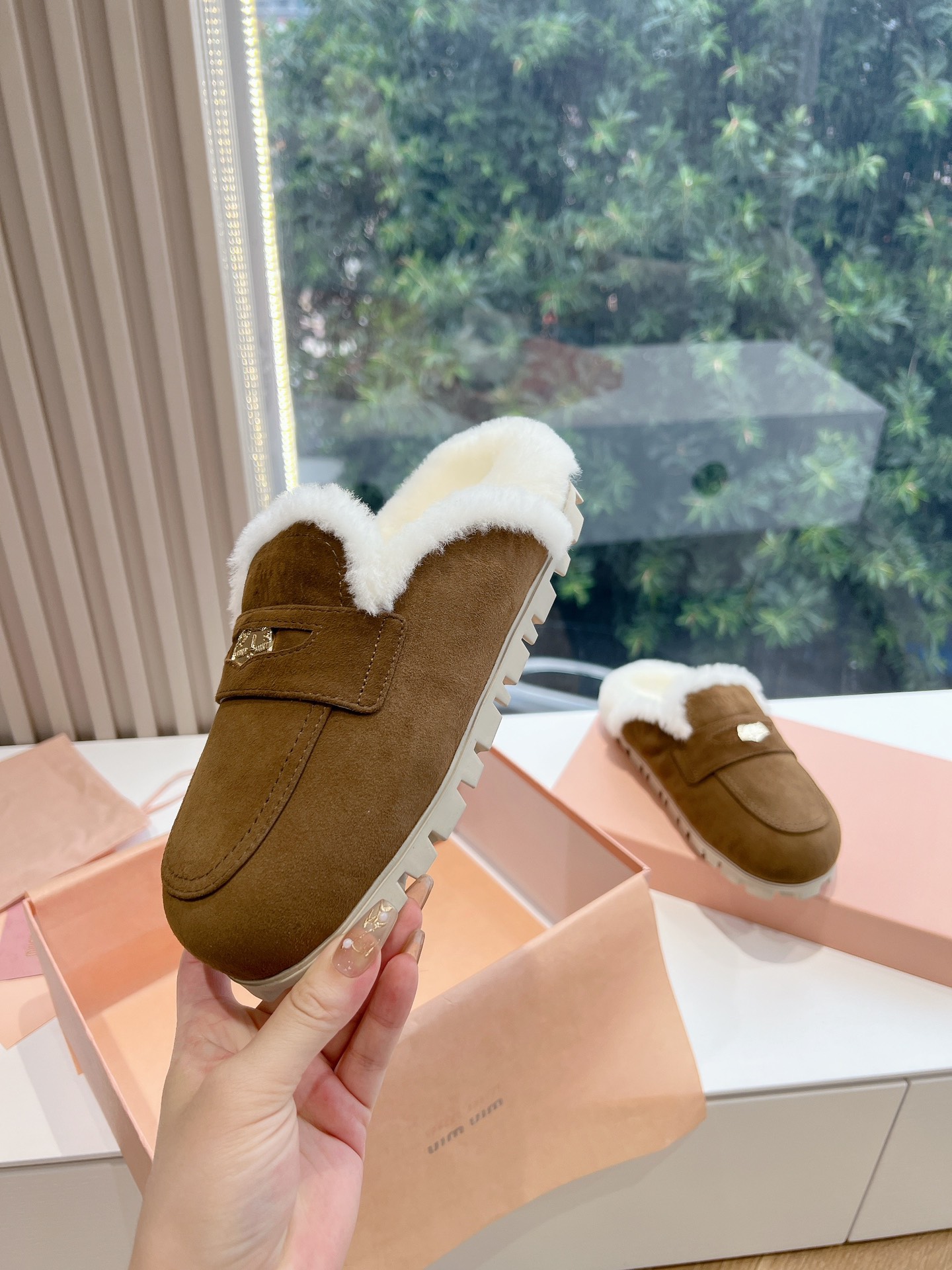 NIGO MiuMiu Women's Four Seasons Fashion Elegant Brown Hairy Slippers Outer Mule Shoes Temperament Trendy Casual Shoes #nigo71964