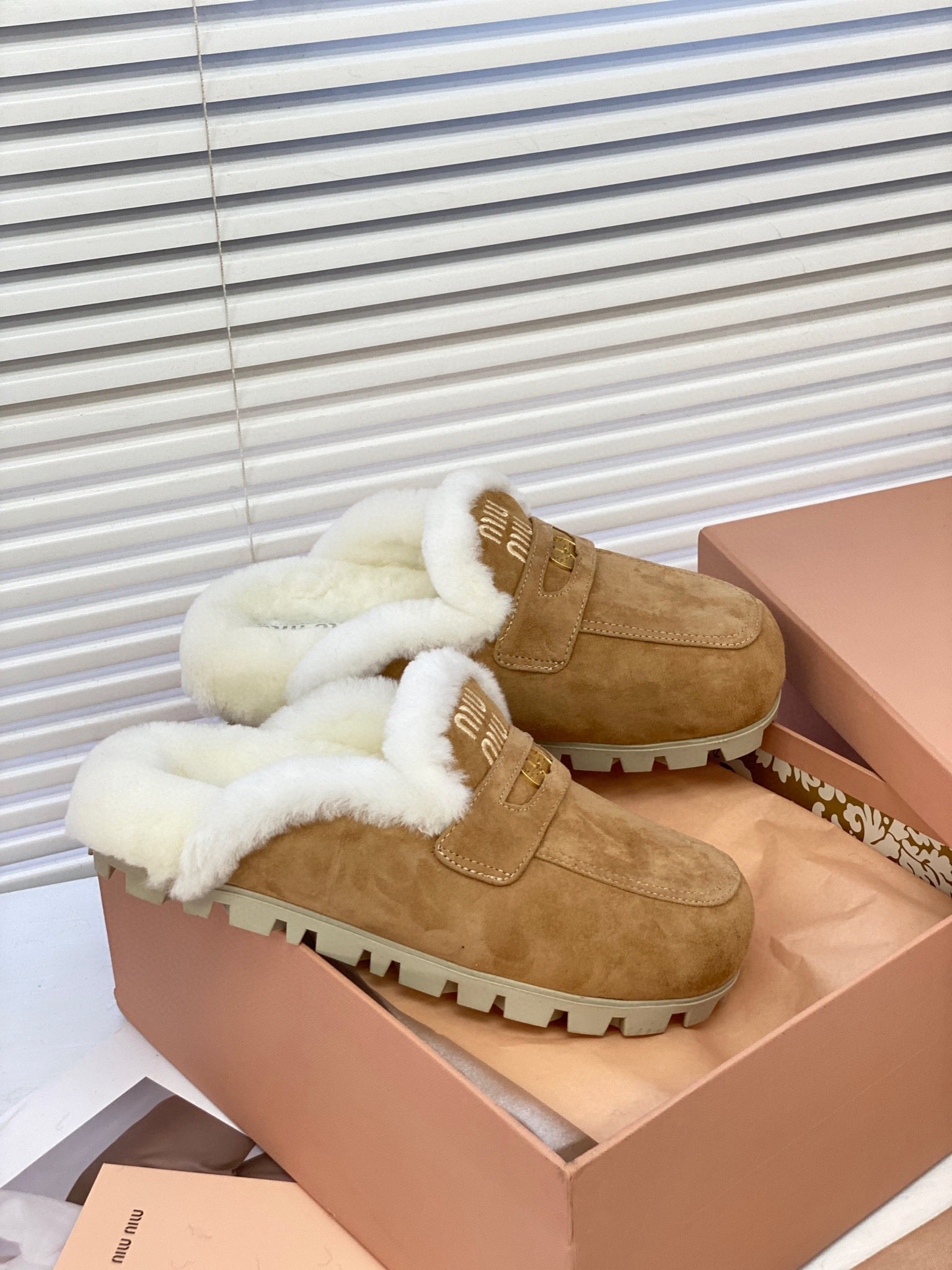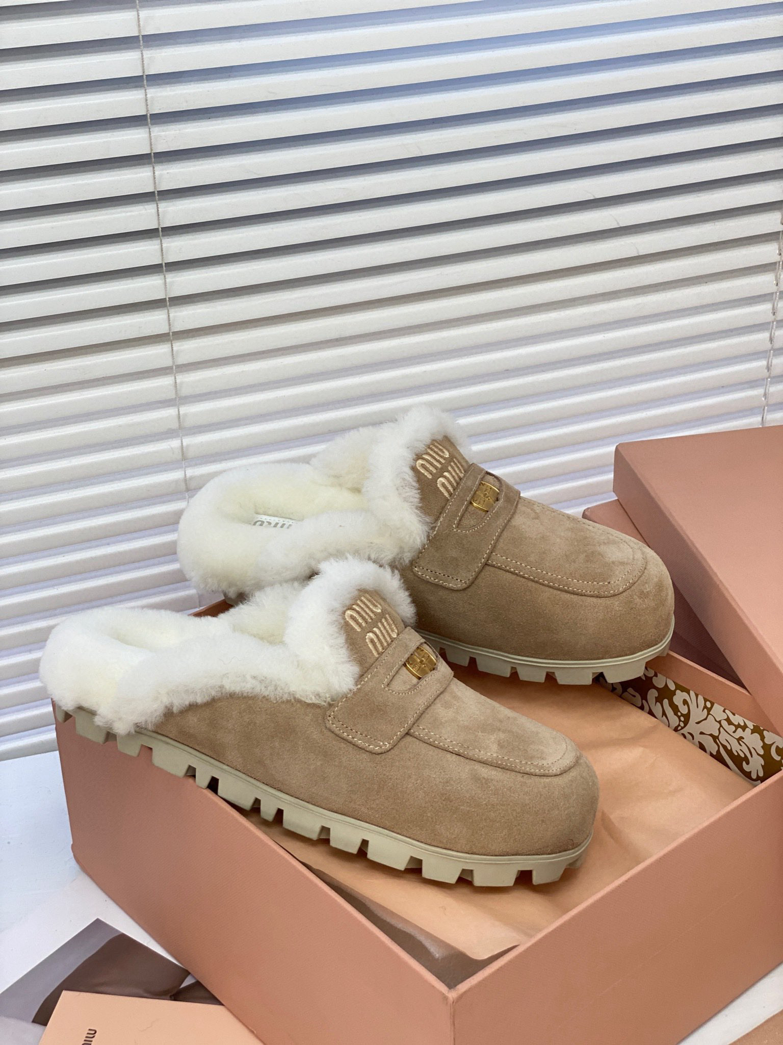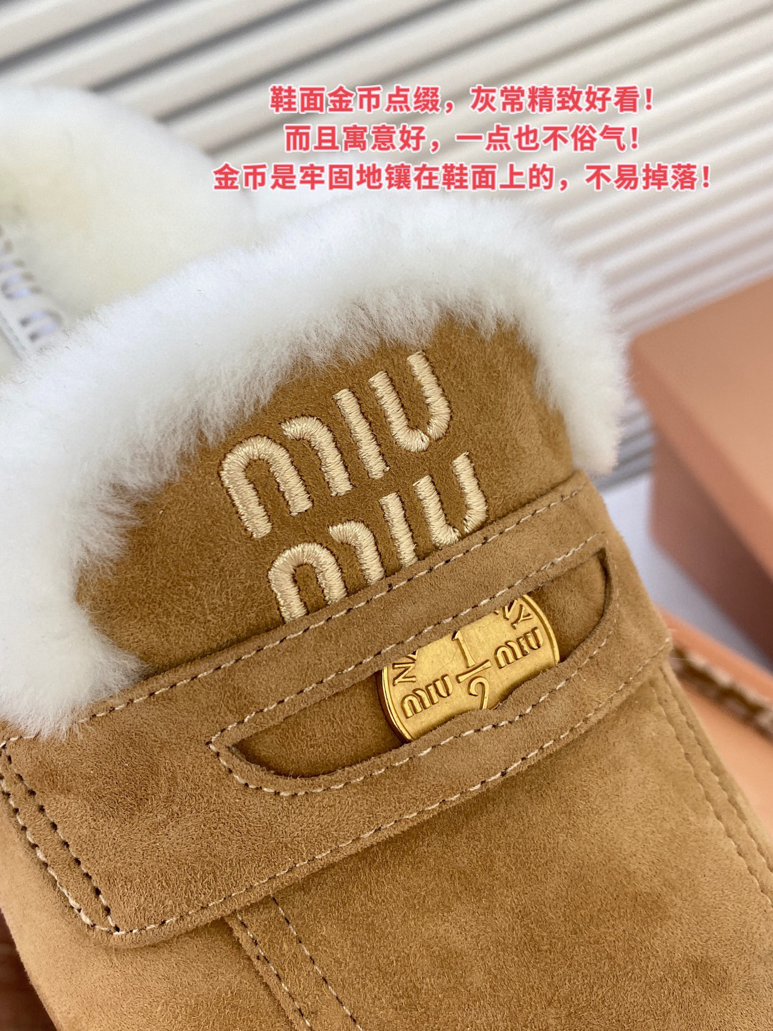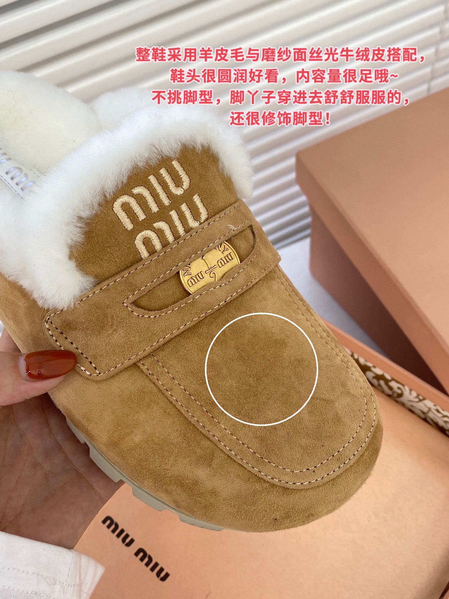 DetailMiu Miu new warm wool gold coin round toe thick bottom heightened comfortable and versatile Birkenstock Mueller half slippers.