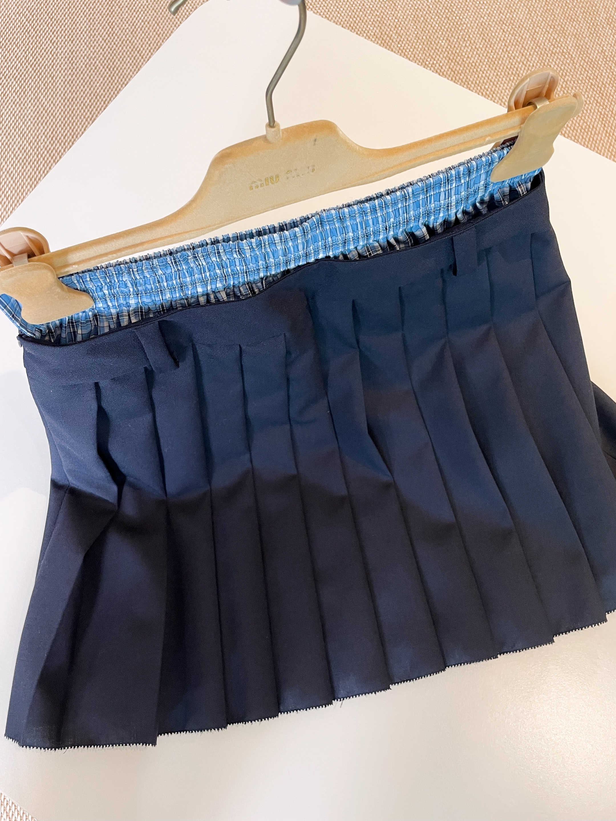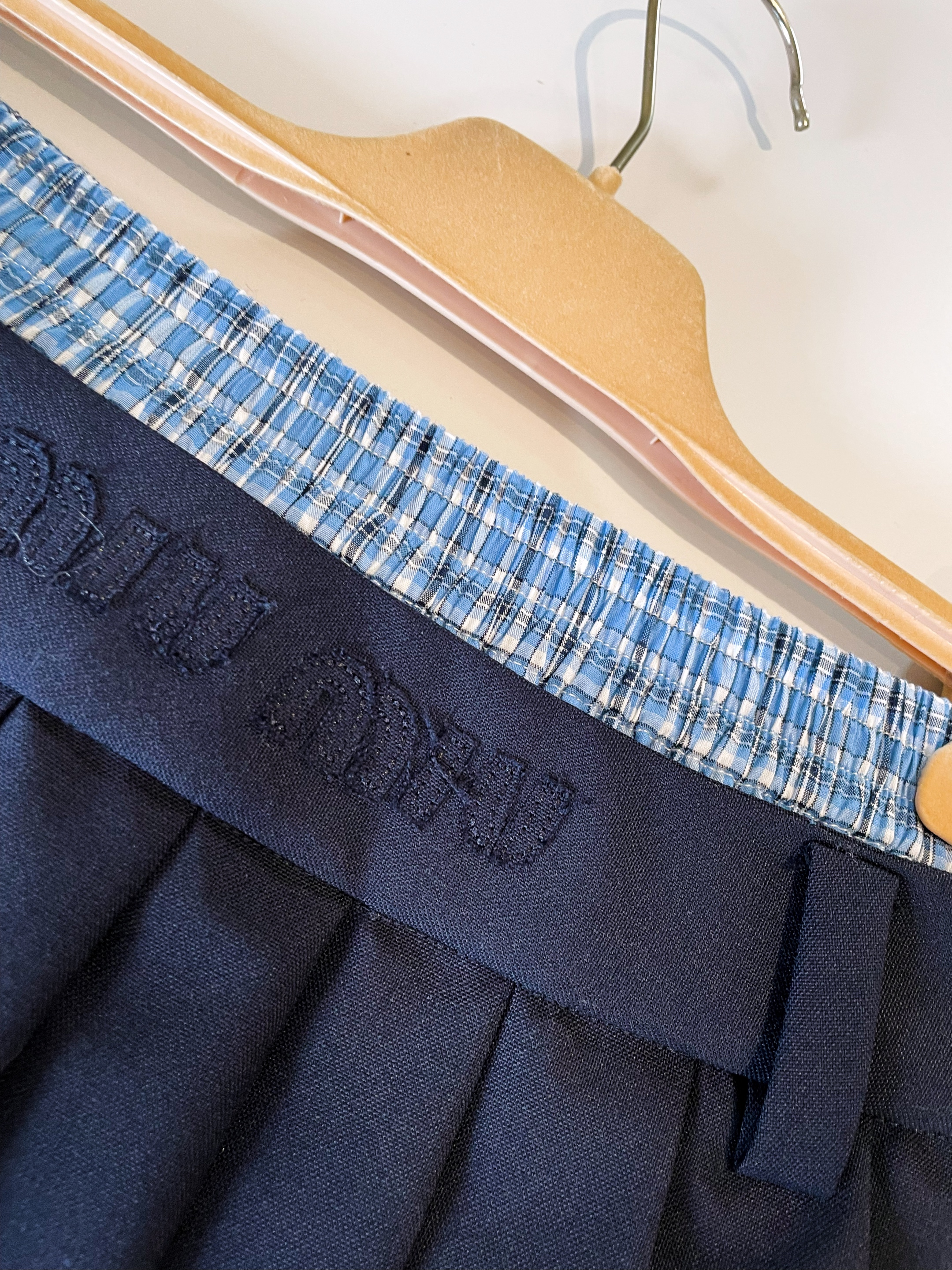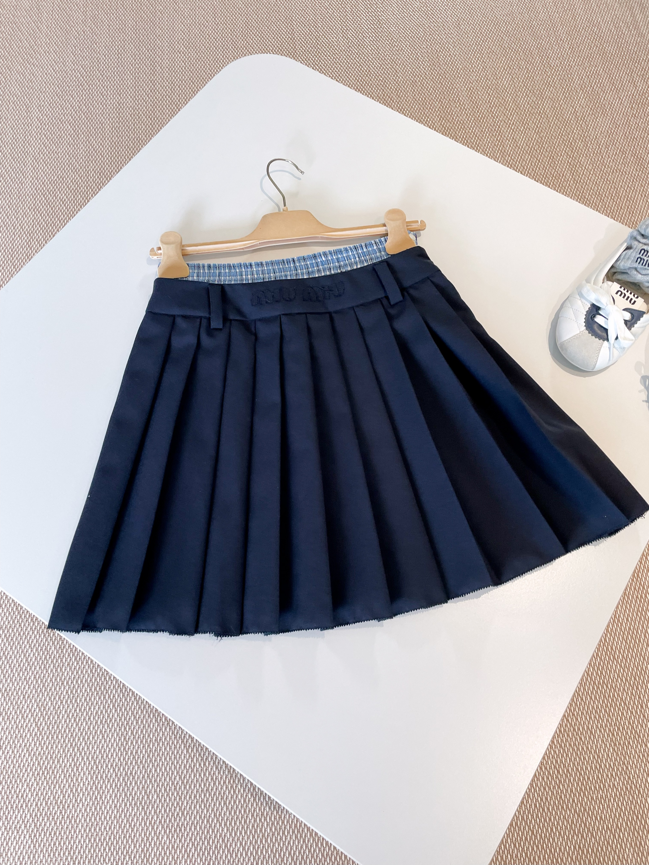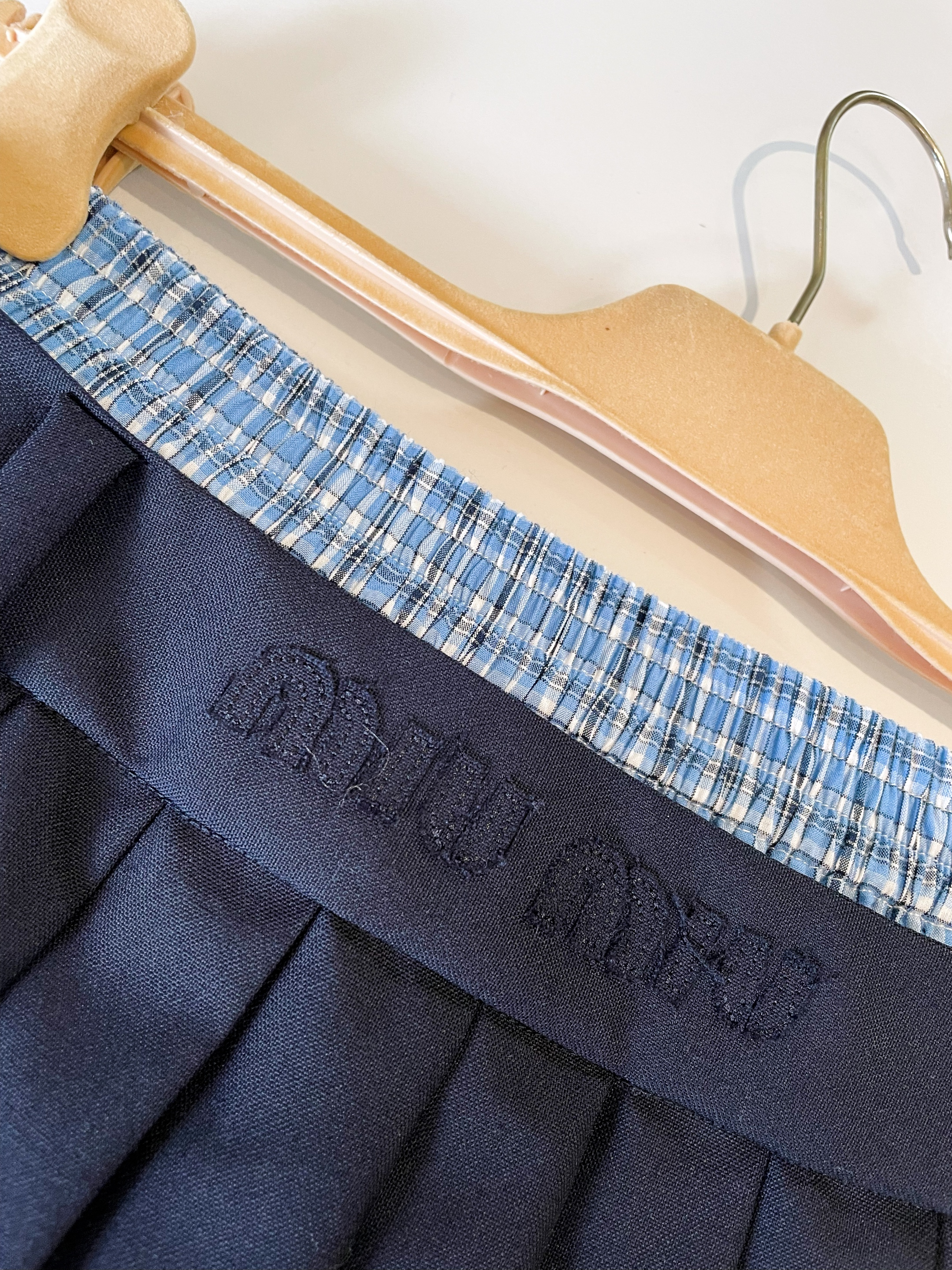 NIGO MiuMiu Women's Summer Classic Deep Blue Pleated Skirt - Academy Style Short Dress with Checkerboard Waistband & Delicate Ruffles #nigo75715
