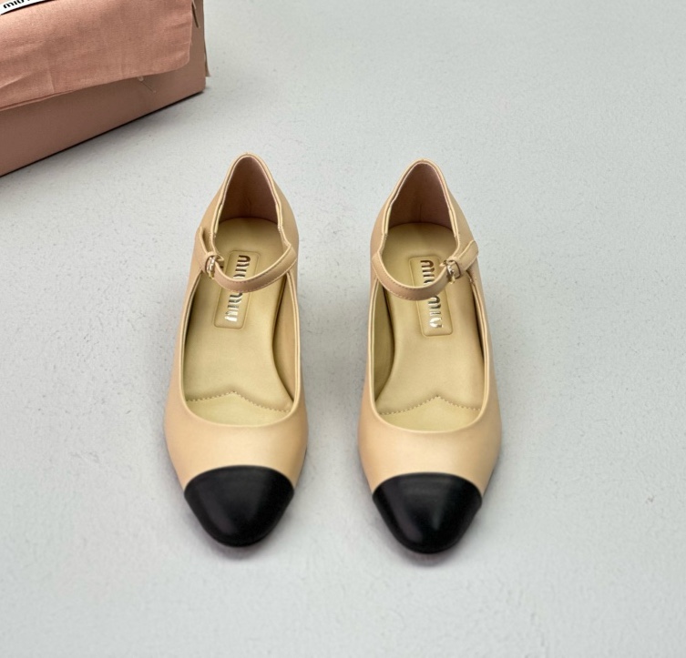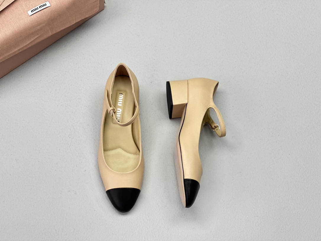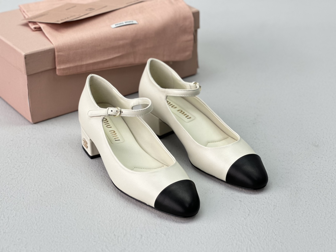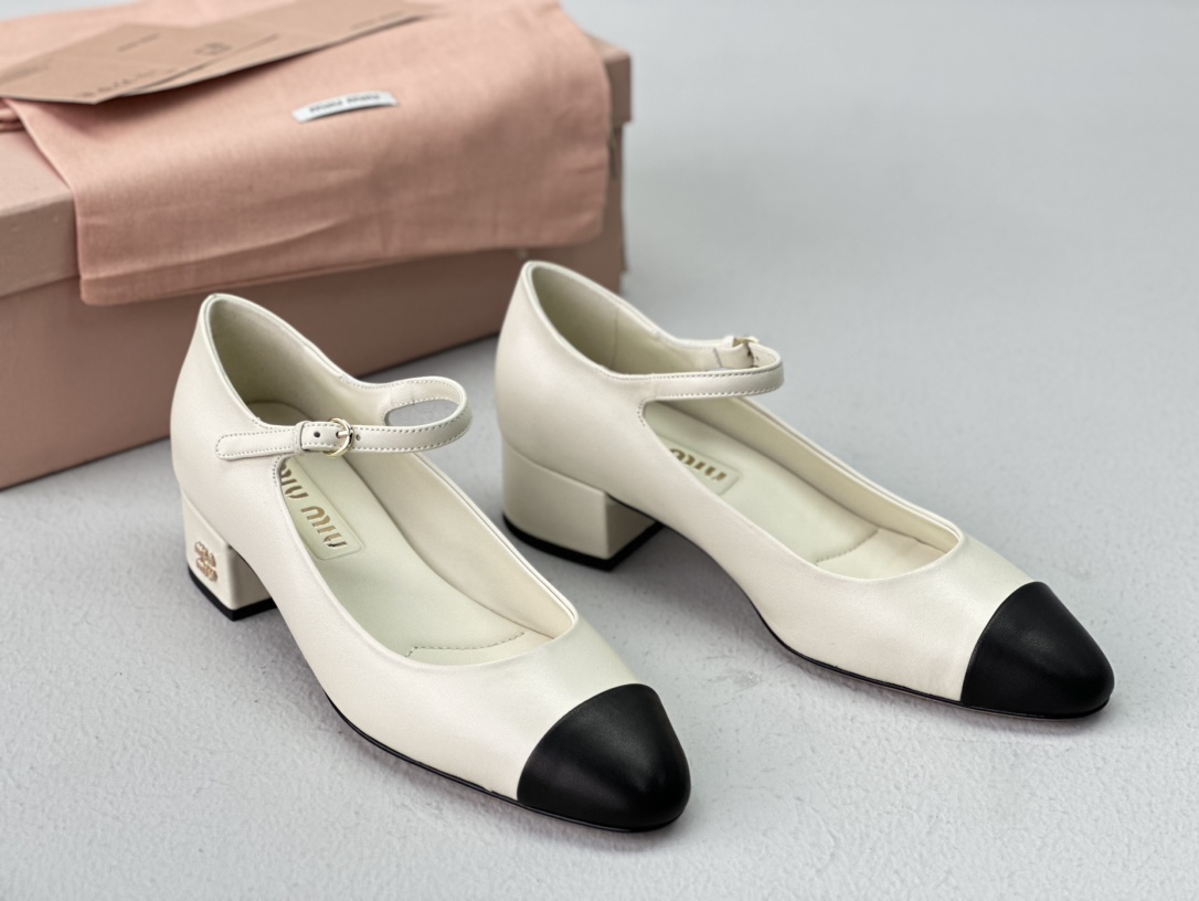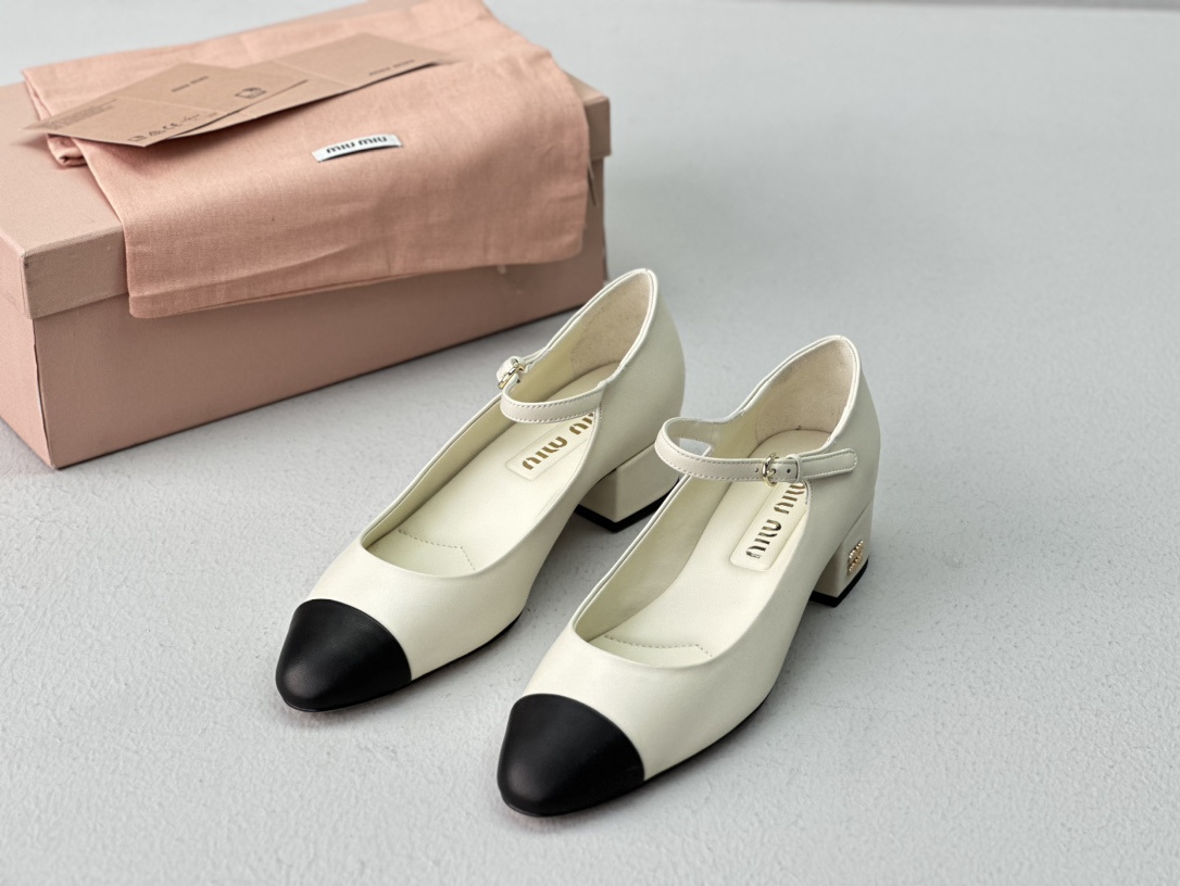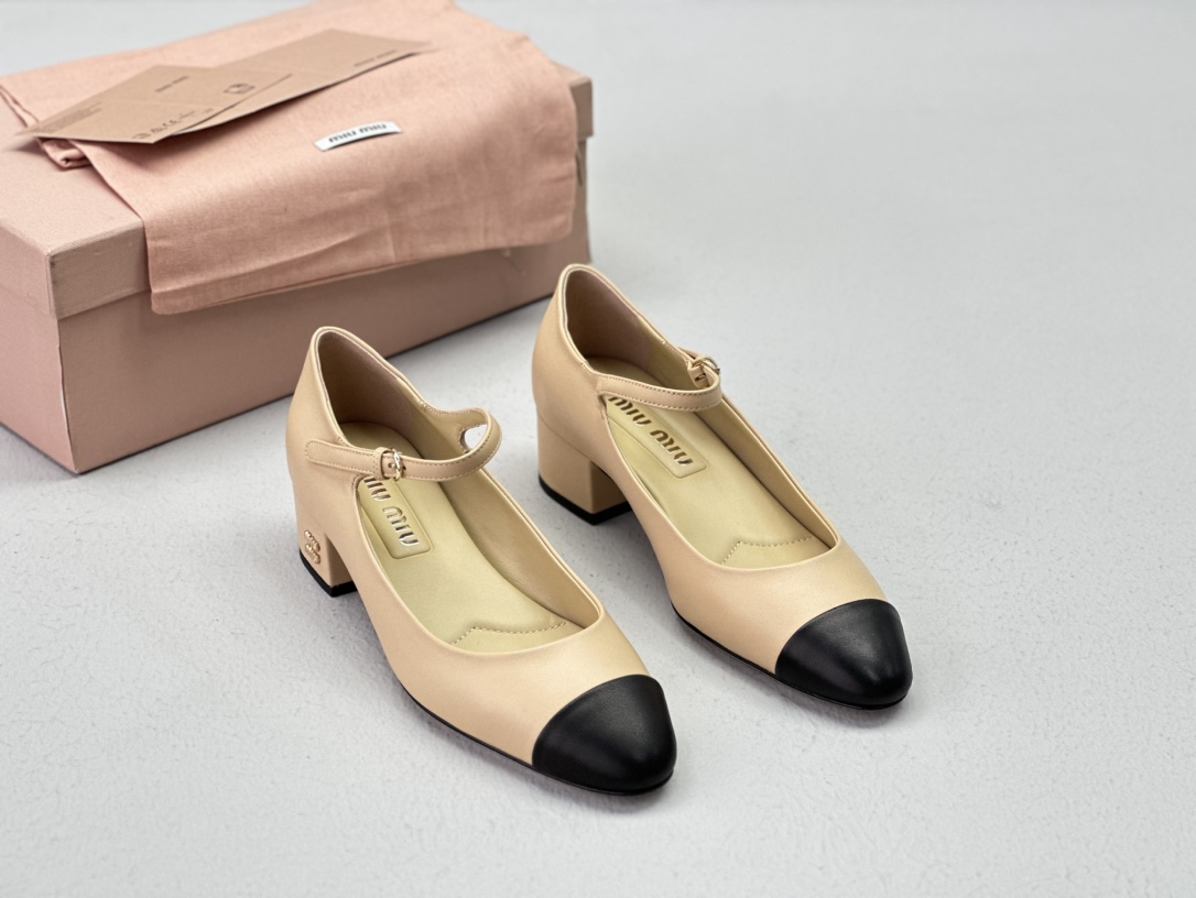 NIGO MiuMiu Women's Summer Colour Blocking Shallow Mouth Buckle Chunky Heel Leather High Heels Shoes #nigo99484