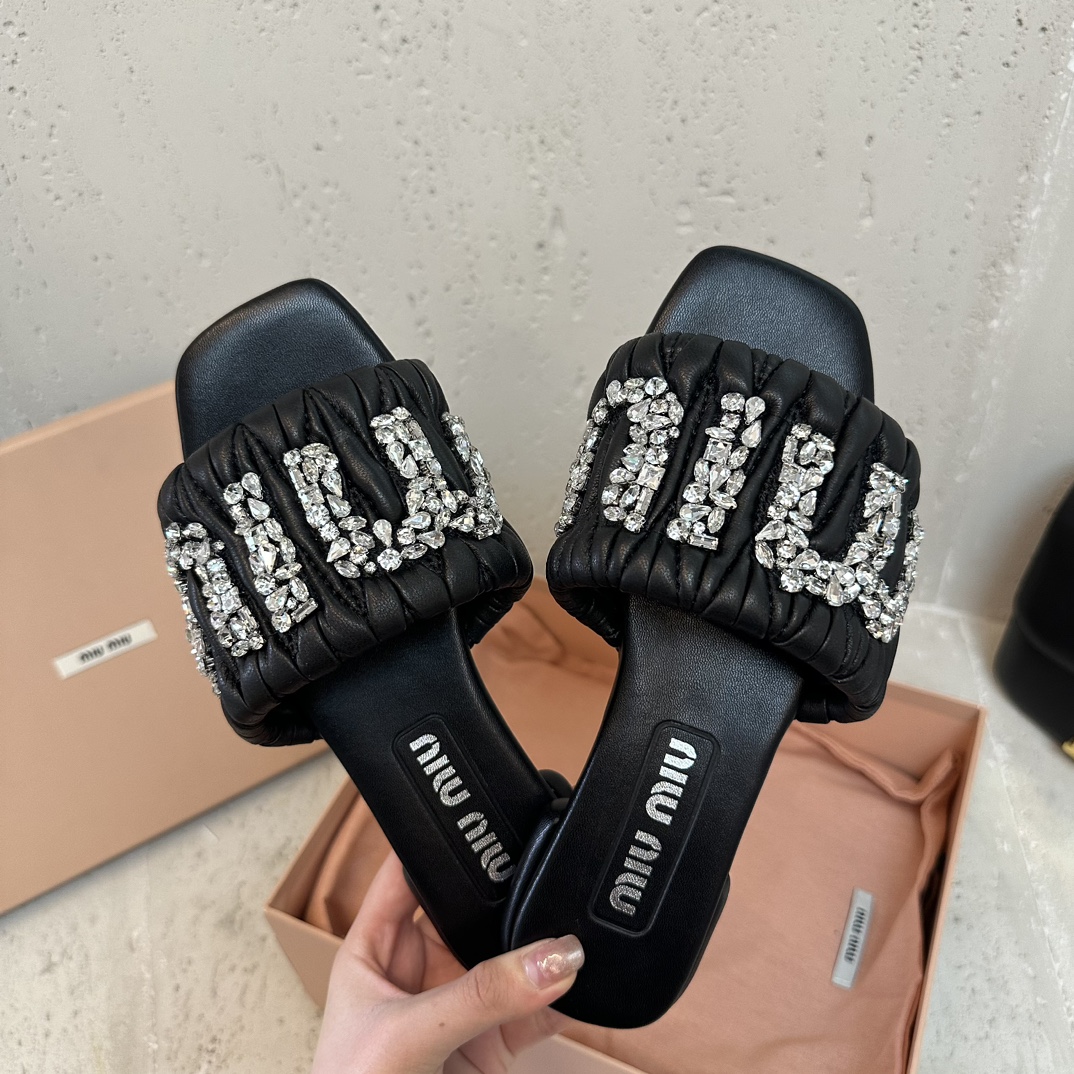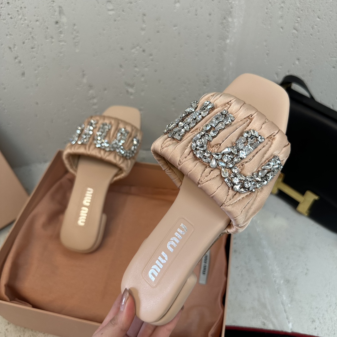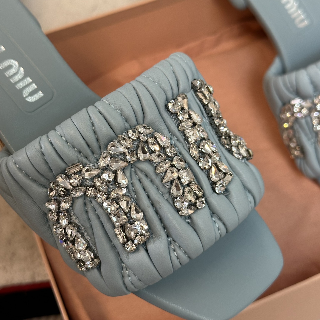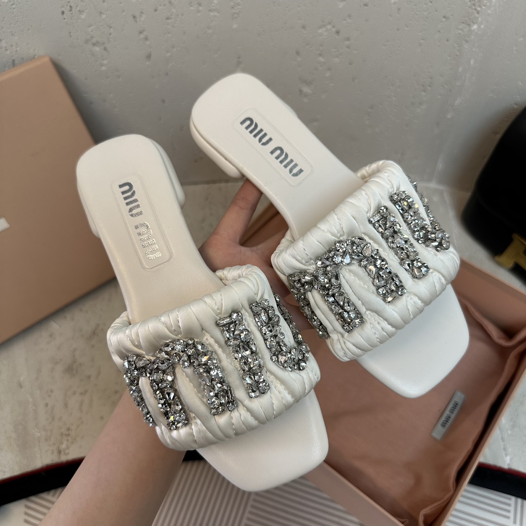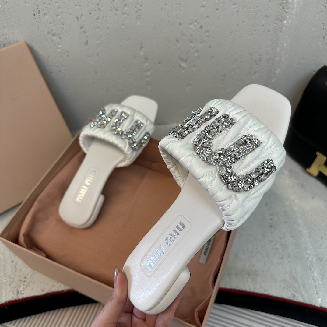 NIGO MiuMiu Women's Summer Diamonds Letter Logo Flat Pleated Calfskin Sandals Slippers Shoes #nigo72376