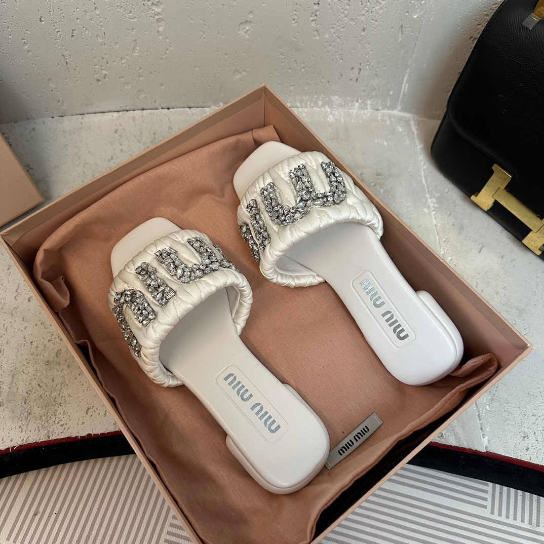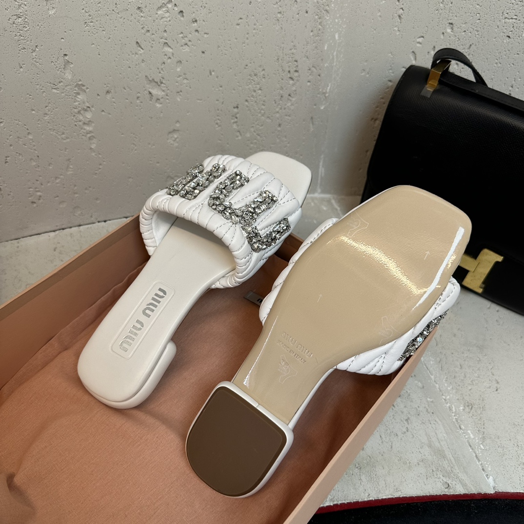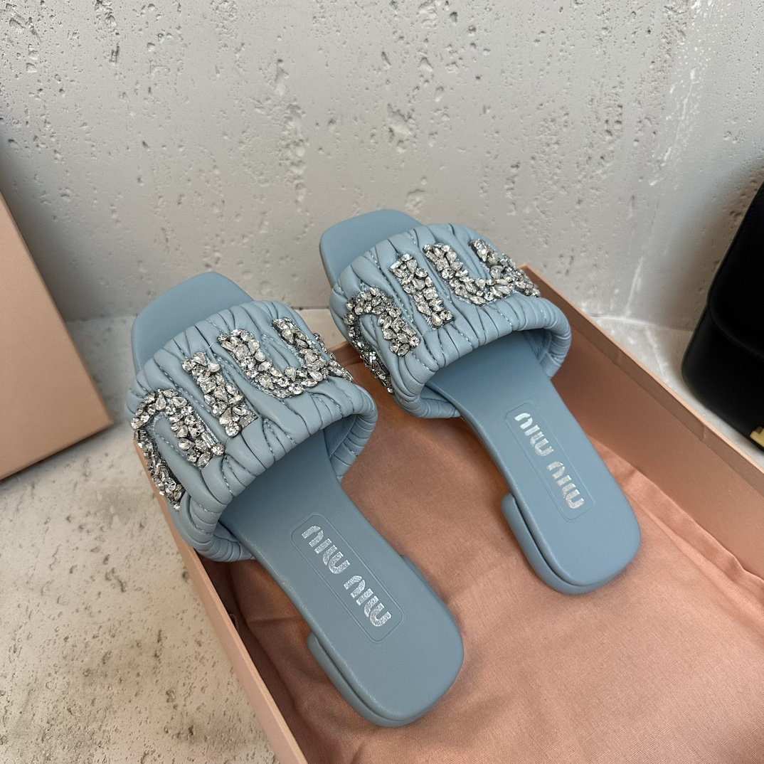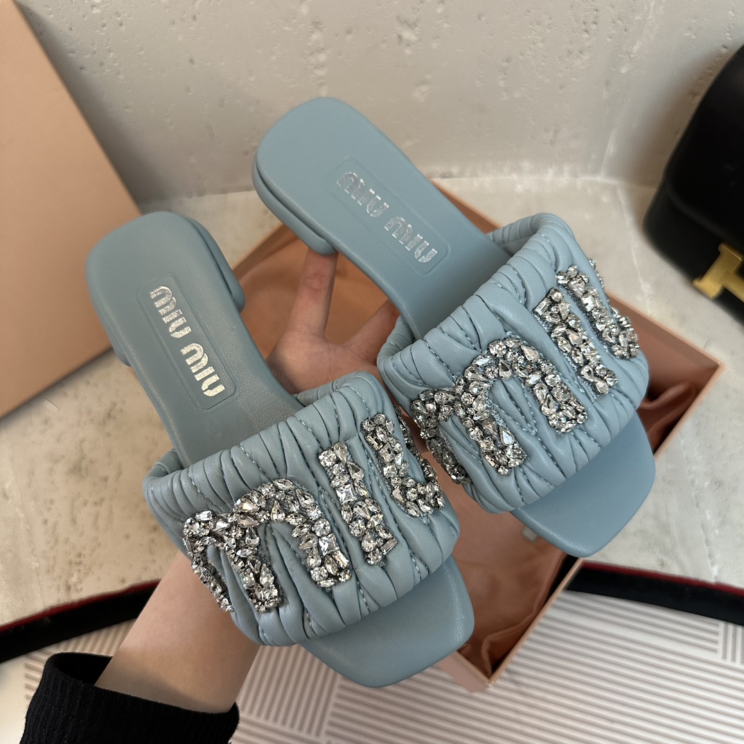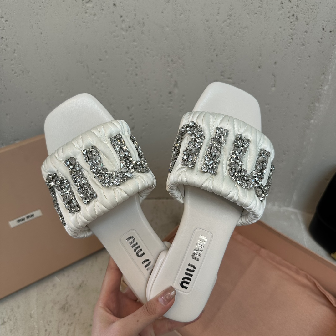 NIGO MiuMiu Women's Summer Diamonds Letter Logo Flat Pleated Calfskin Sandals Slippers Shoes #nigo72376