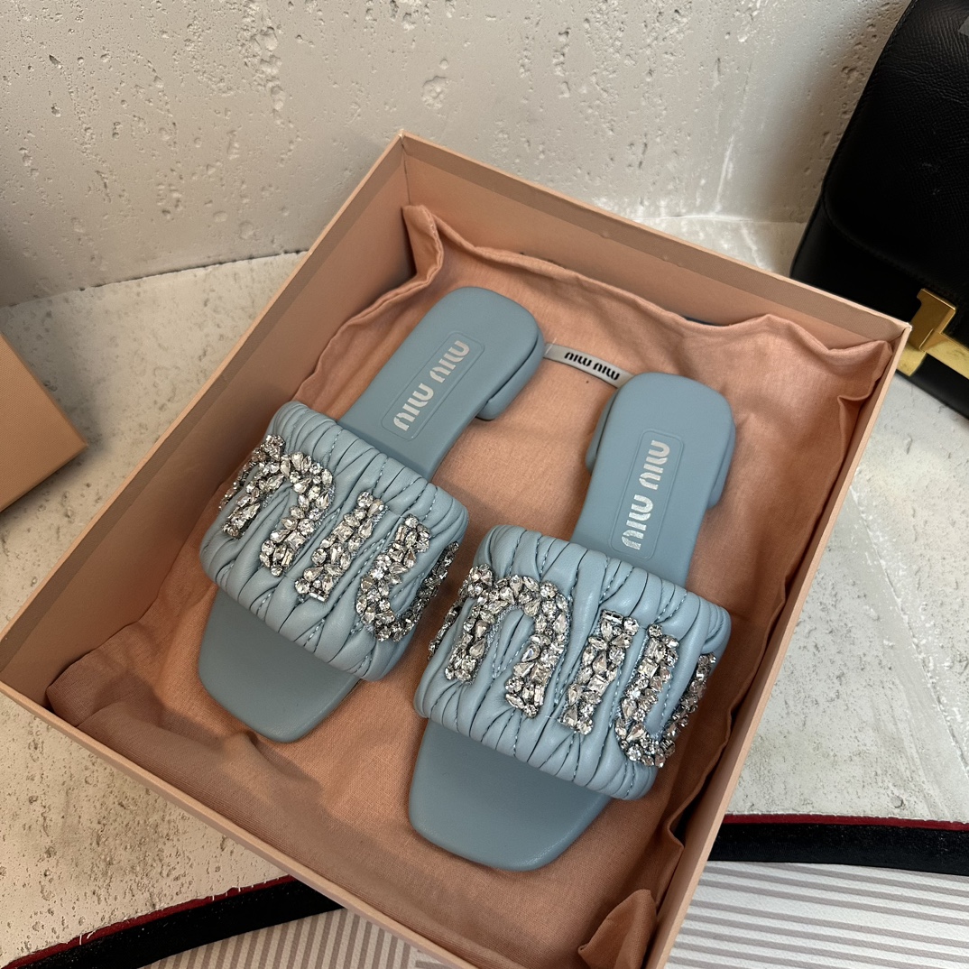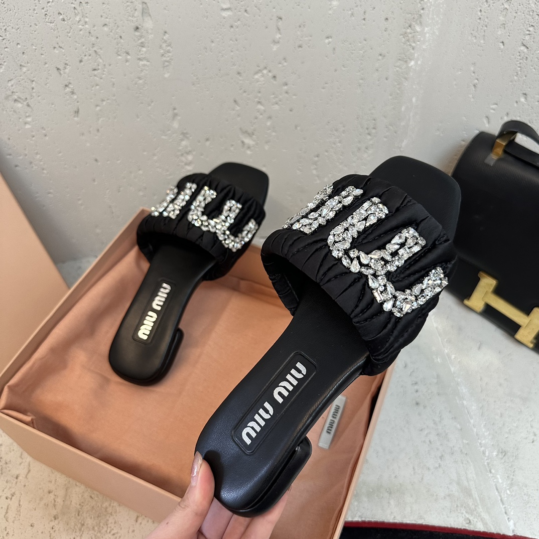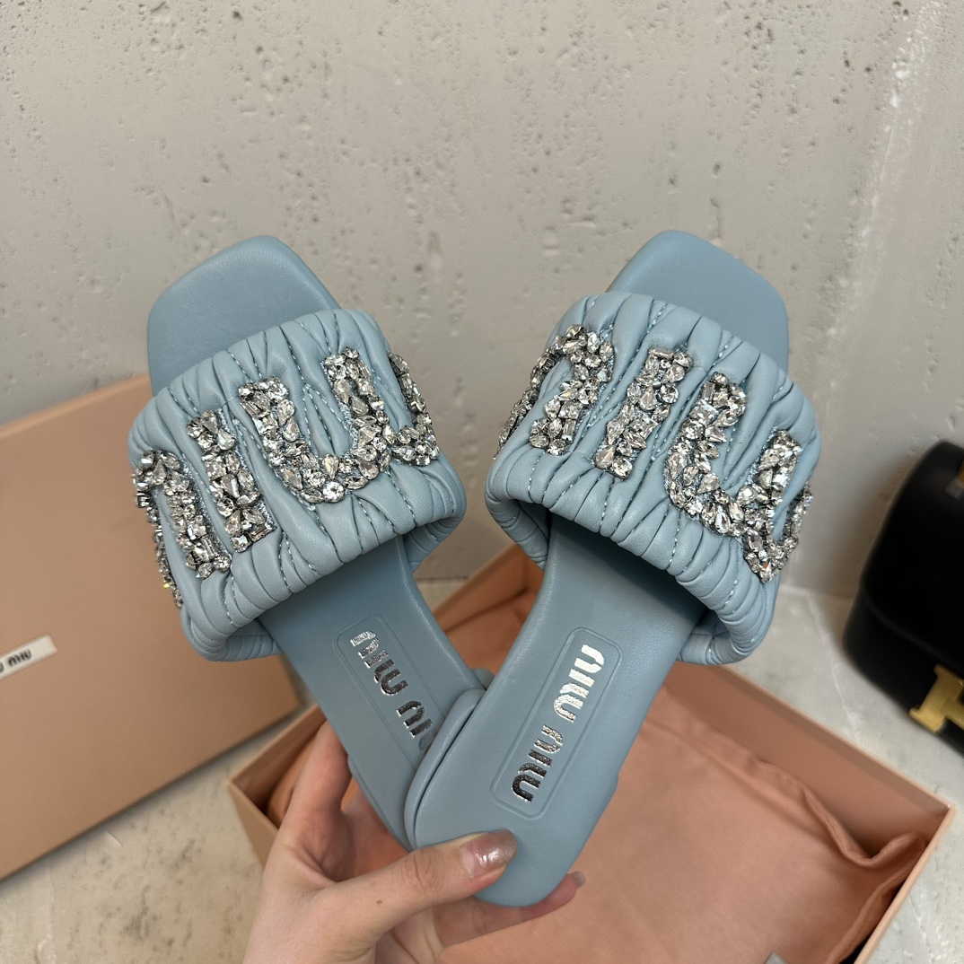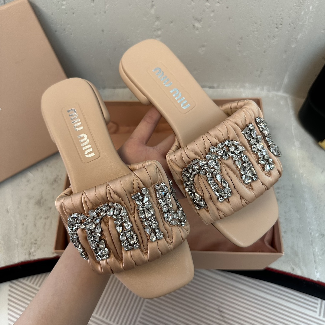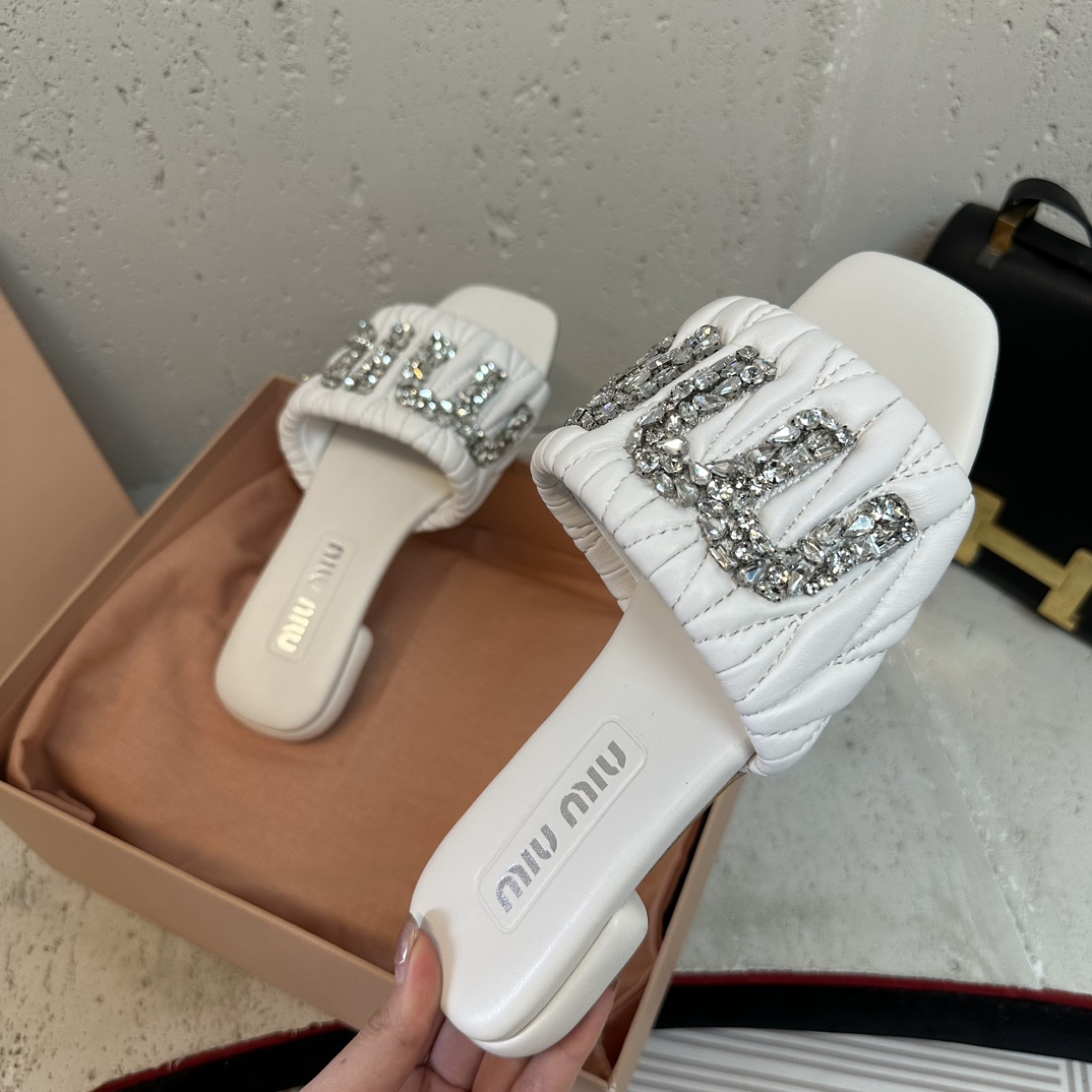 NIGO MiuMiu Women's Summer Diamonds Letter Logo Flat Pleated Calfskin Sandals Slippers Shoes #nigo72376