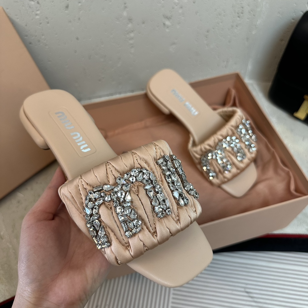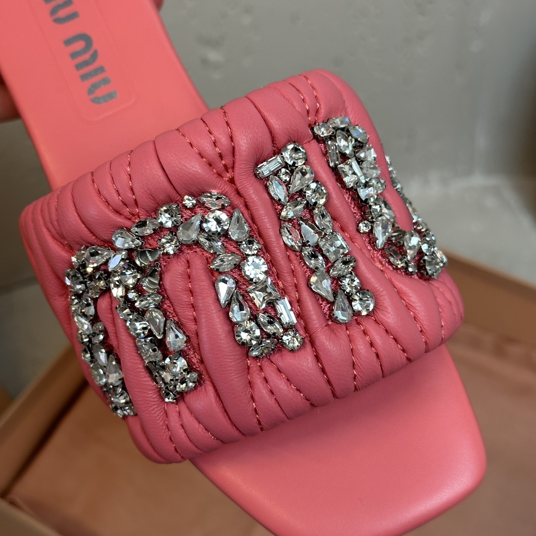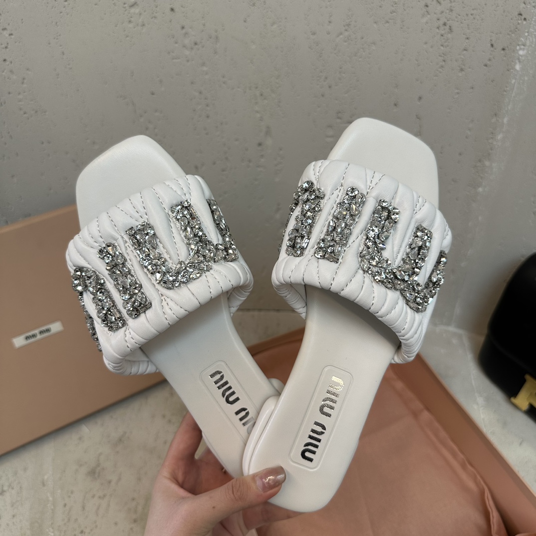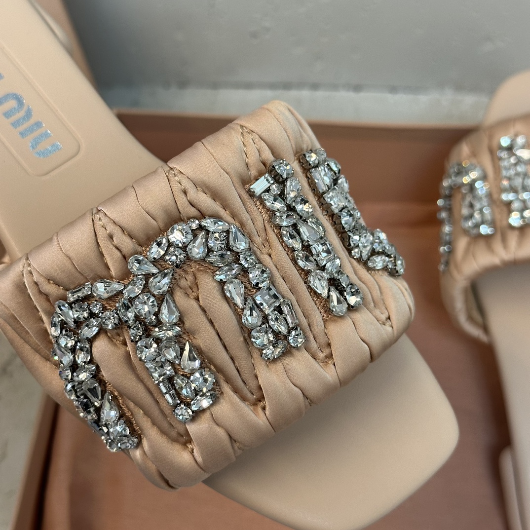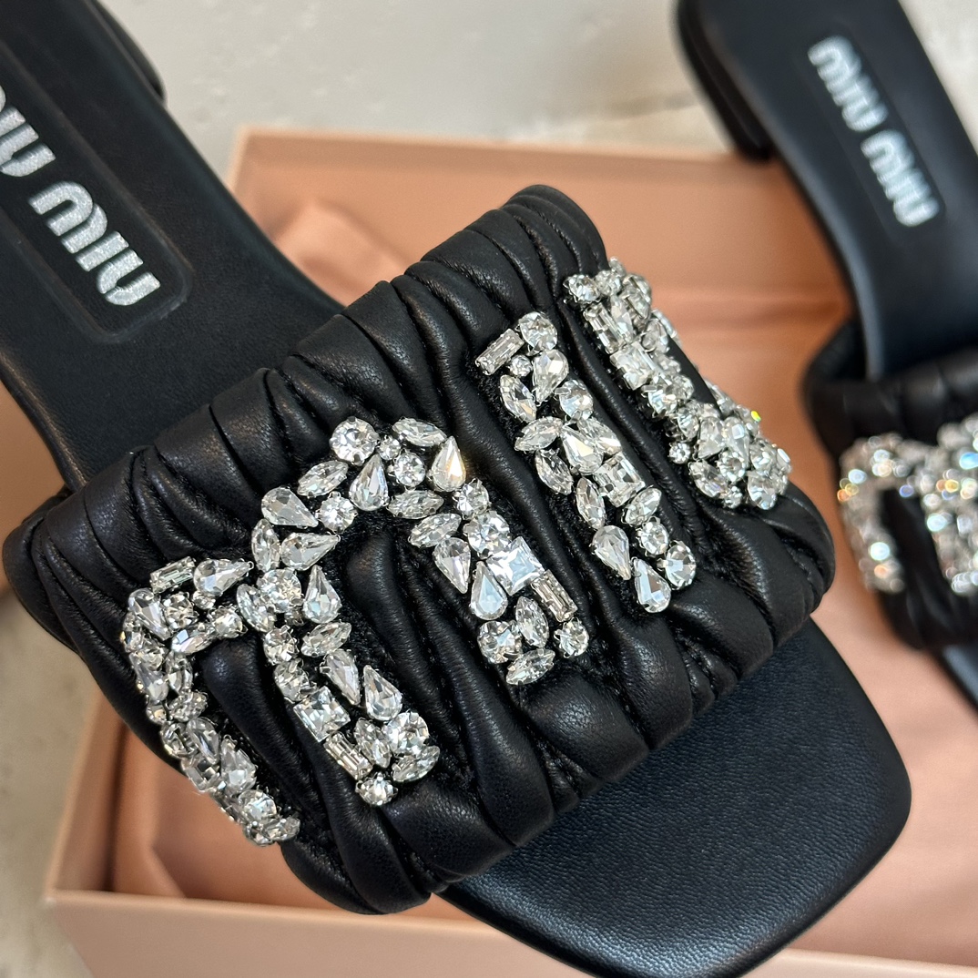 NIGO MiuMiu Women's Summer Diamonds Letter Logo Flat Pleated Calfskin Sandals Slippers Shoes #nigo72376