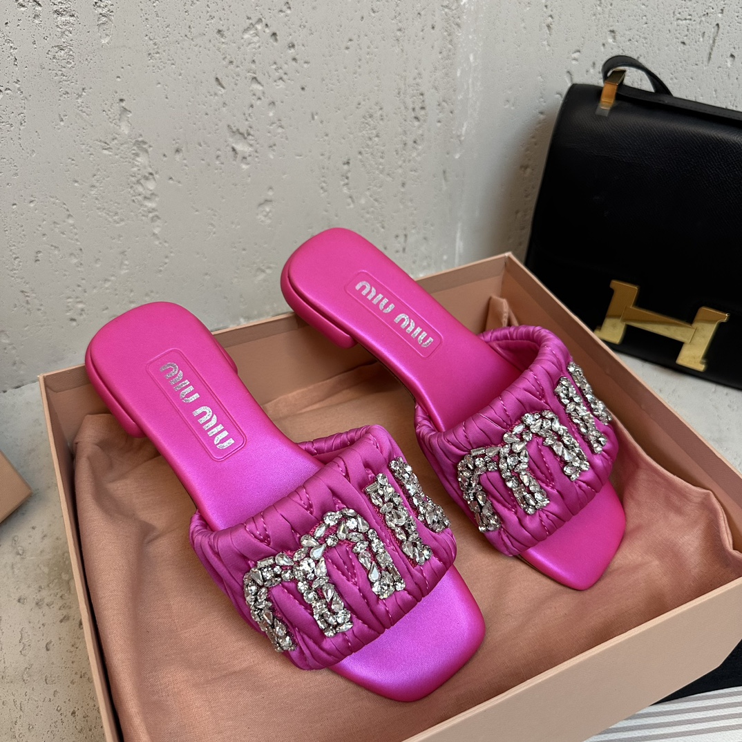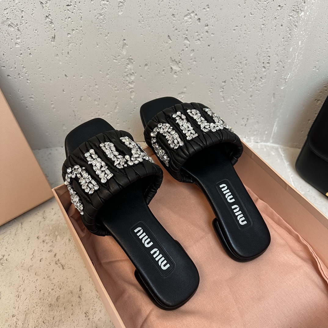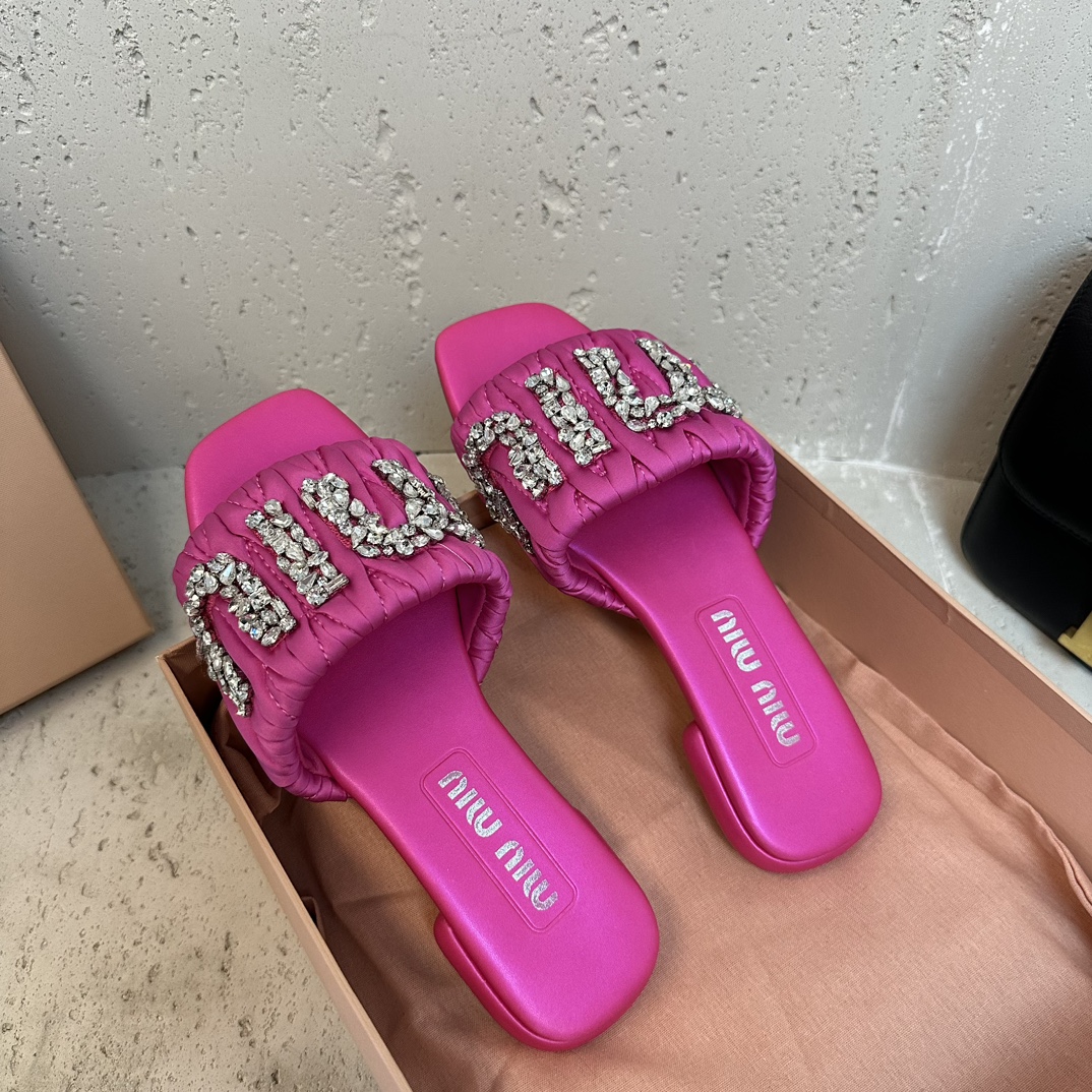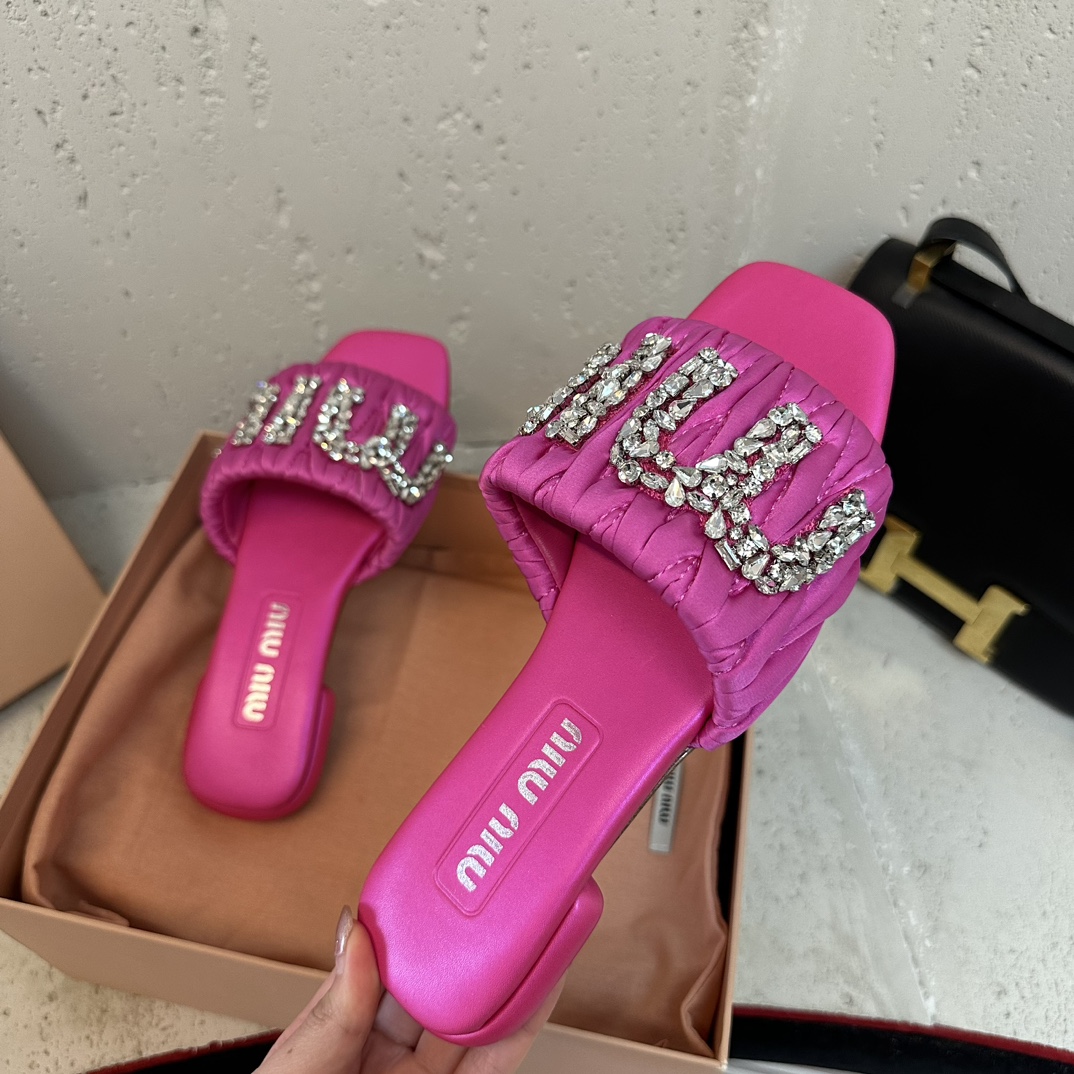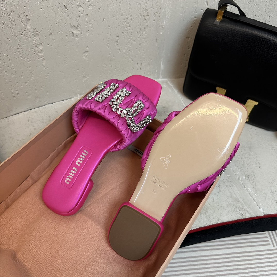 NIGO MiuMiu Women's Summer Diamonds Letter Logo Flat Pleated Calfskin Sandals Slippers Shoes #nigo72376