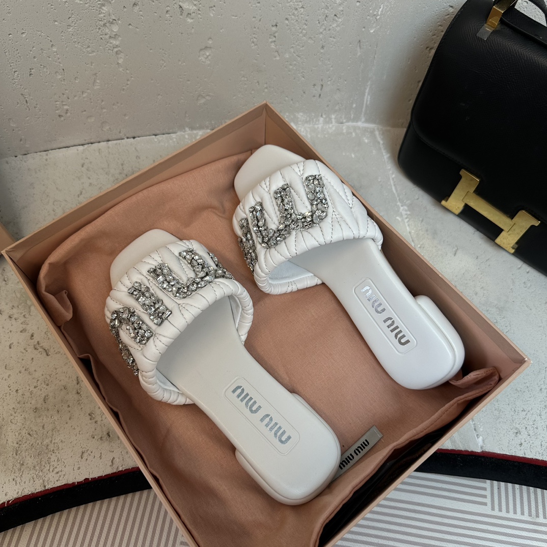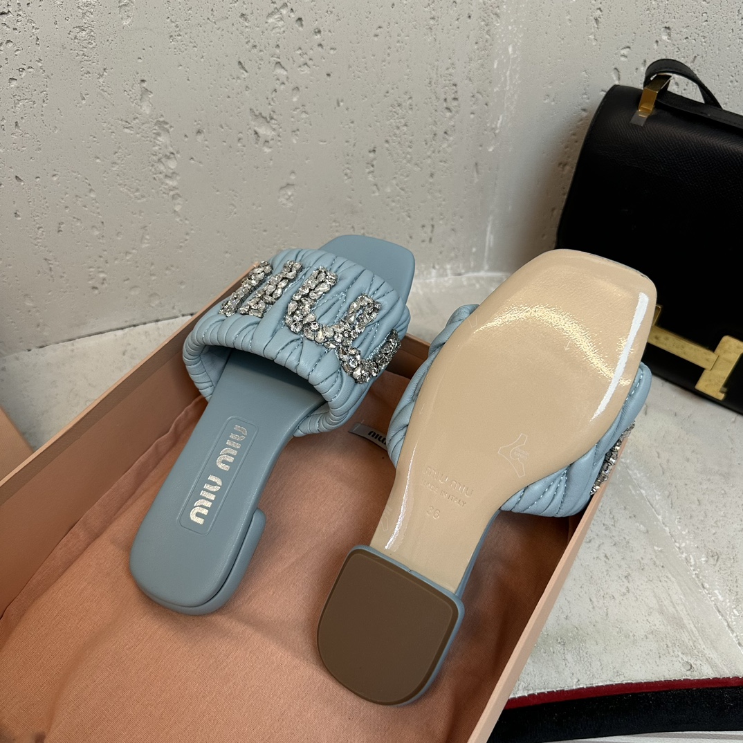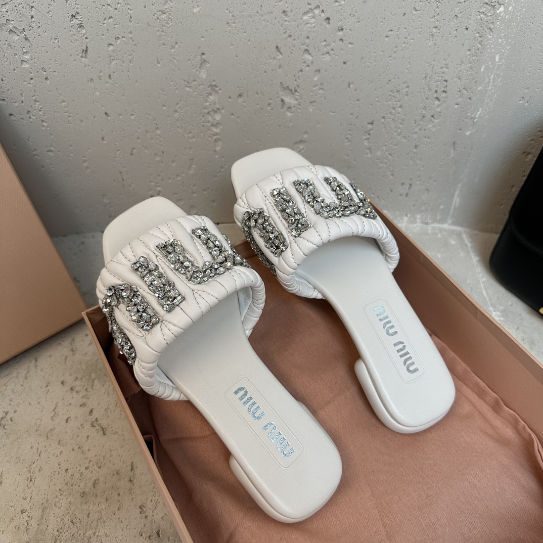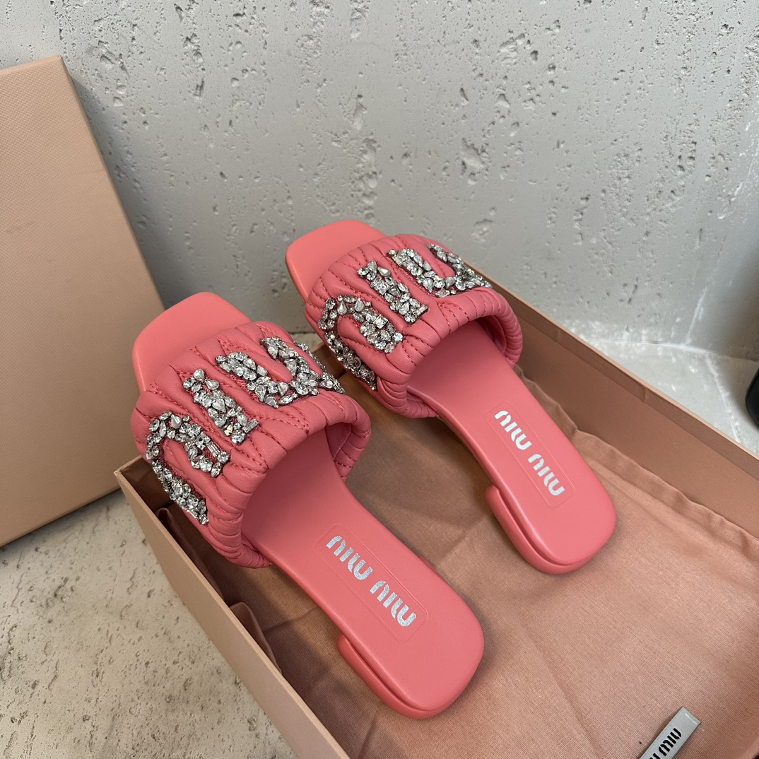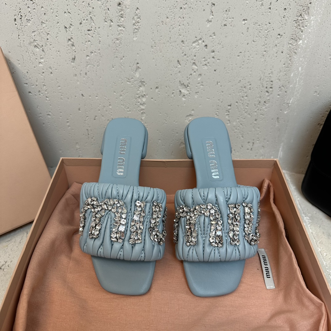 NIGO MiuMiu Women's Summer Diamonds Letter Logo Flat Pleated Calfskin Sandals Slippers Shoes #nigo72376