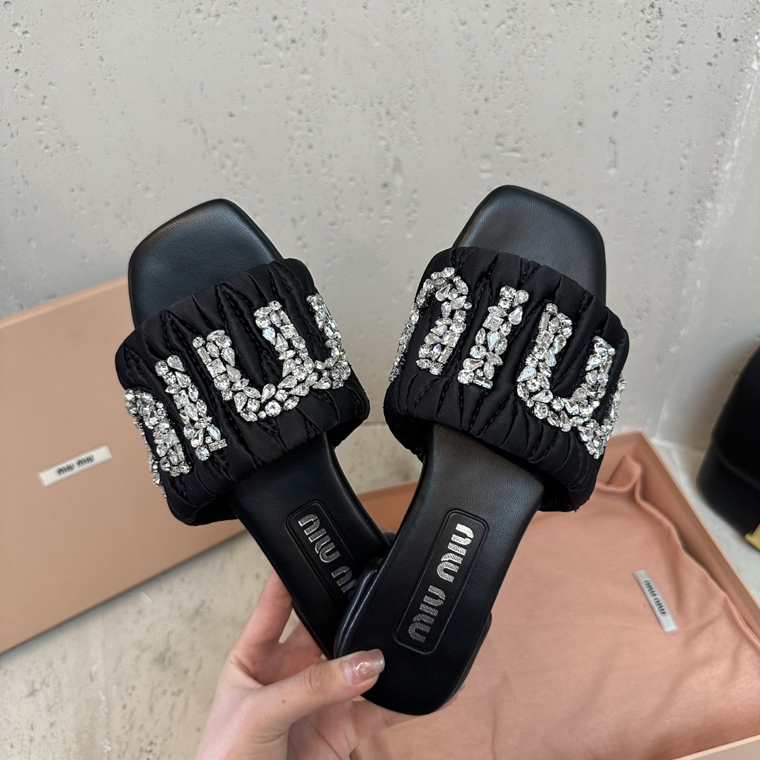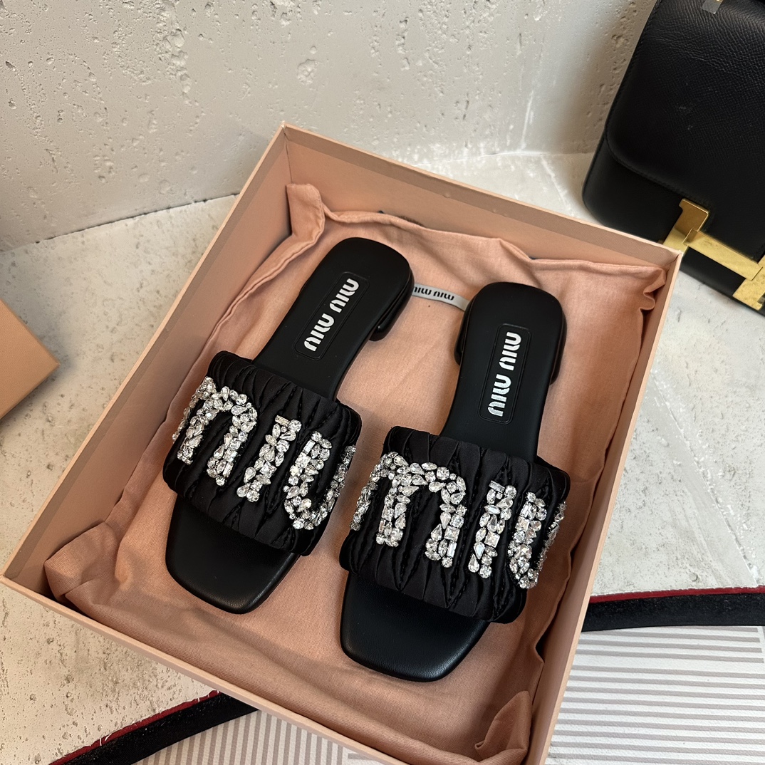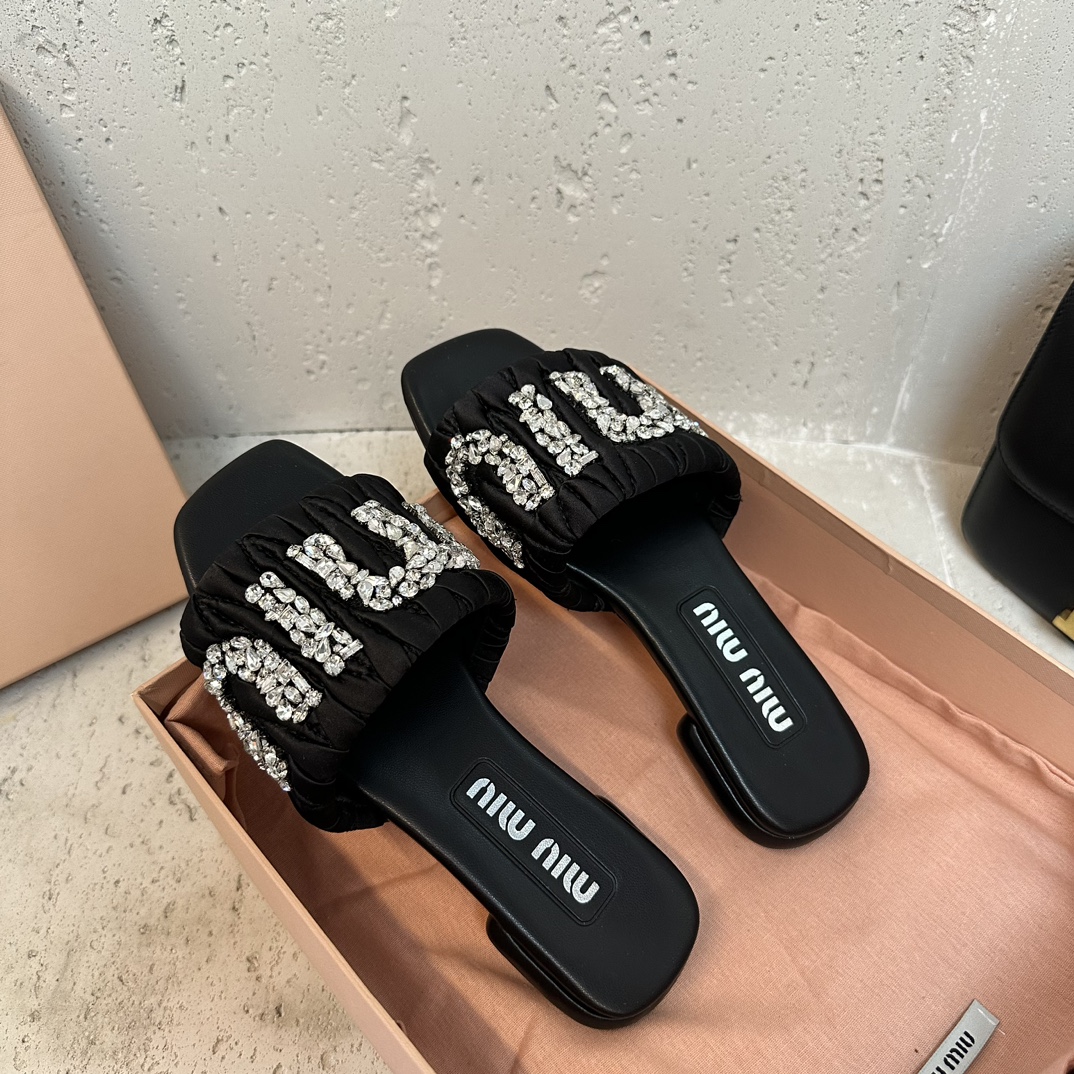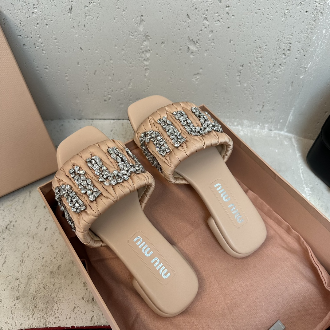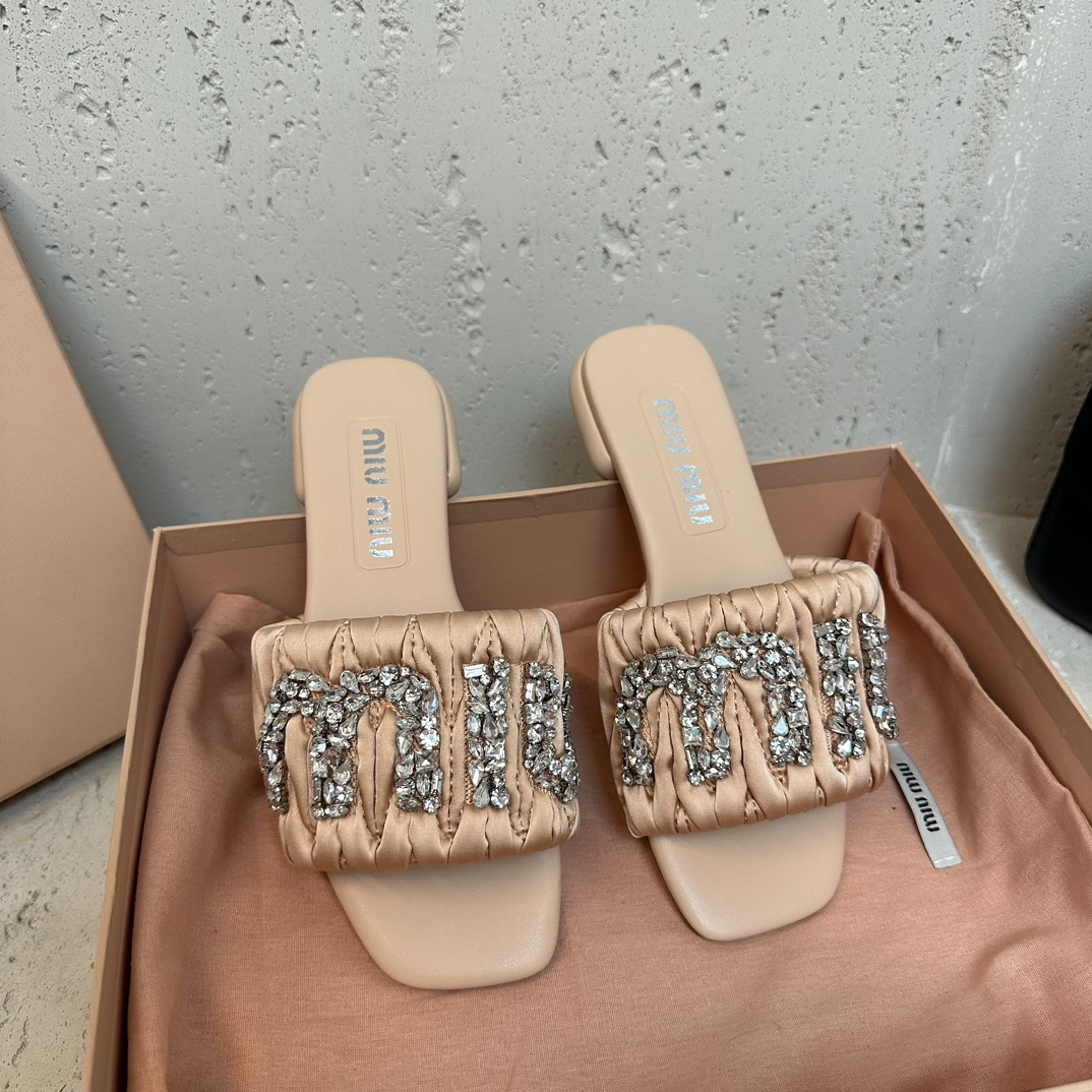NIGO MiuMiu Women's Summer Diamonds Letter Logo Flat Pleated Calfskin Sandals Slippers Shoes #nigo72376