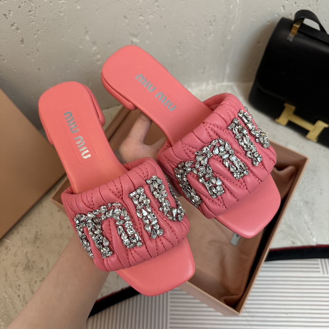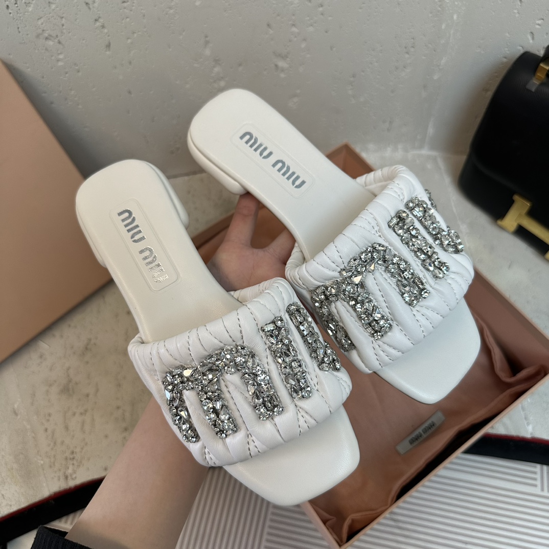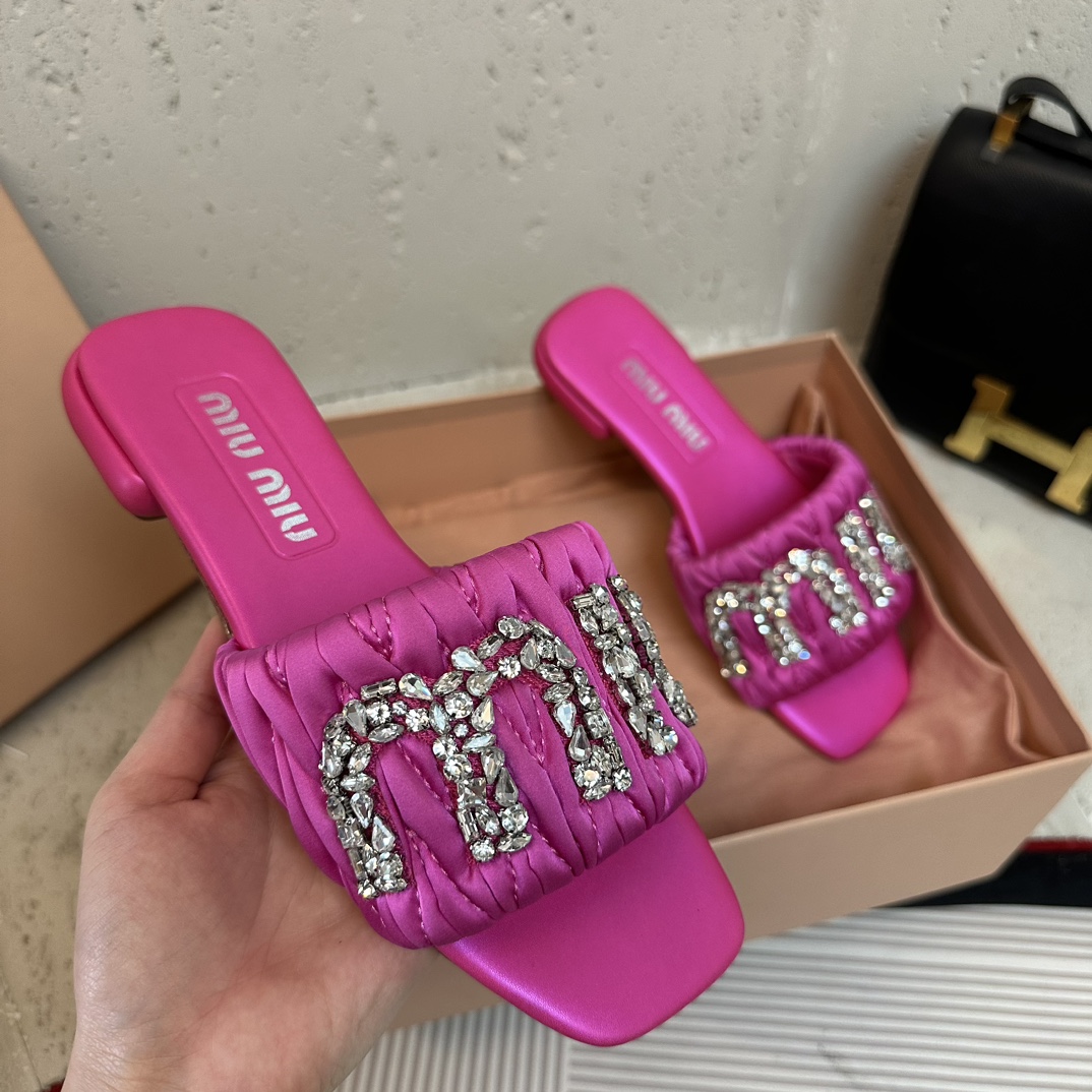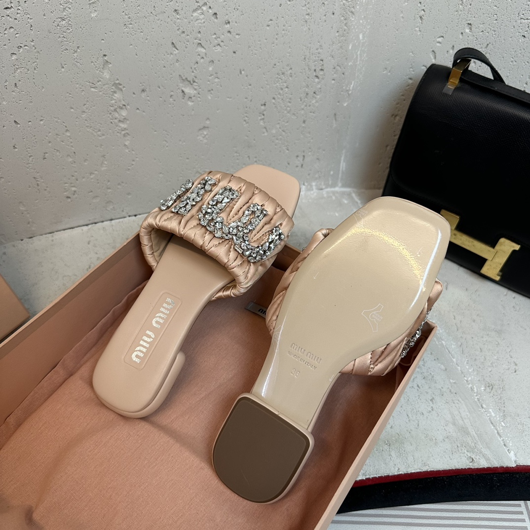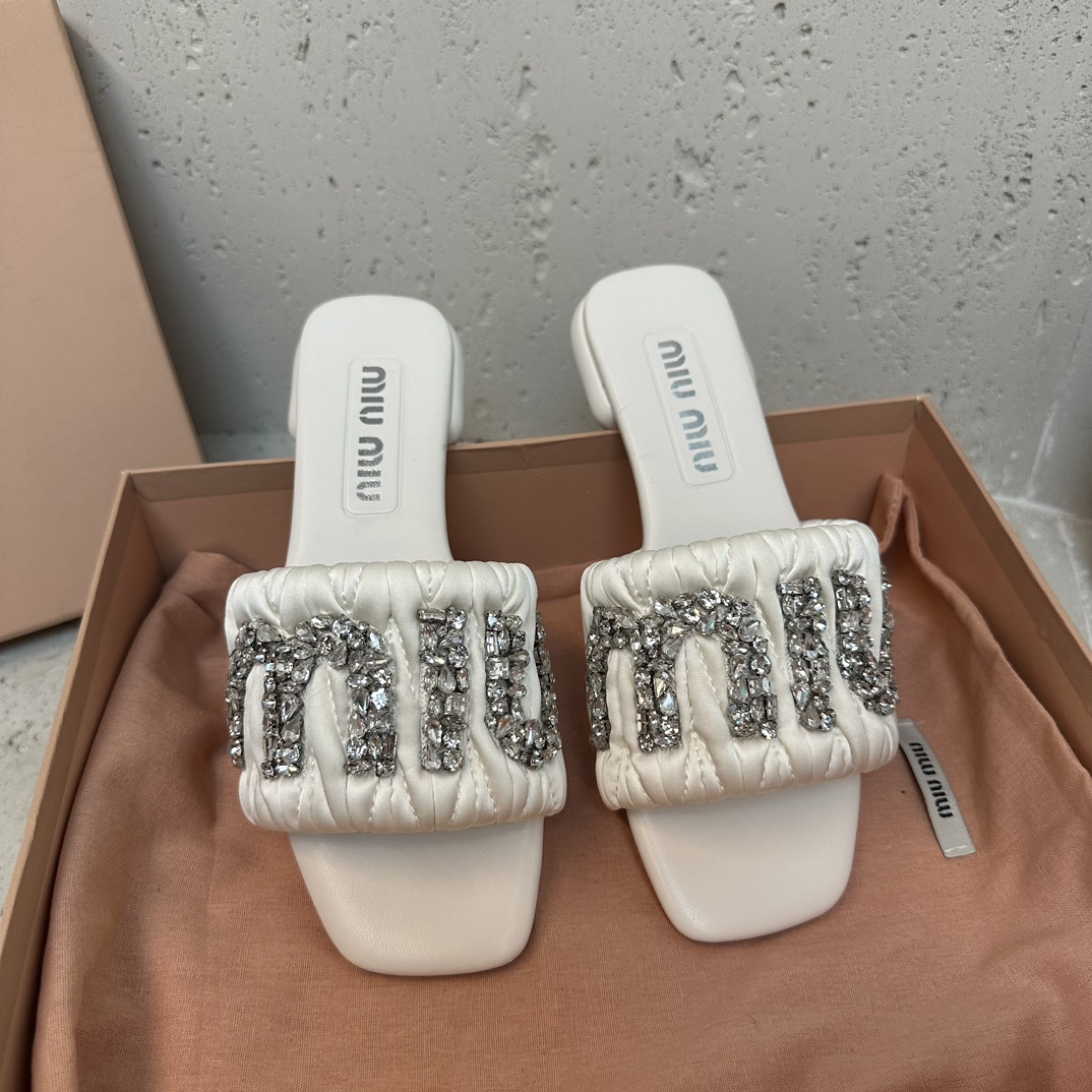 NIGO MiuMiu Women's Summer Diamonds Letter Logo Flat Pleated Calfskin Sandals Slippers Shoes #nigo72376
