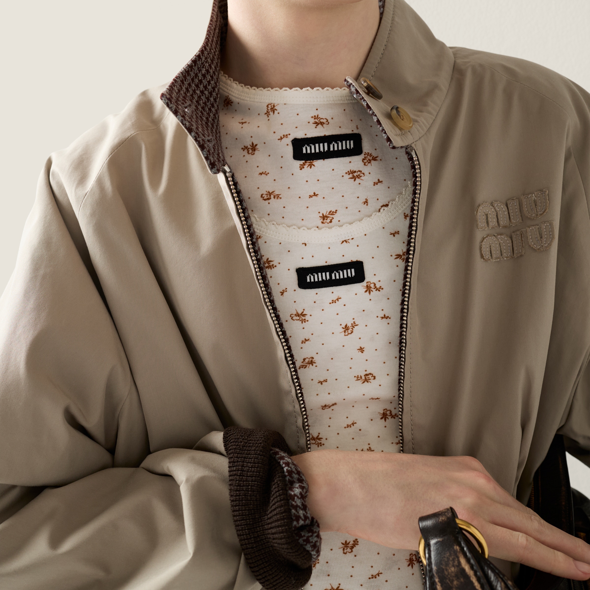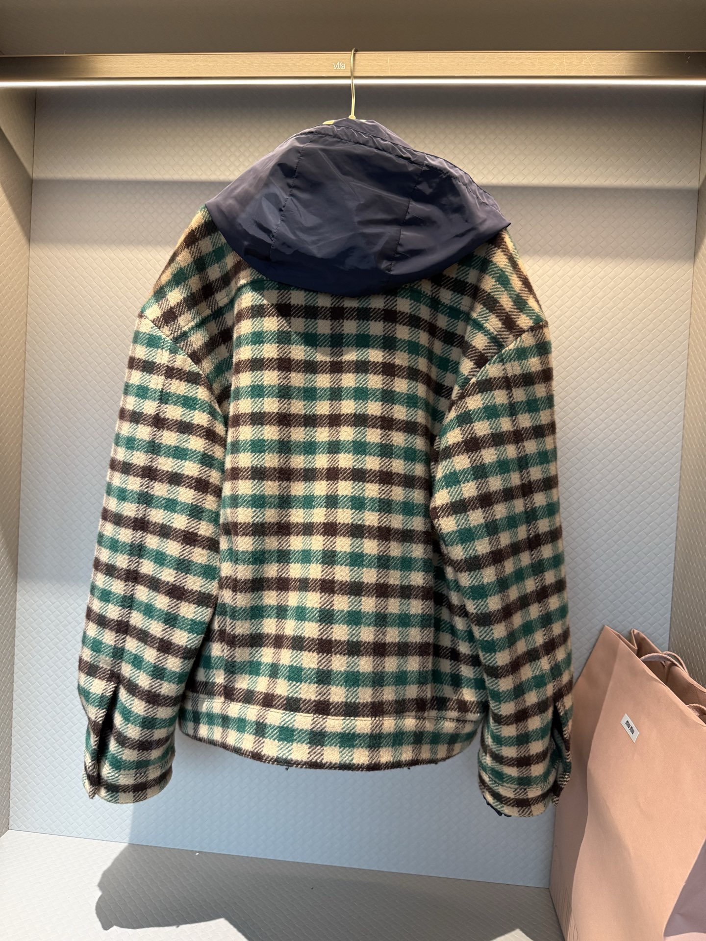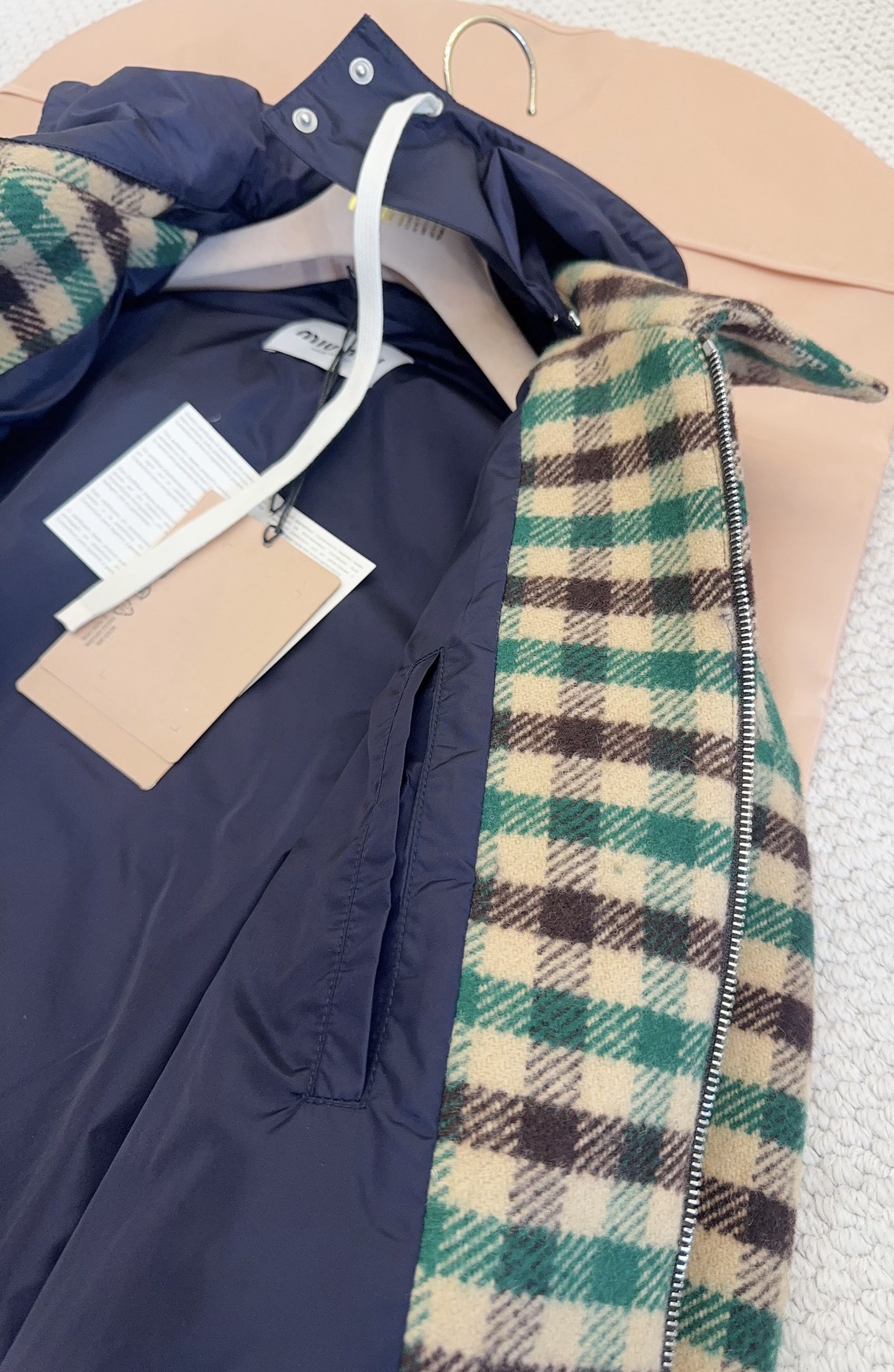 NIGO MiuMiu Women's Fall/Winter Lettering Eembroidered Logo Hood Zip Camel Green Navy Check and Technical Jacket #nigo332611