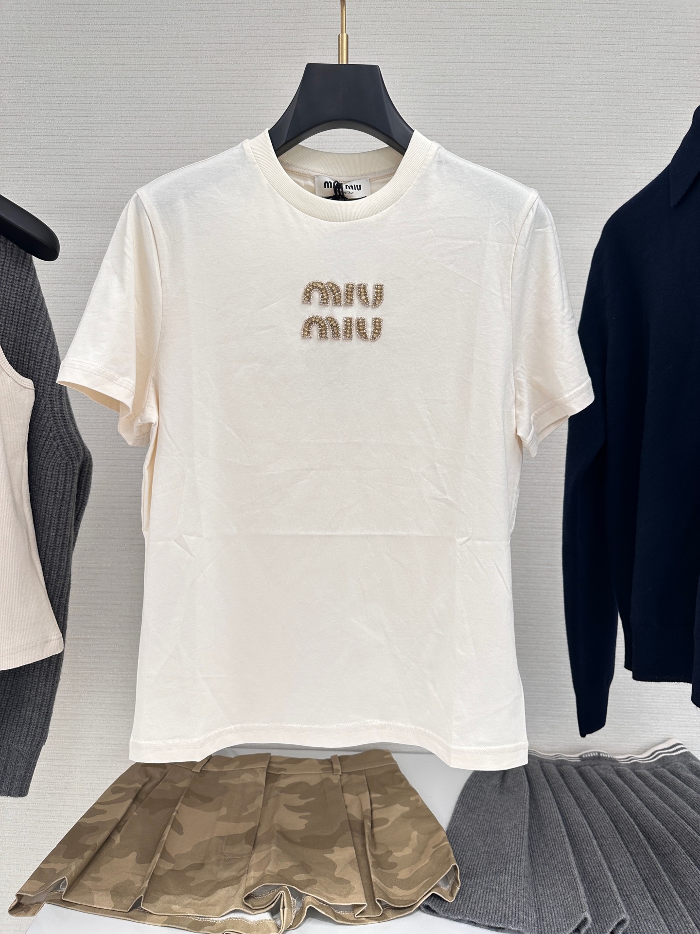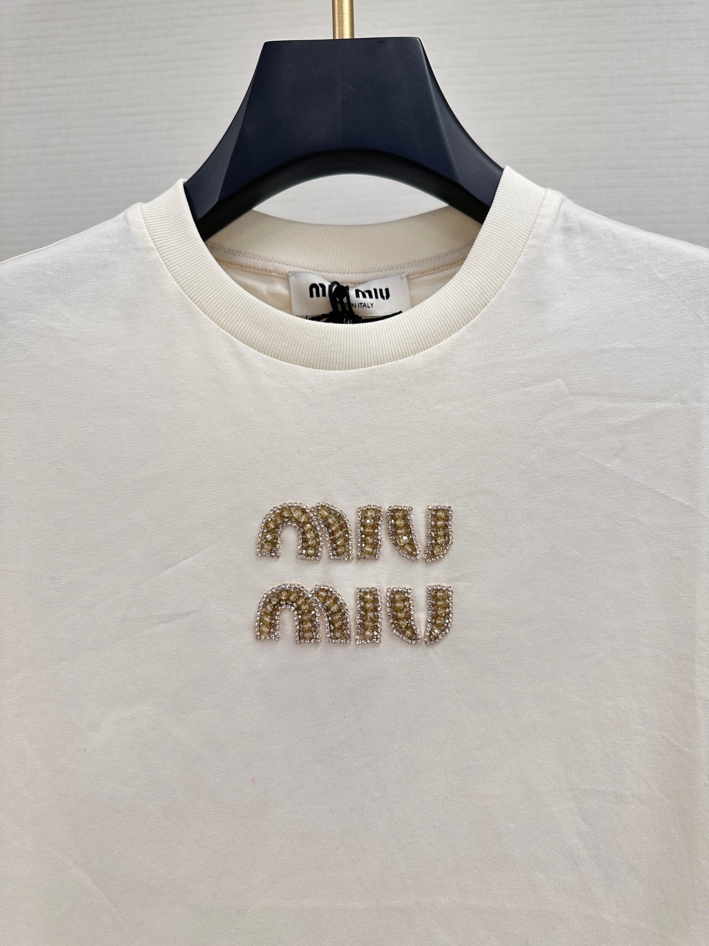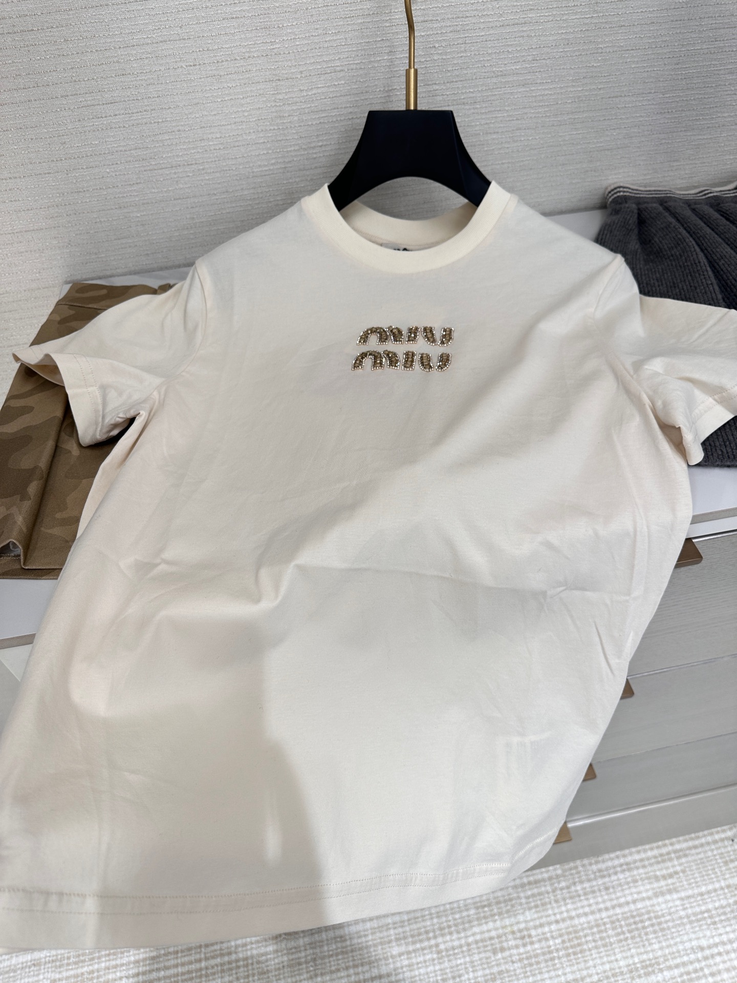 NIGO MiuMiu Women's Summer Solid Color Embroidery Beaded Letter Print Round Neck Short Sleeve T-Shirt #nigo75117
