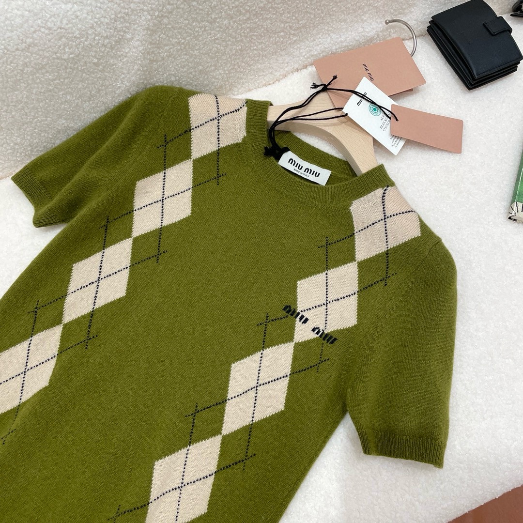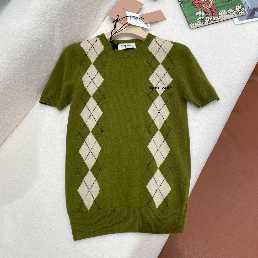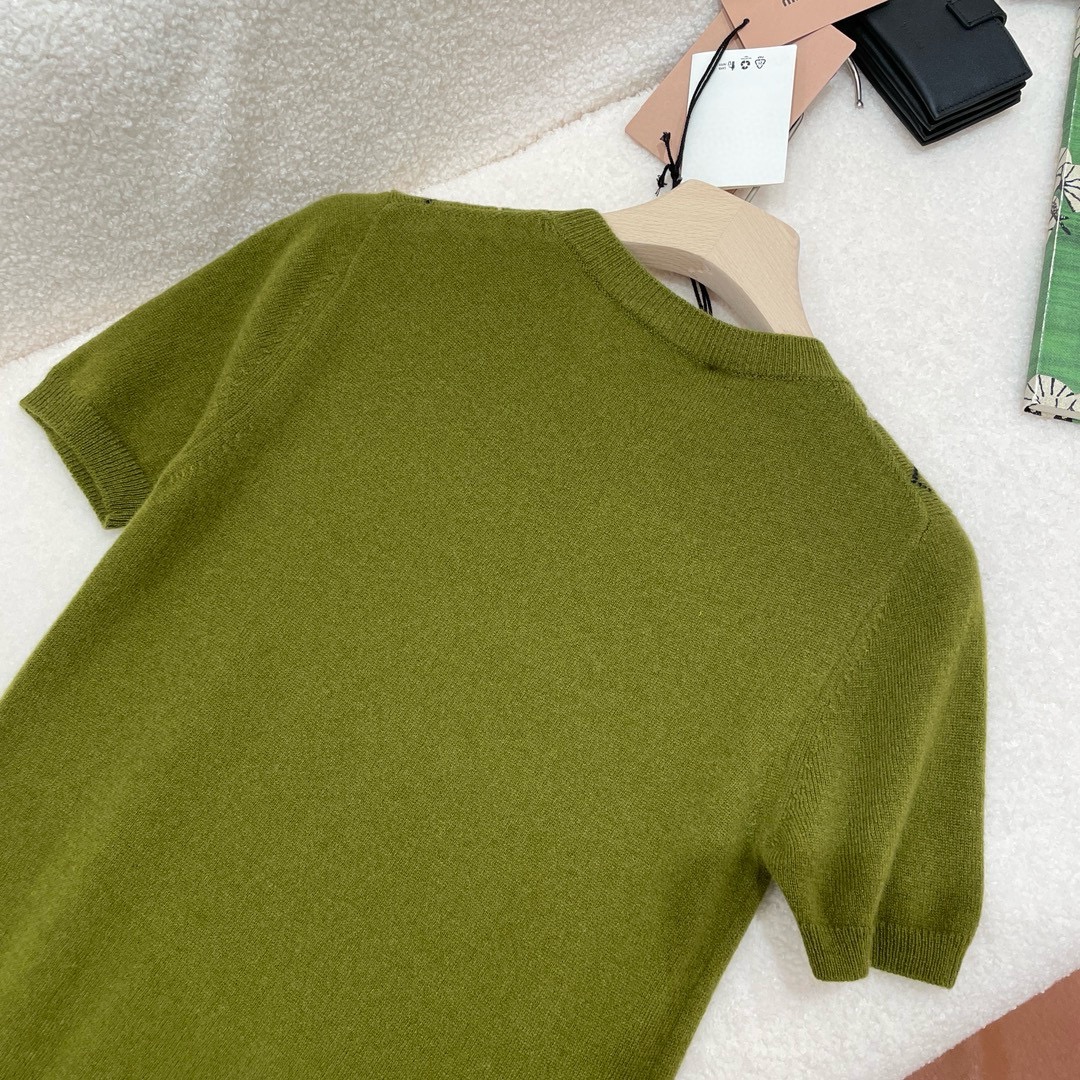 NIGO MiuMiu Women's Summer Colorblocking Diamond Appliqué Knit Round Neck Slim Short Sleeve Cashmere T-shirt #nigo73852