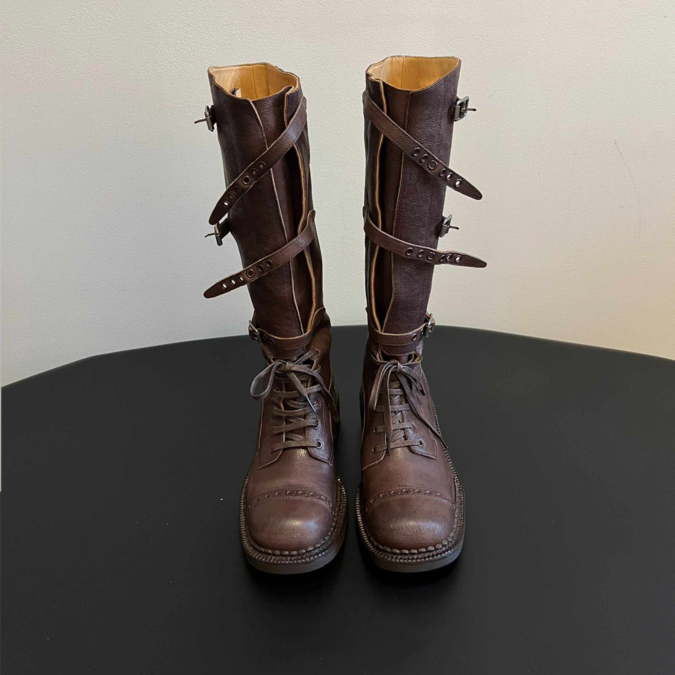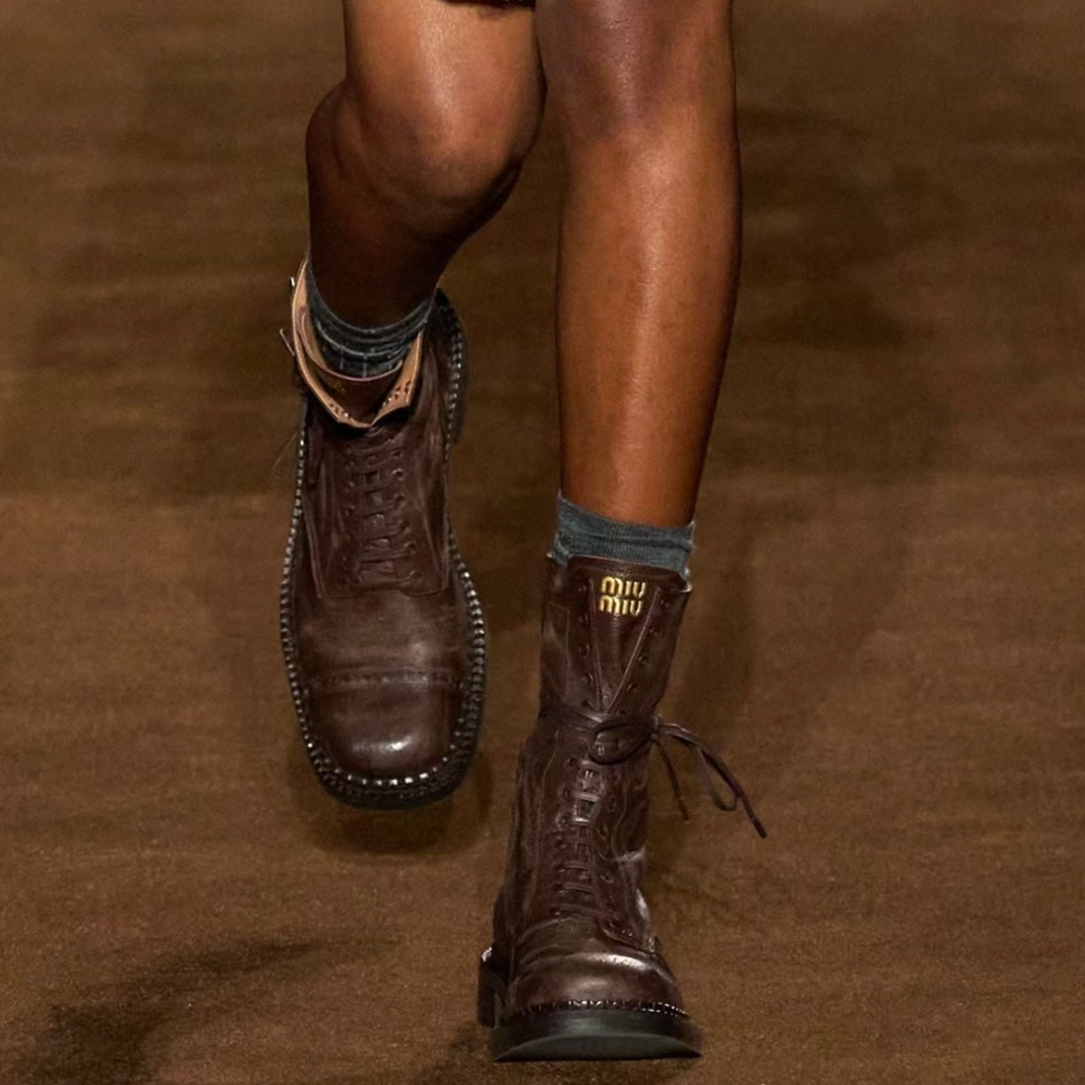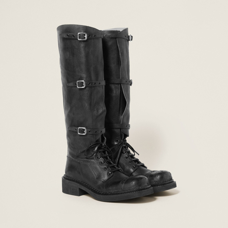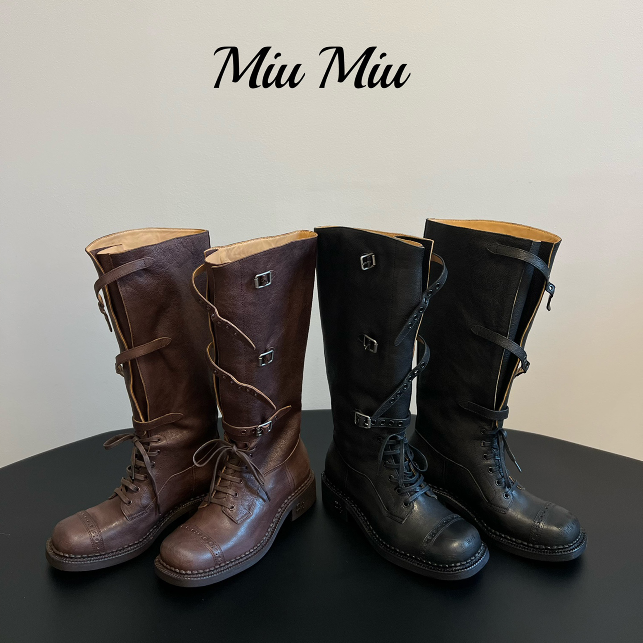 NIGO MiuMiu Women's Four Seasons Biker Style Retro Leather Buckle Boots Lace-up Cowhide Boots Casual Shoes Ngvp #nigo8389