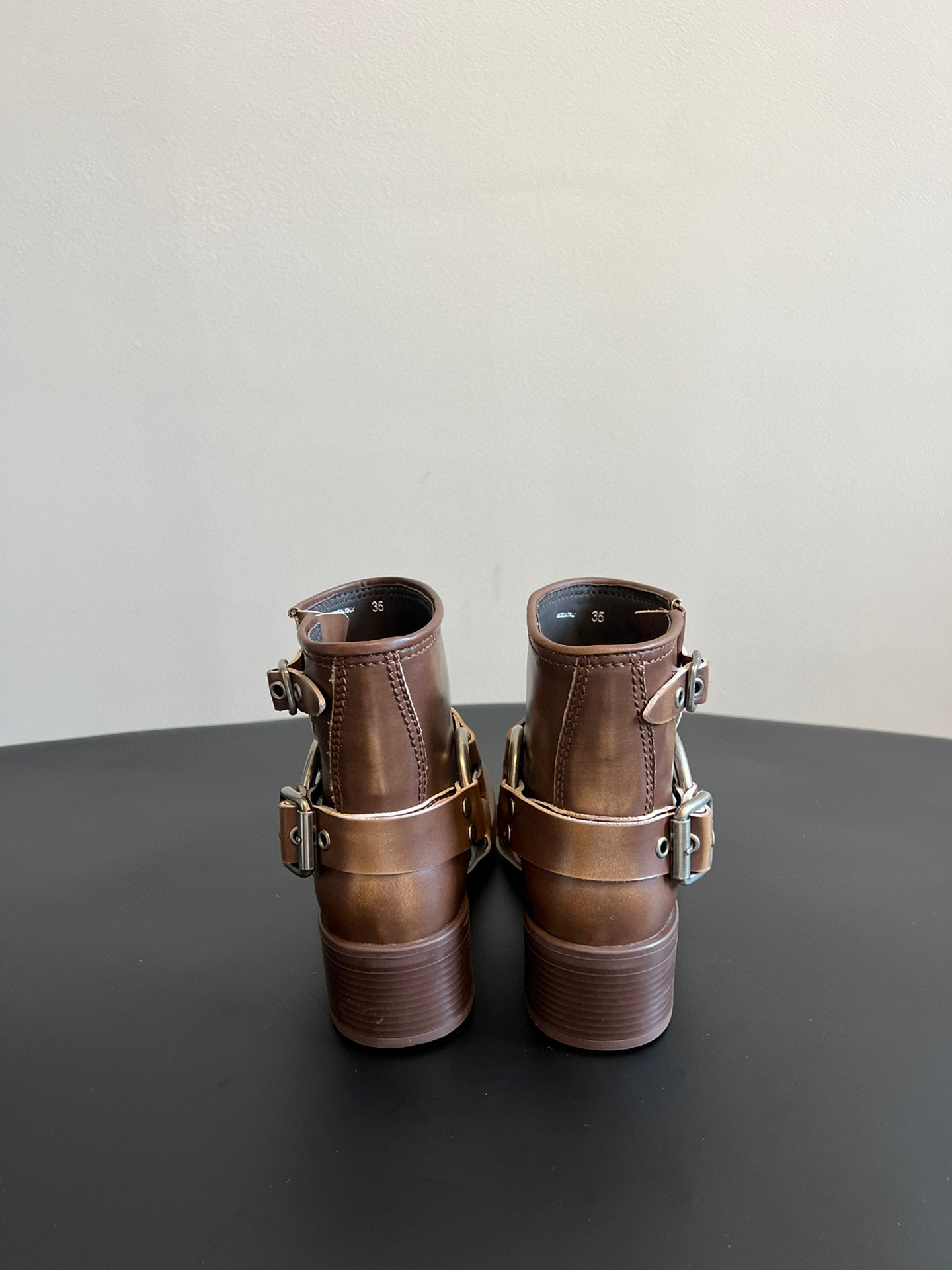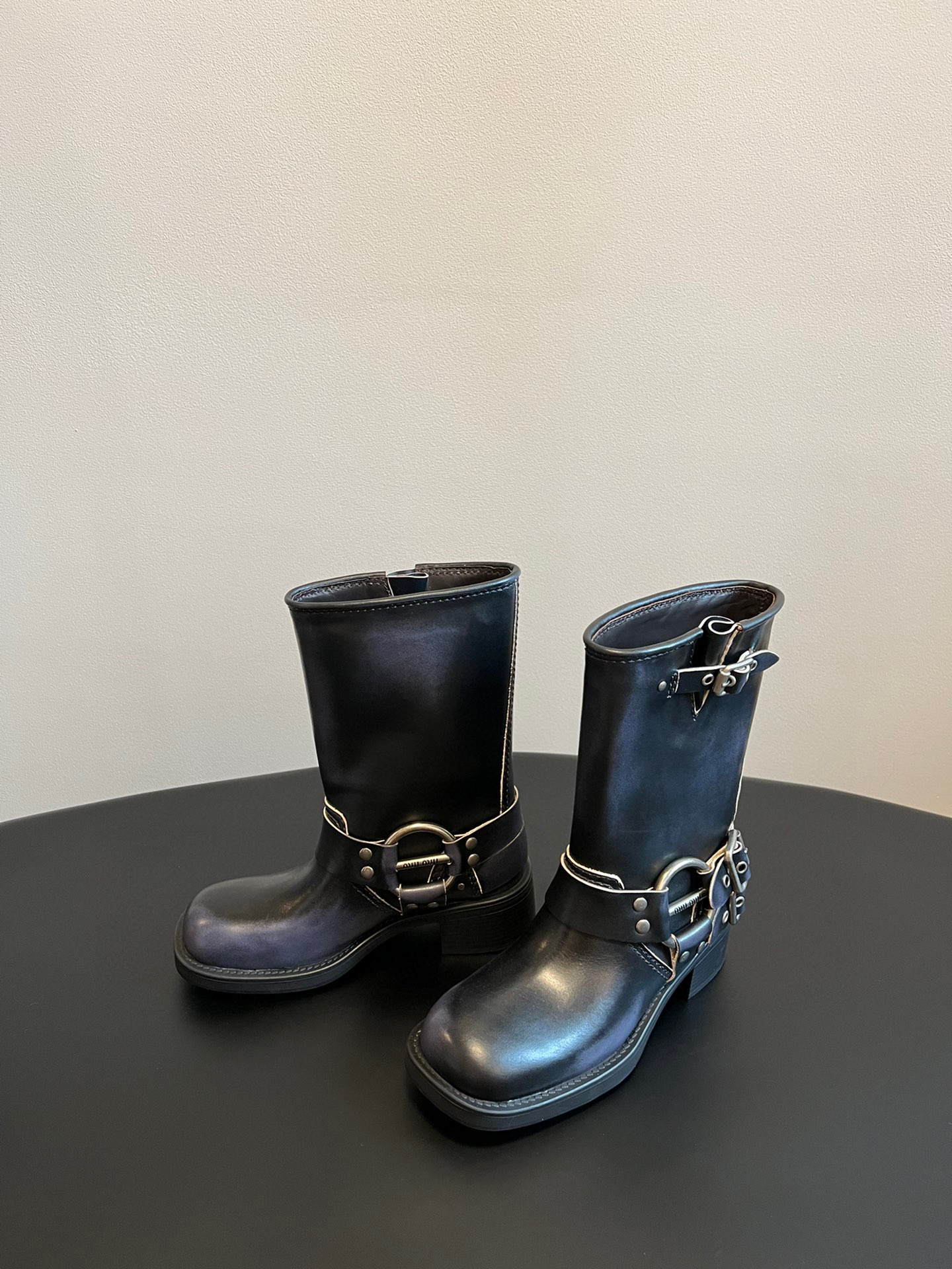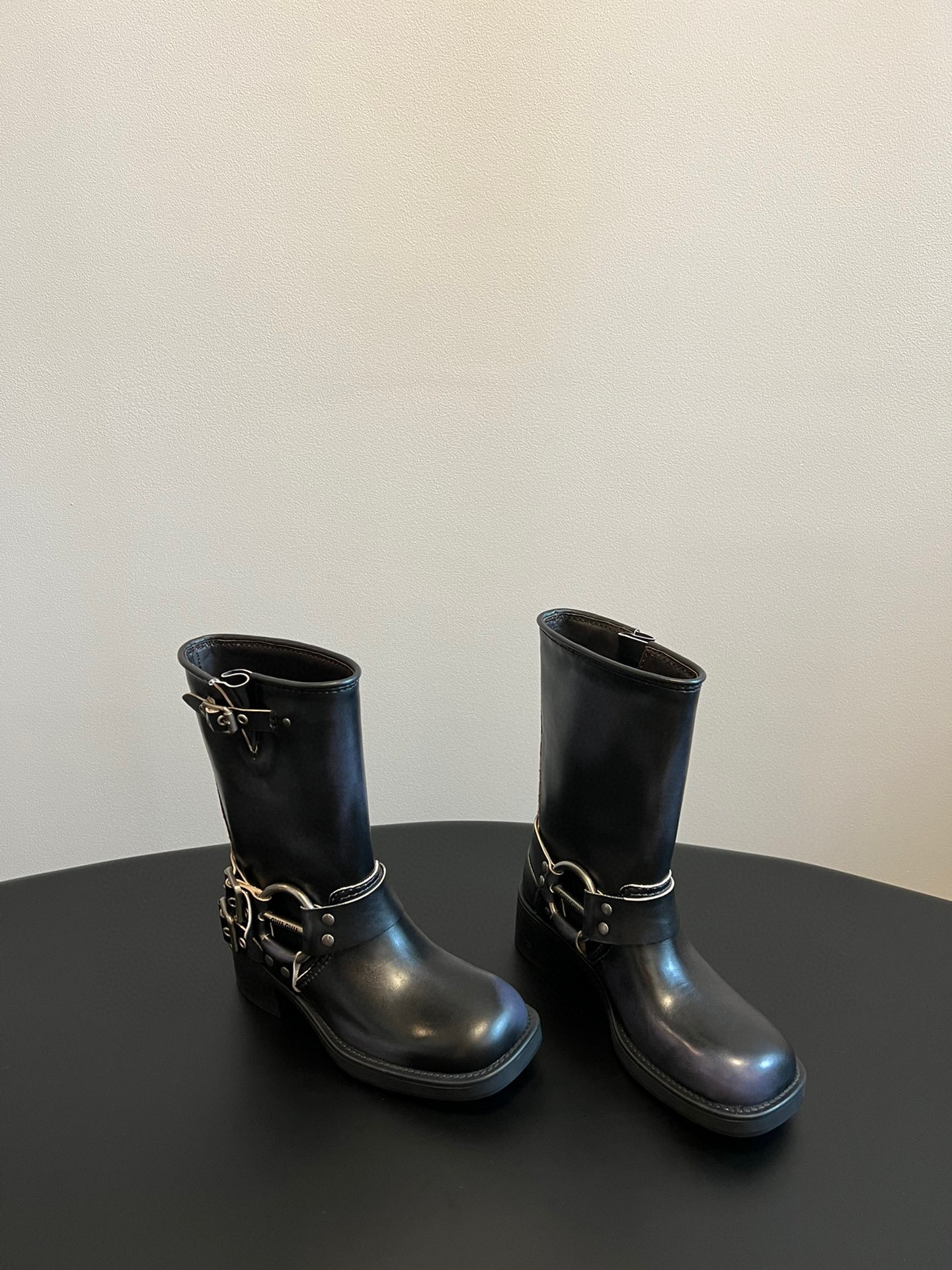 NIGO MiuMiu Women's Fall And Winter Two-Tone Cowhide/Suede Two-Buckle Nodel Mid-Calf Boots Shoes #nigo97265