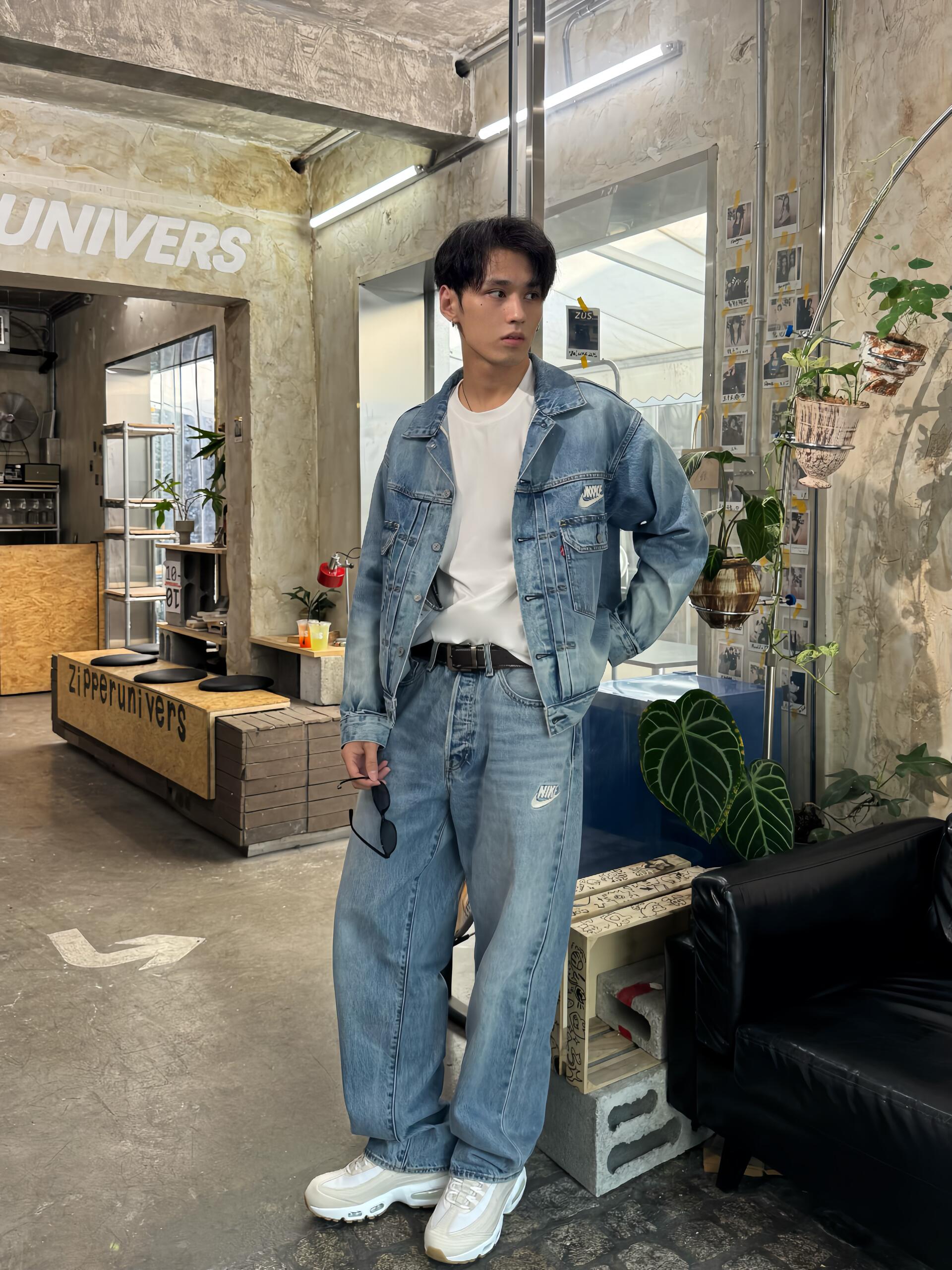 NIGO Nike x Levi's Men's Spring/fall Fashion Casual Loose Fit Single Breasted Collared Double Pocket Denim Jacket Letter Printed Loose Fit Casual Denim Pants Suit Set #nigo78496
