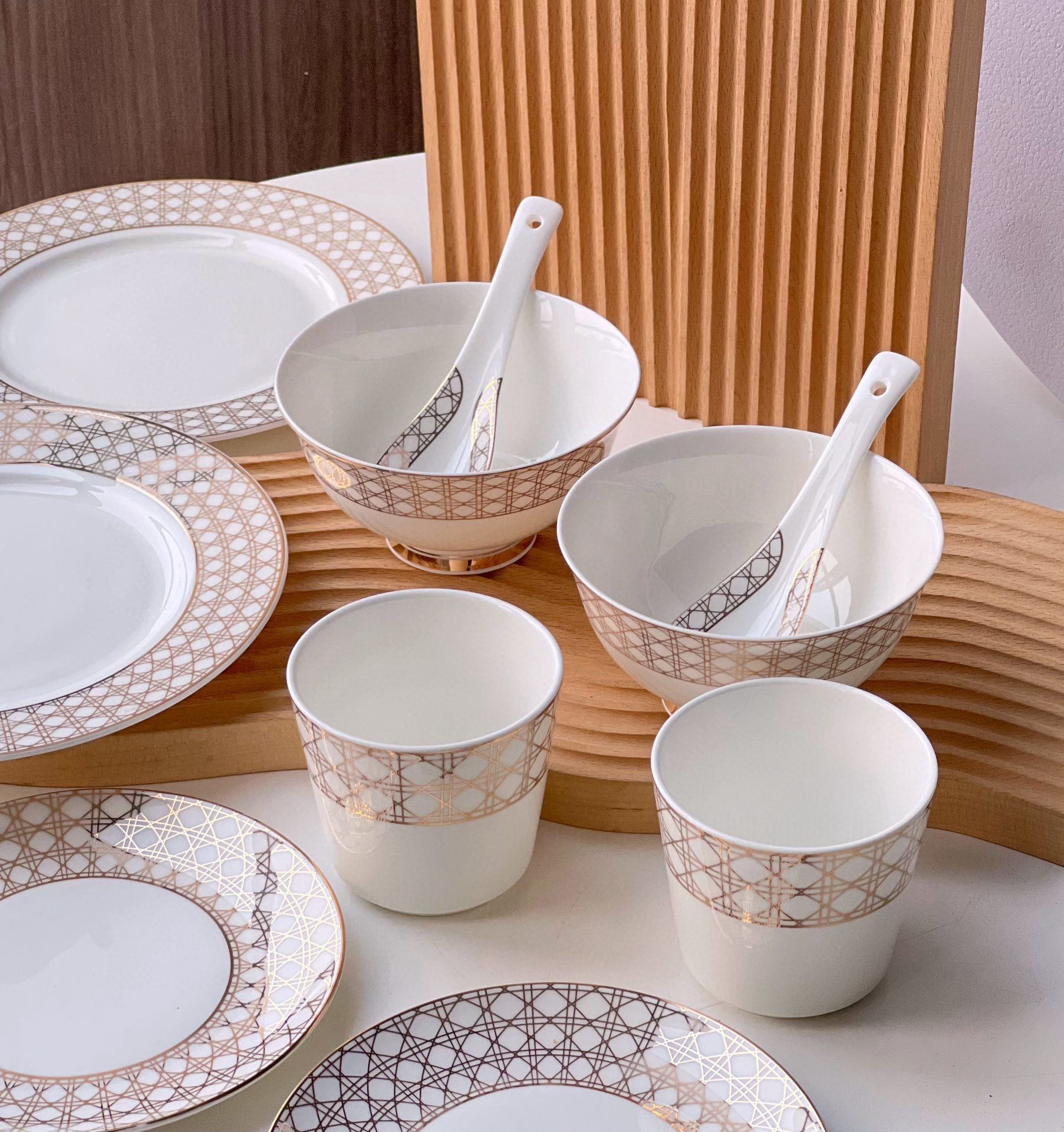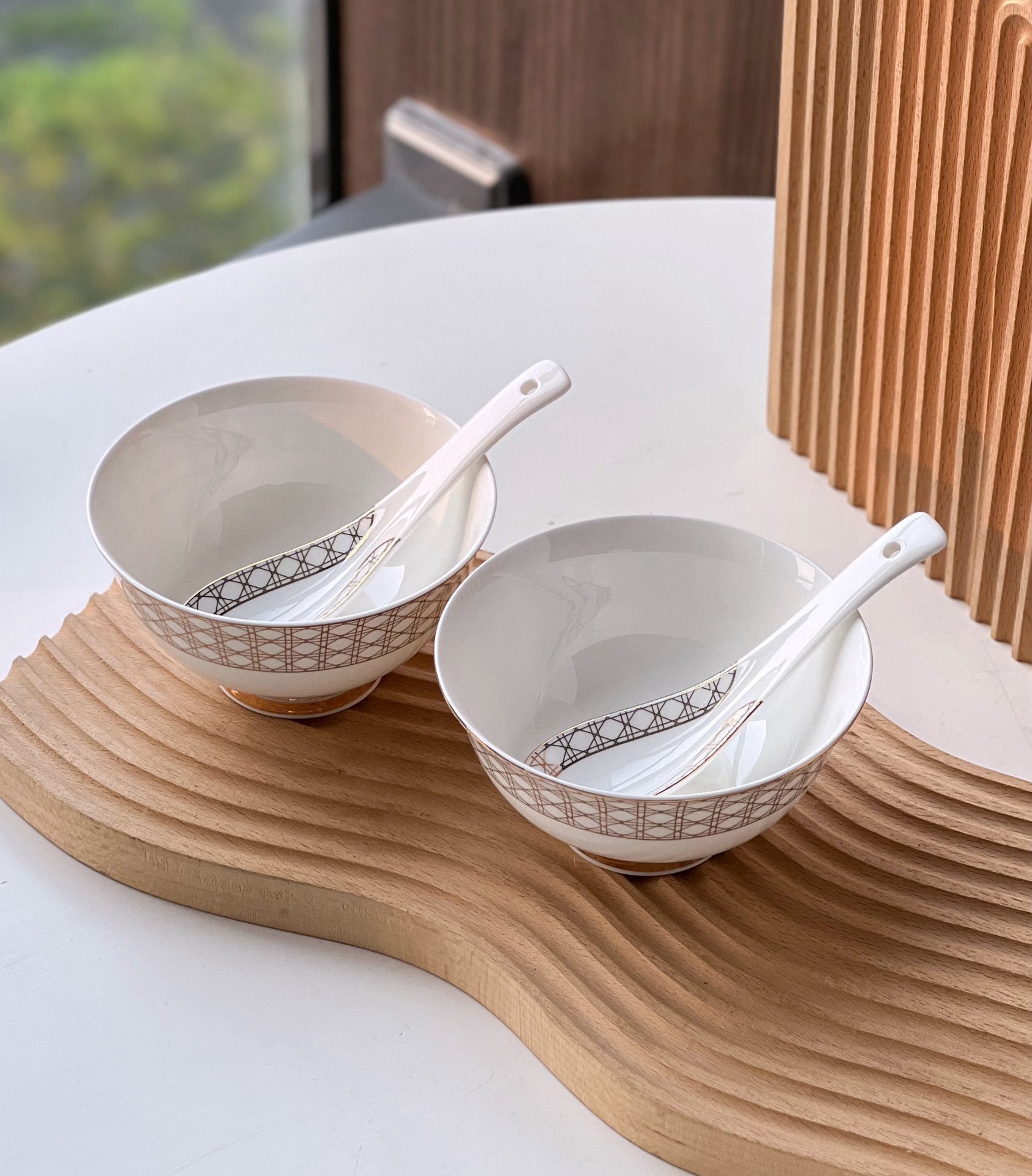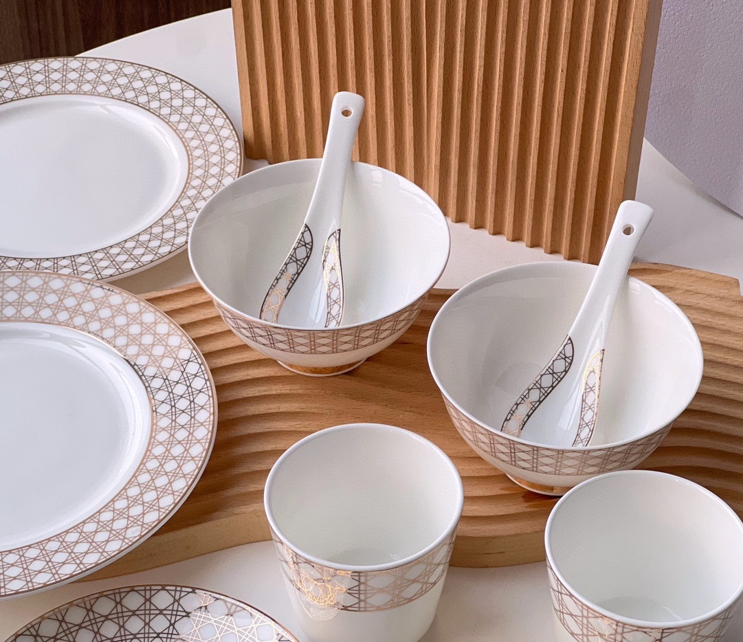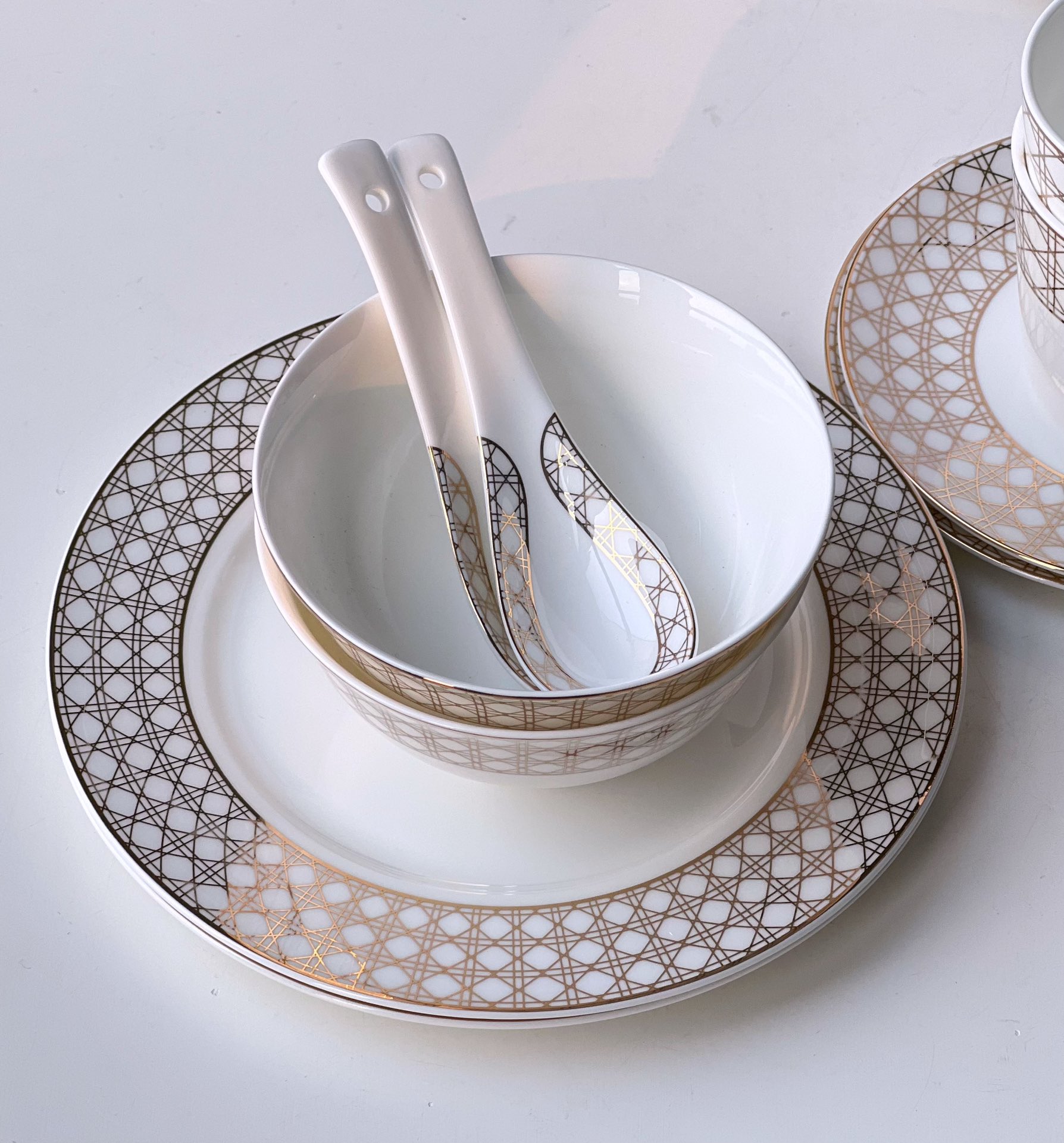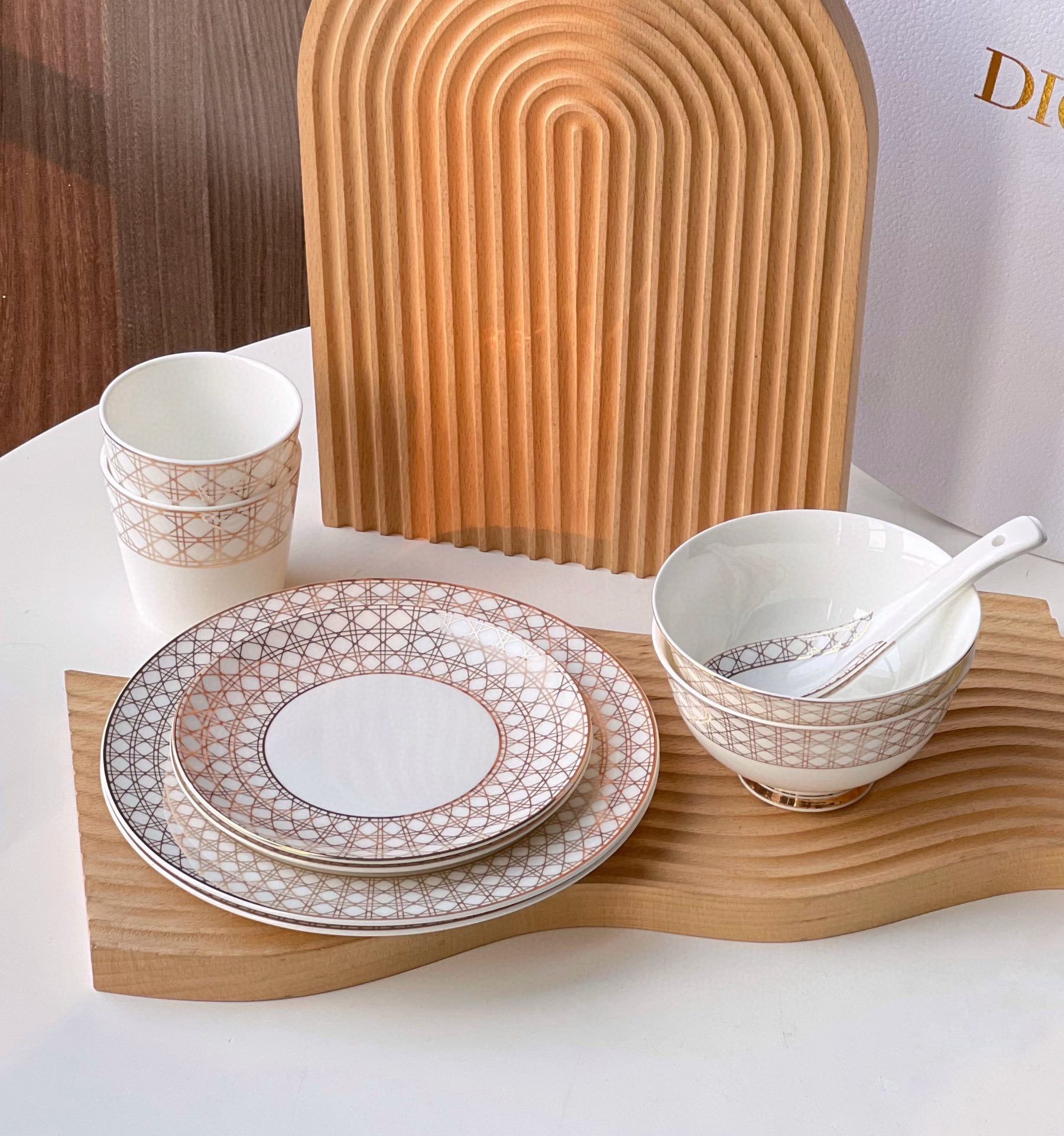 NIGO Dior European Simple Gold Lattice Pattern Bone China Tableware 10-piece Set Configuration: Flat Plate + Bone Plate + Rice Bowl + Soup Spoon + Cup [each 2 Pieces] With Gift Box Package #nigo73147
