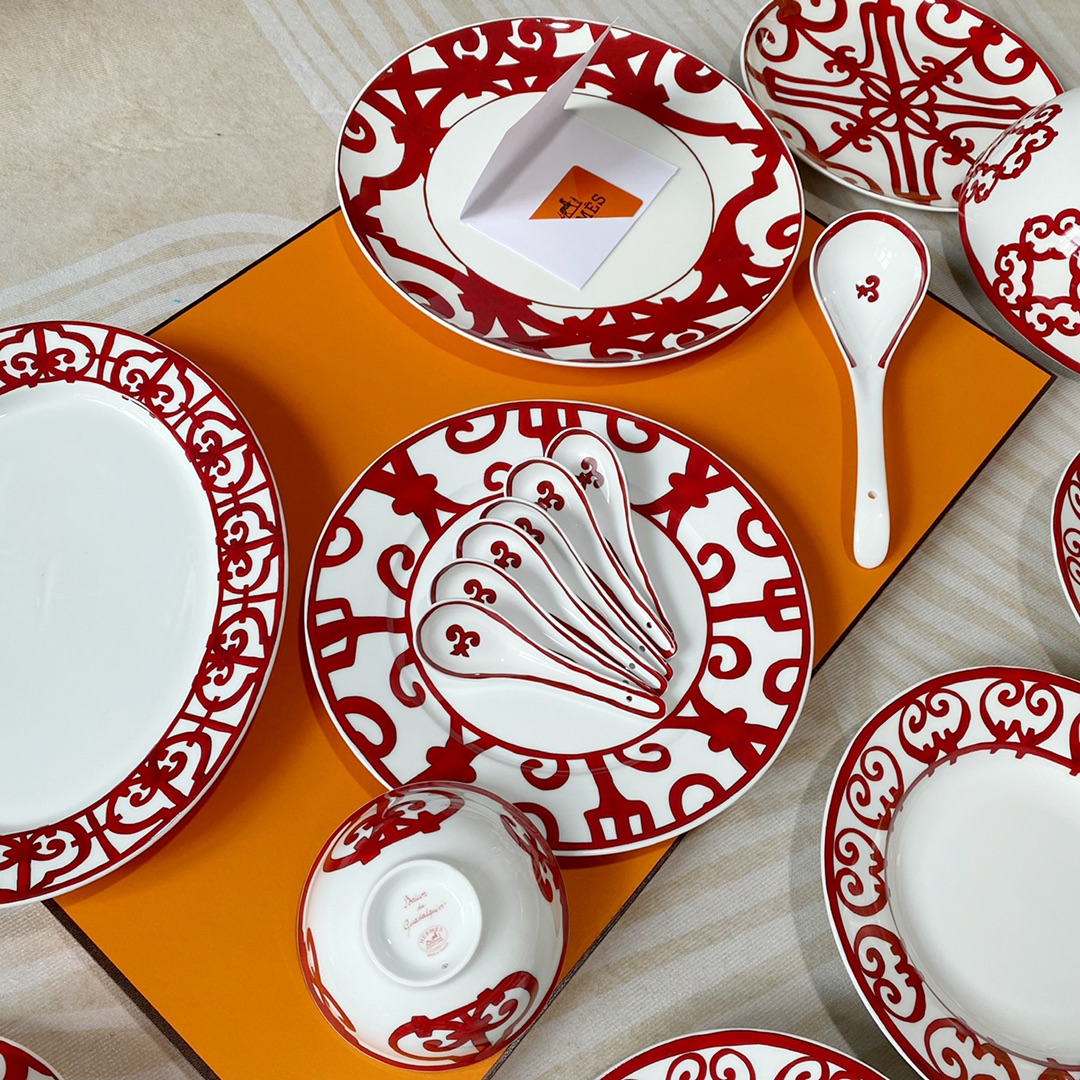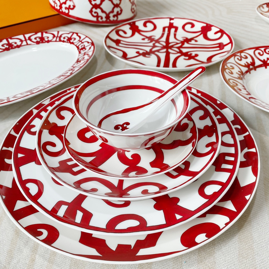 NIGO Hermes China Red Series Ceramic Dinner Plate, Bowl, Spoon, Teacup, 6-Person Set Accessories #nigo77263