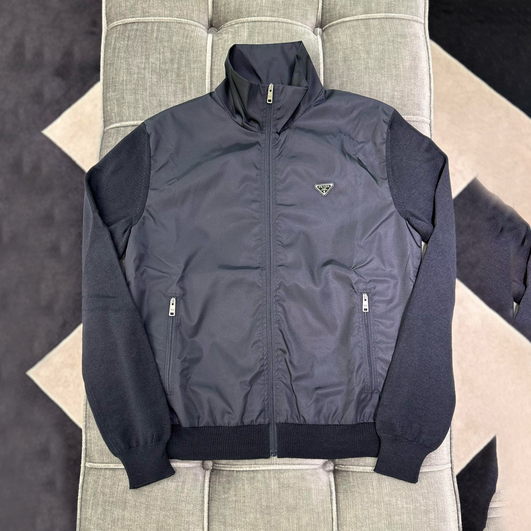 NIGO Prada Men's Spring/Fall Fashion Casual High Neck Zipper Triangle Logo Knit Patchwork Nylon Jacket #nigo79173