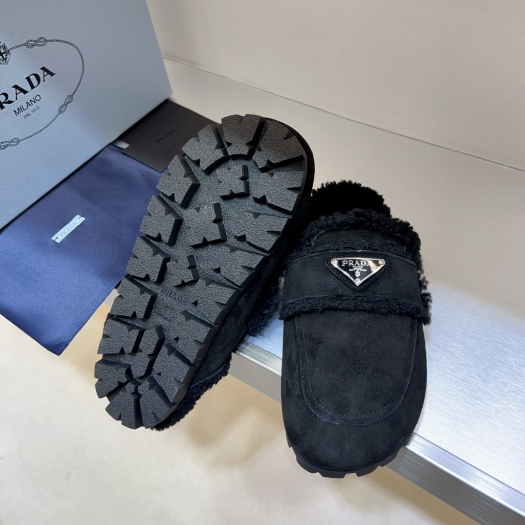 NIGO Prada Women's Fall/Winter Fashion Casual Round Toe Open Back Classic Logo Triangle Label Shearling Slippers Shoes #nigo79521