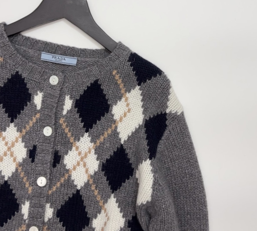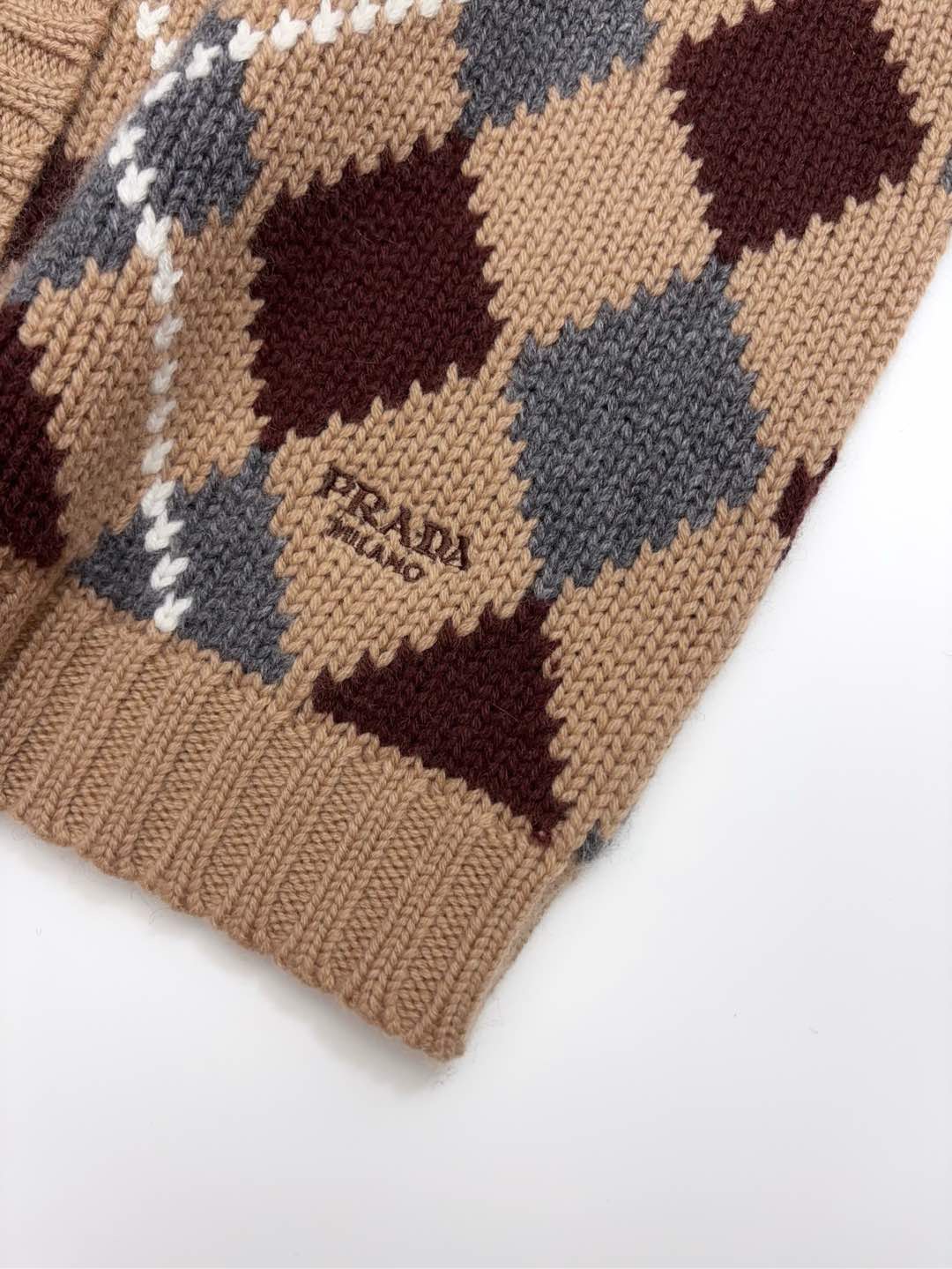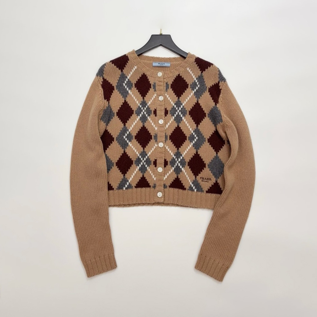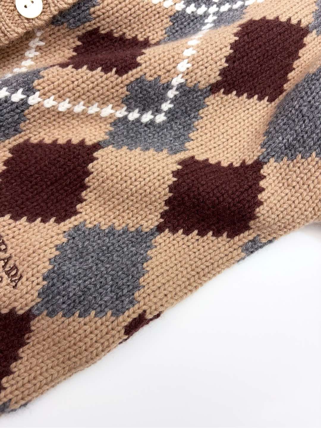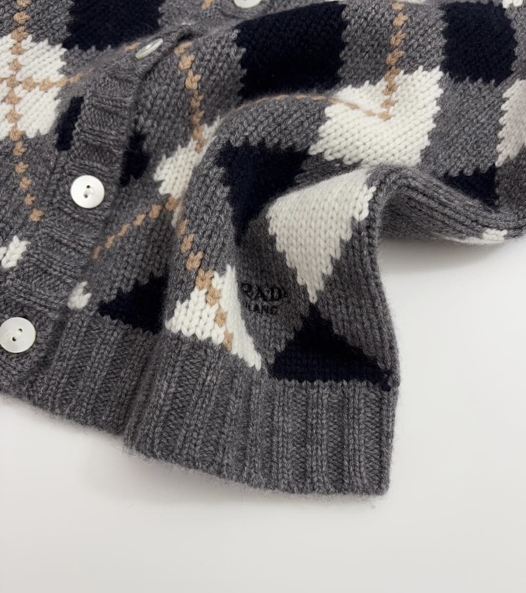 NIGO Prada Women's Spring/Fall Round Neck Single-Button Diamond-Pattern Cashmere Knit Cardigan with Letter Embroidery Long Sleeve Cropped Cardigan #nigo78839