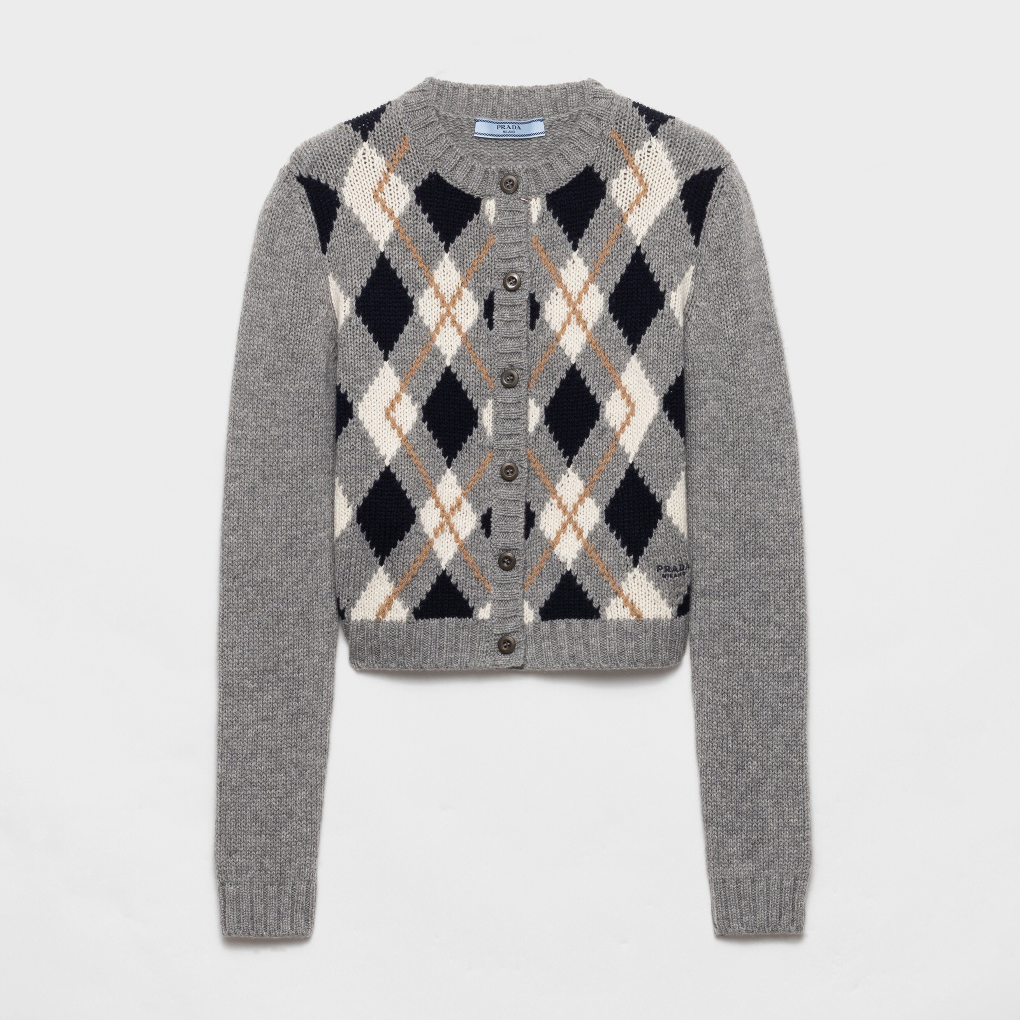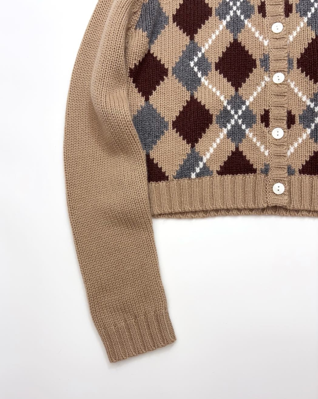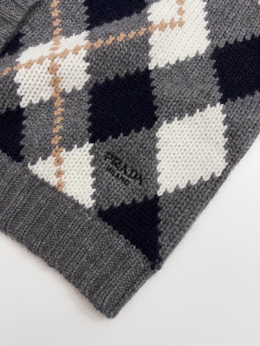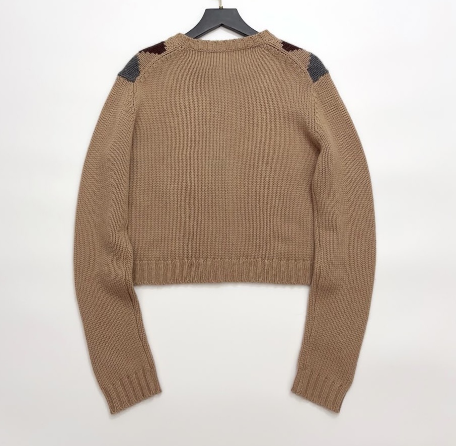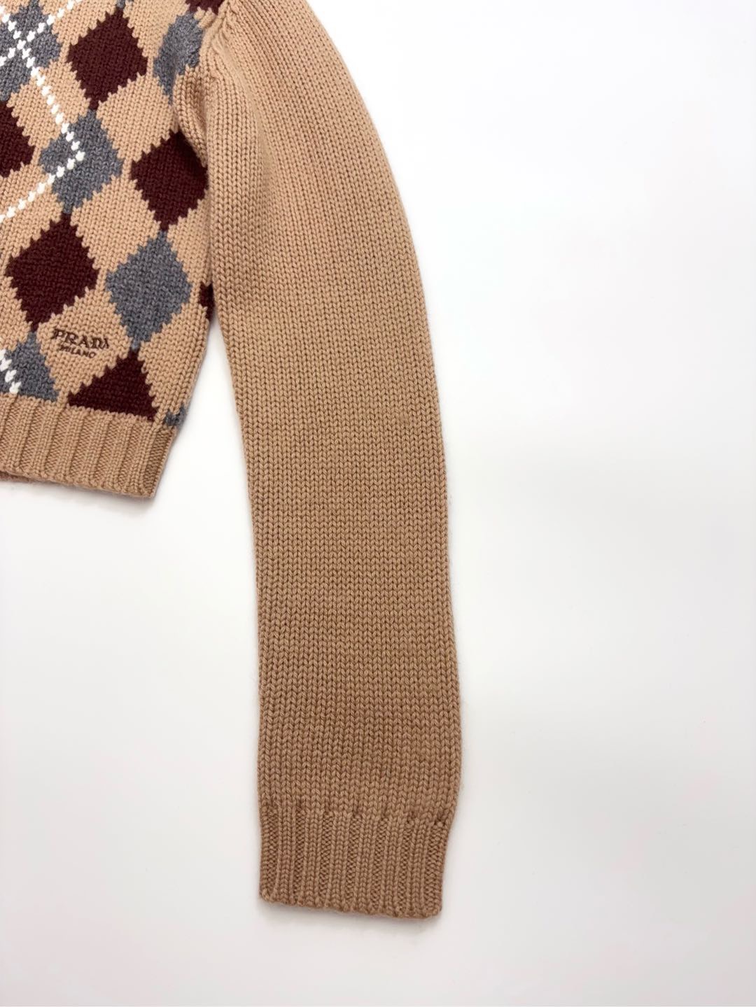 NIGO Prada Women's Spring/Fall Round Neck Single-Button Diamond-Pattern Cashmere Knit Cardigan with Letter Embroidery Long Sleeve Cropped Cardigan #nigo78839