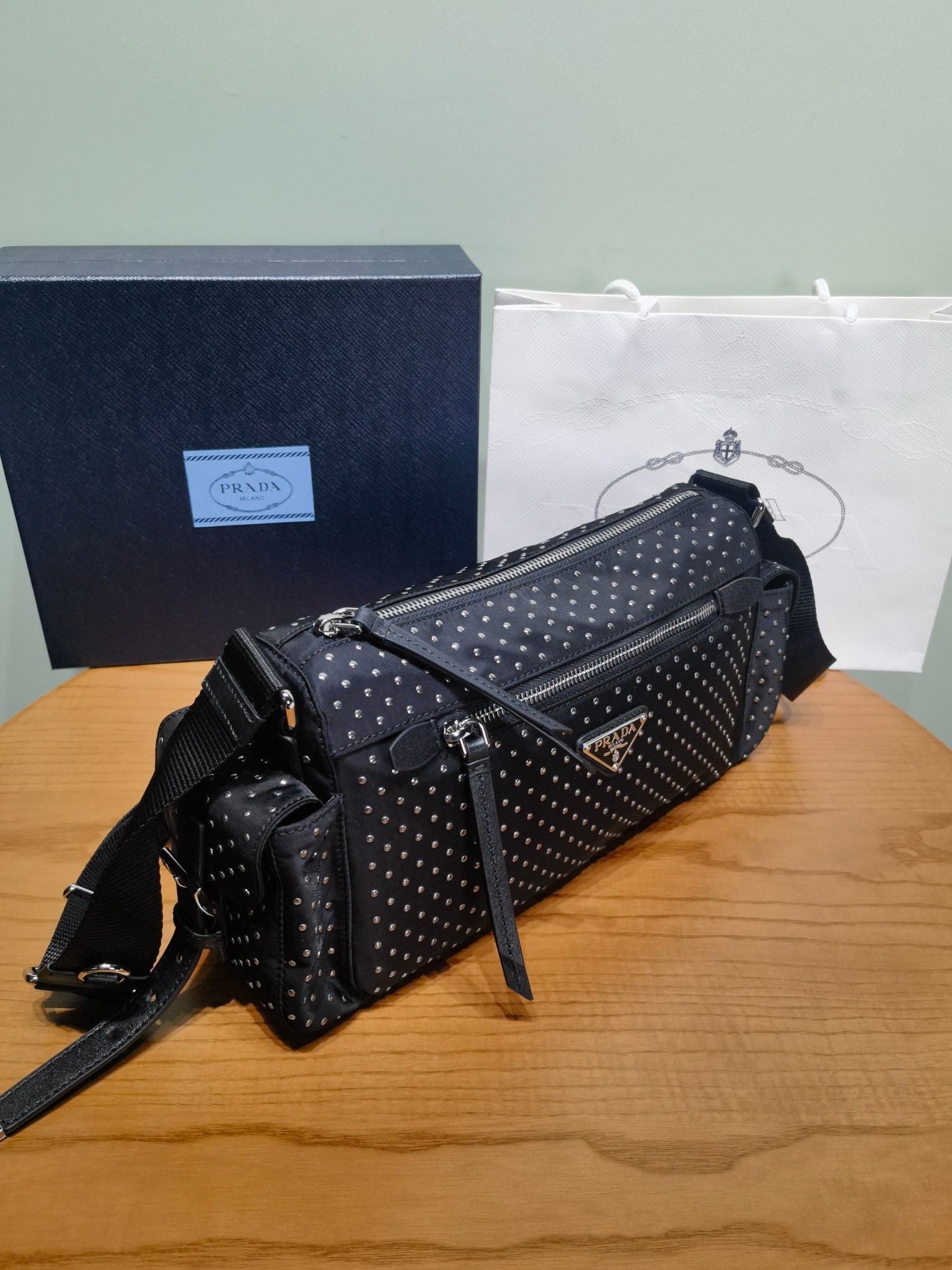 NIGO Prada Women's Metal Triangle Label Zipper Closure Rivet Finish Nylon Shoulder Crossbody Bag Bags #nigo74989