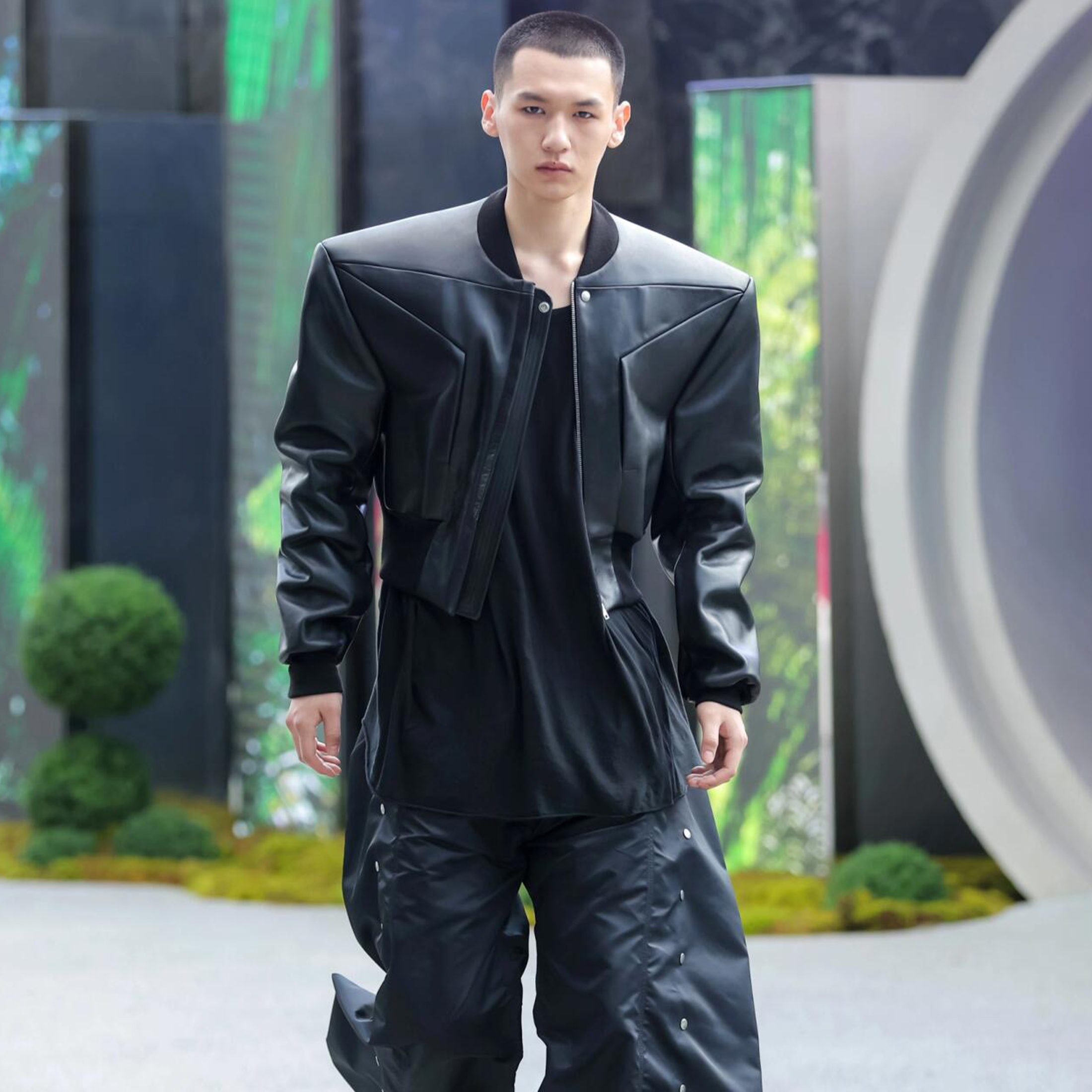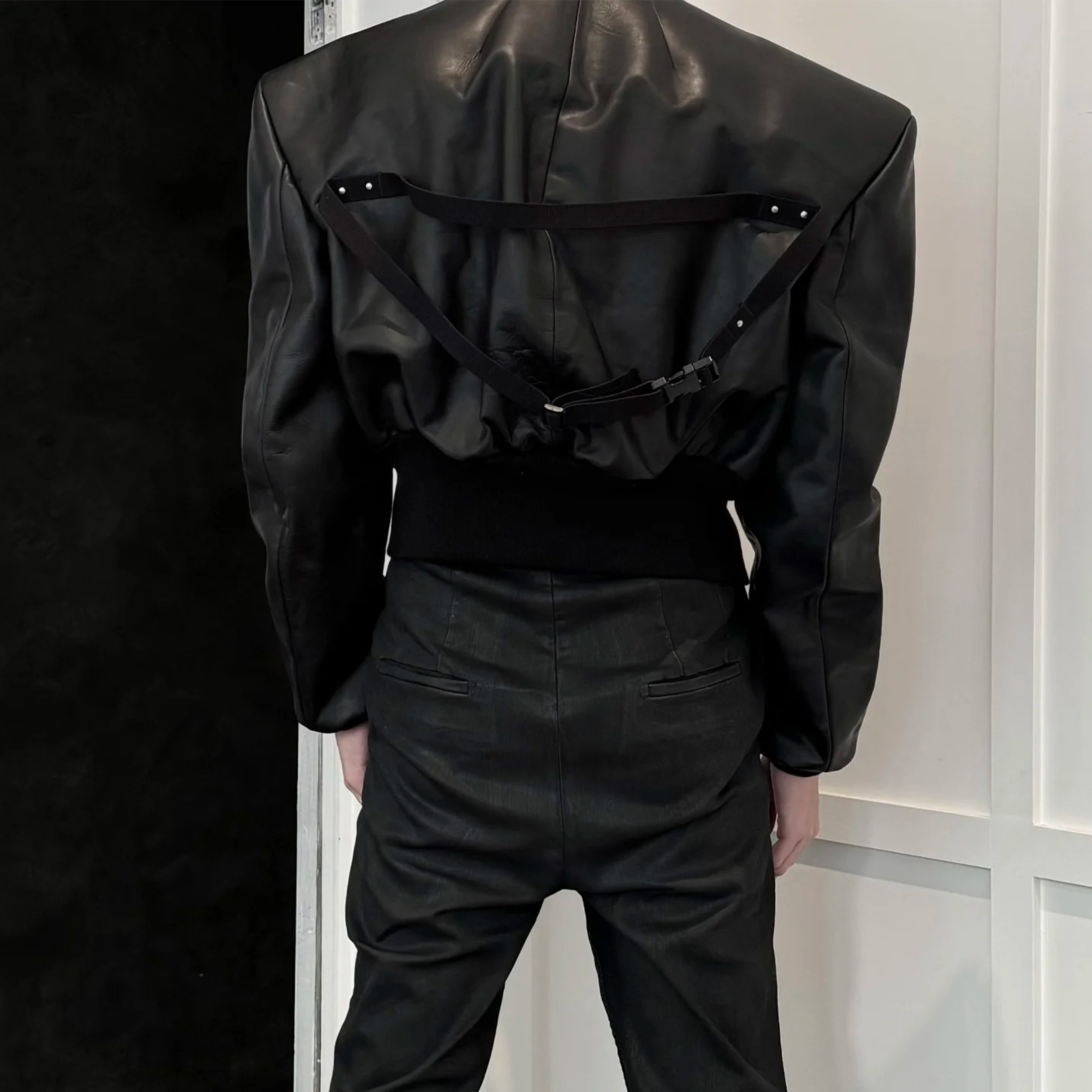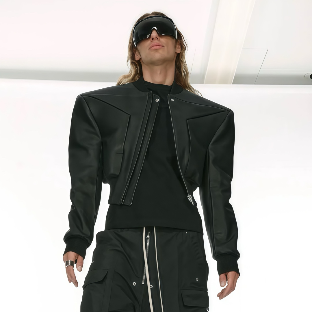 NIGO Rick Owens Men's Spring And Autumn Standing Collar Short Shoulder Padded Leather Jacket High Street Hip Hop Zip Long Sleeve Leather Jacket Ngvp #nigo9828
