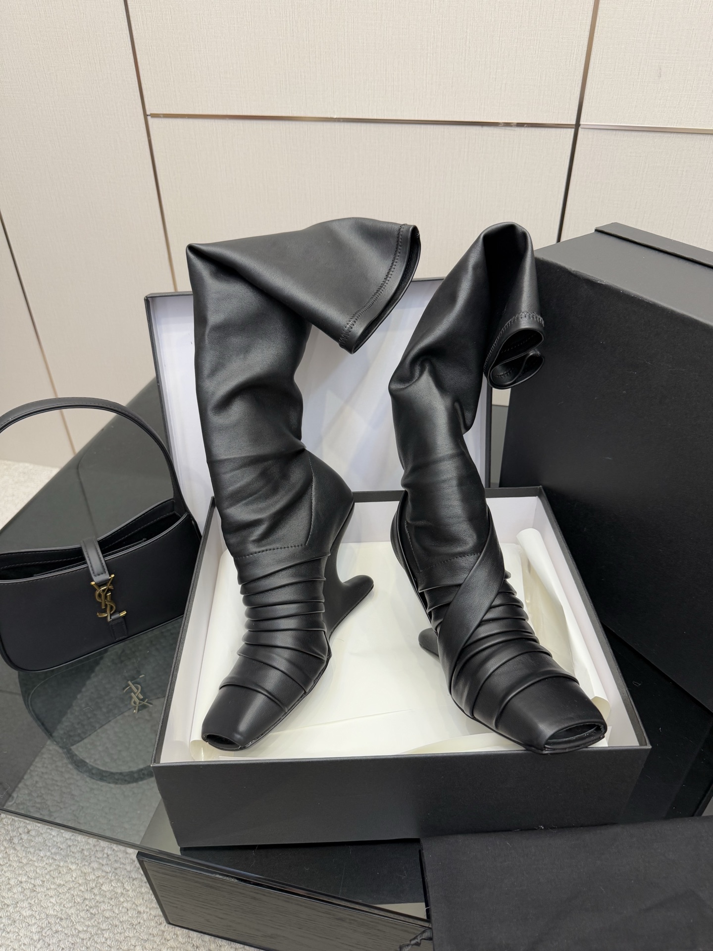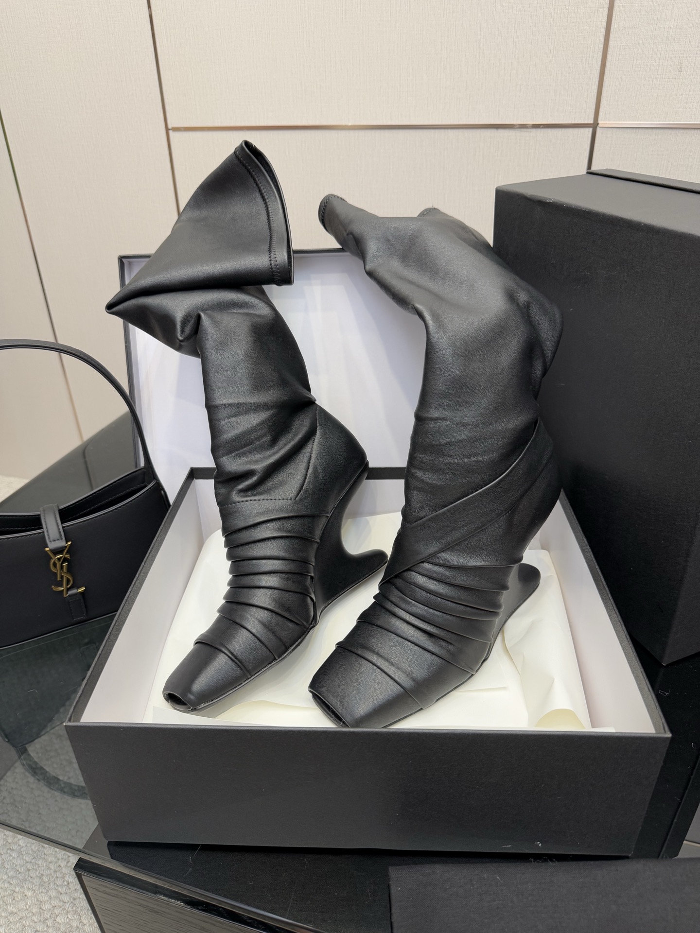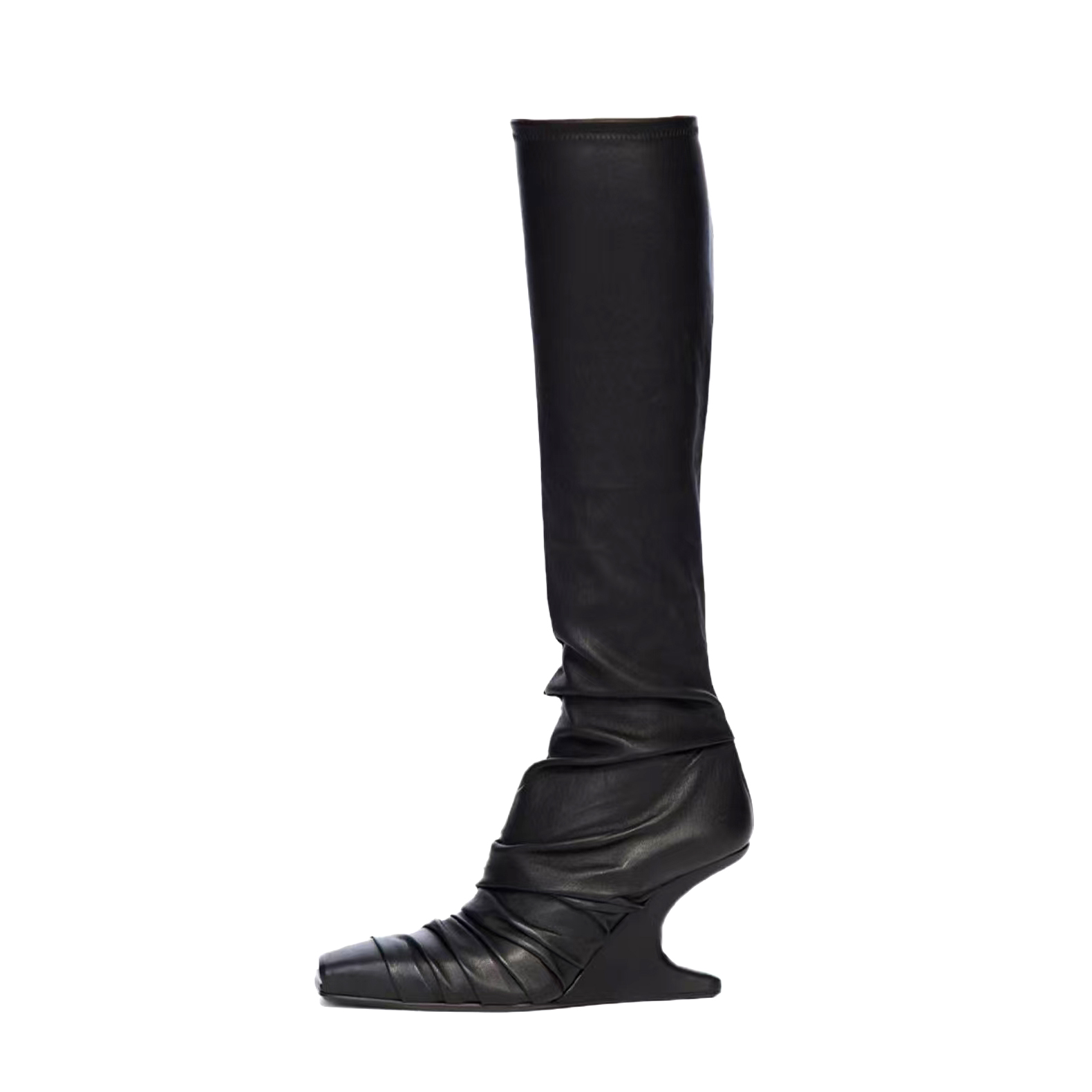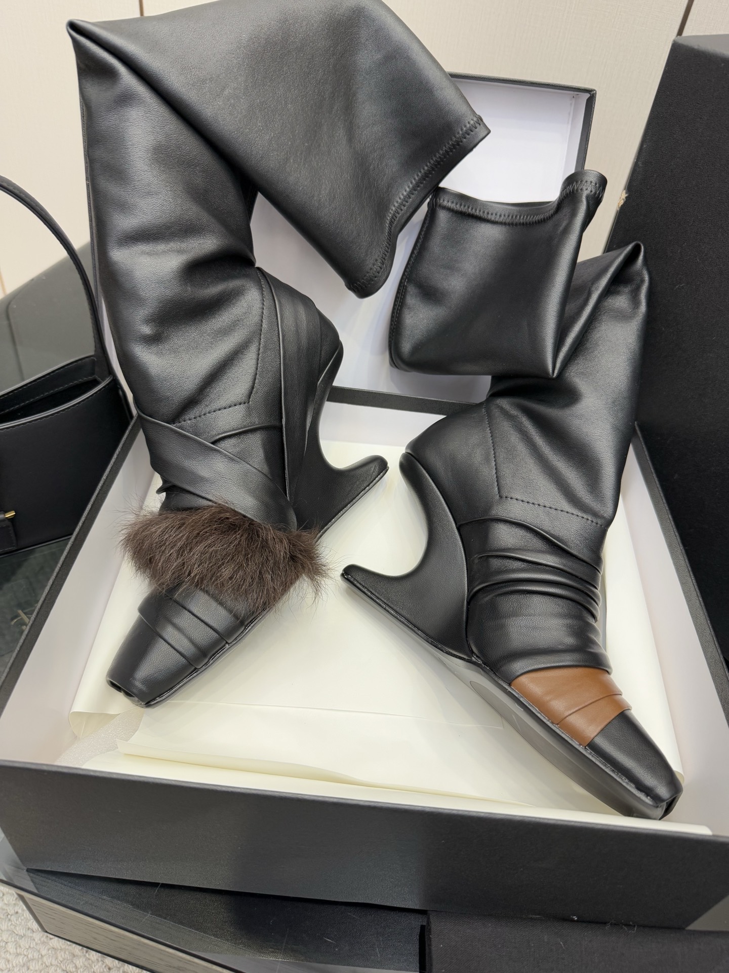 NIGO Rick Owens Women's Fall/Winter Fashion Classic Leather Booties Cowhide and Sheepskin Blend in Brown Lambskin Fishmouth Square Toe Design Fur Trimmed Panels Long Boots Shoes #nigo79497