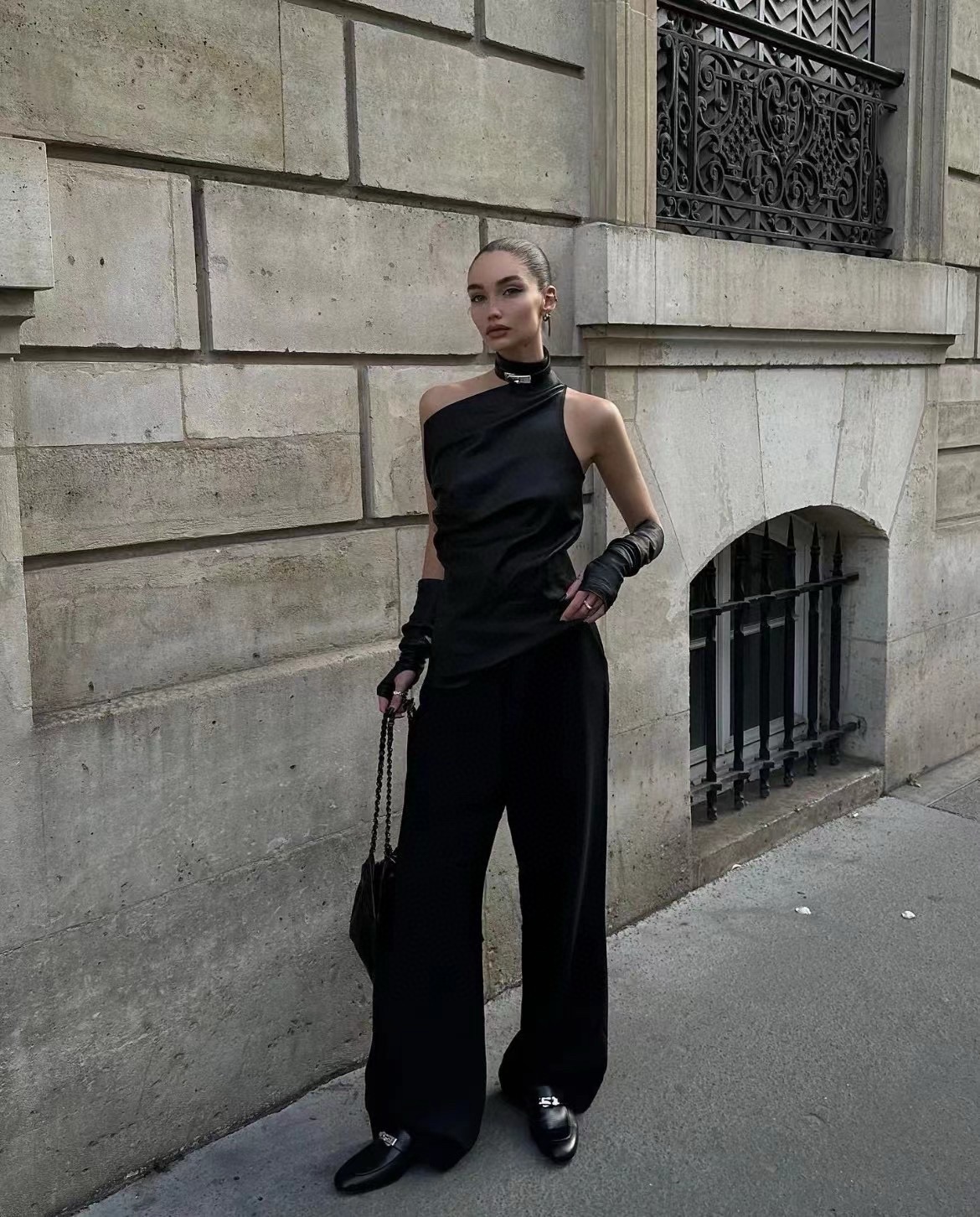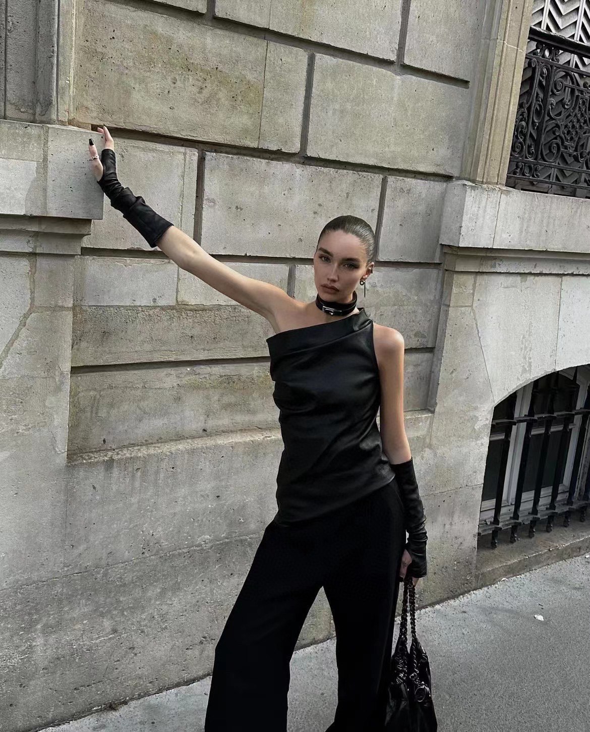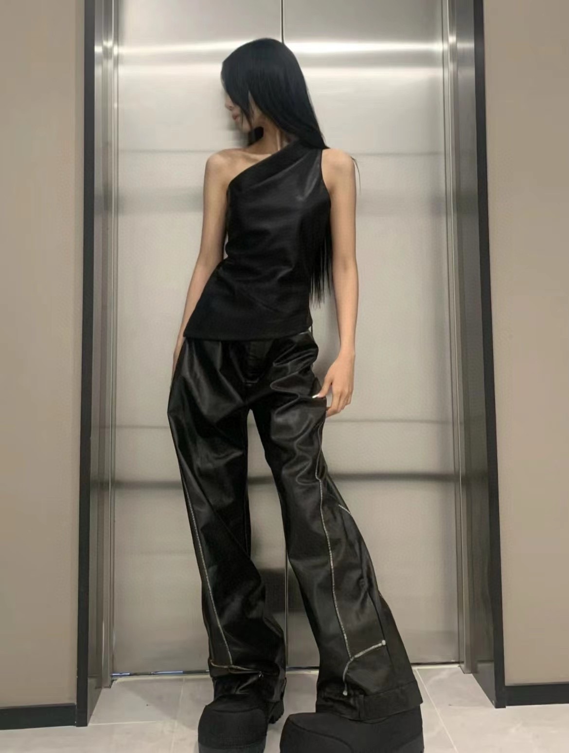 NIGO Rick Owens Women's Summer Lambskin One Shoulder Sleeveless Slim Black Top Shirt Ngvp #nigo9175