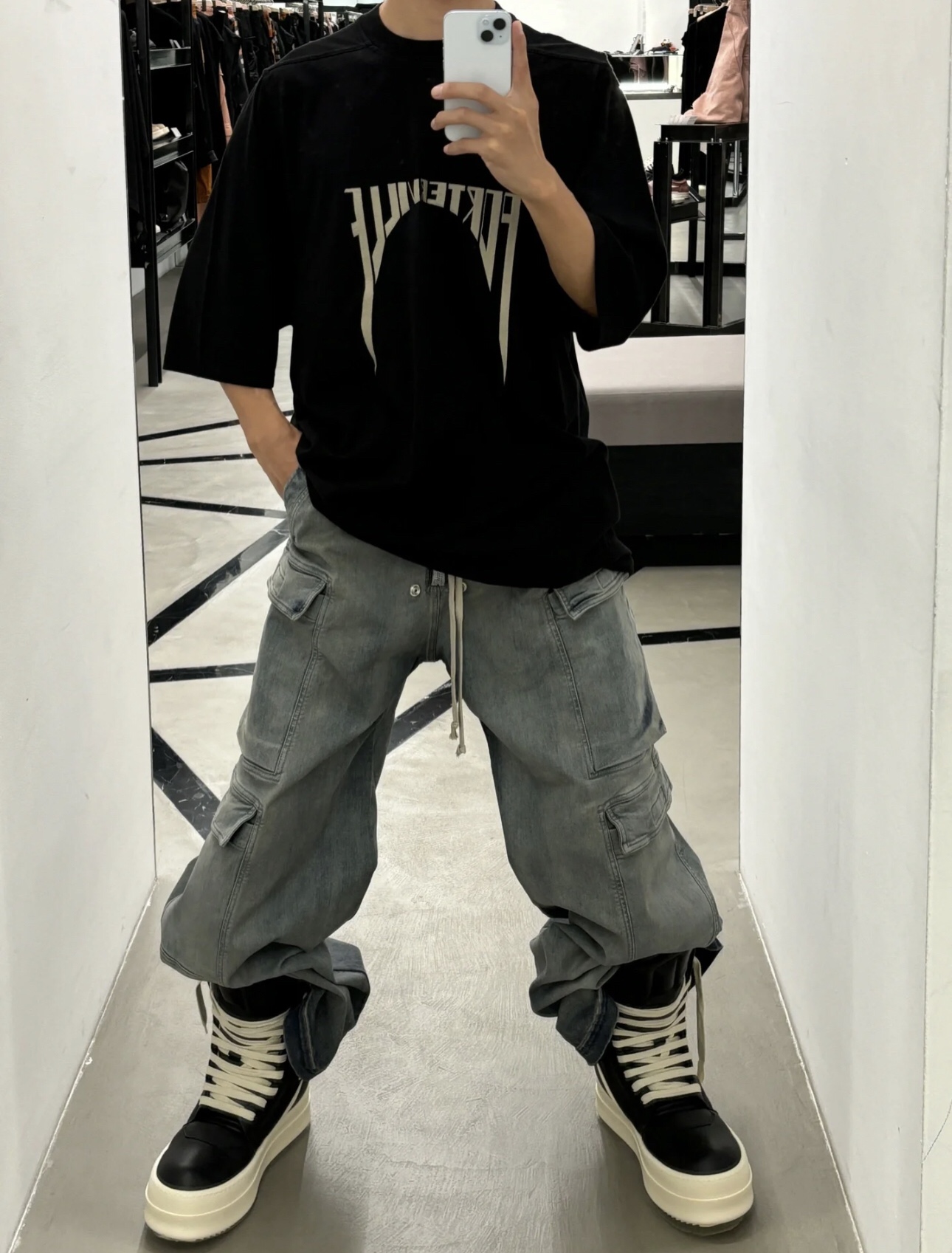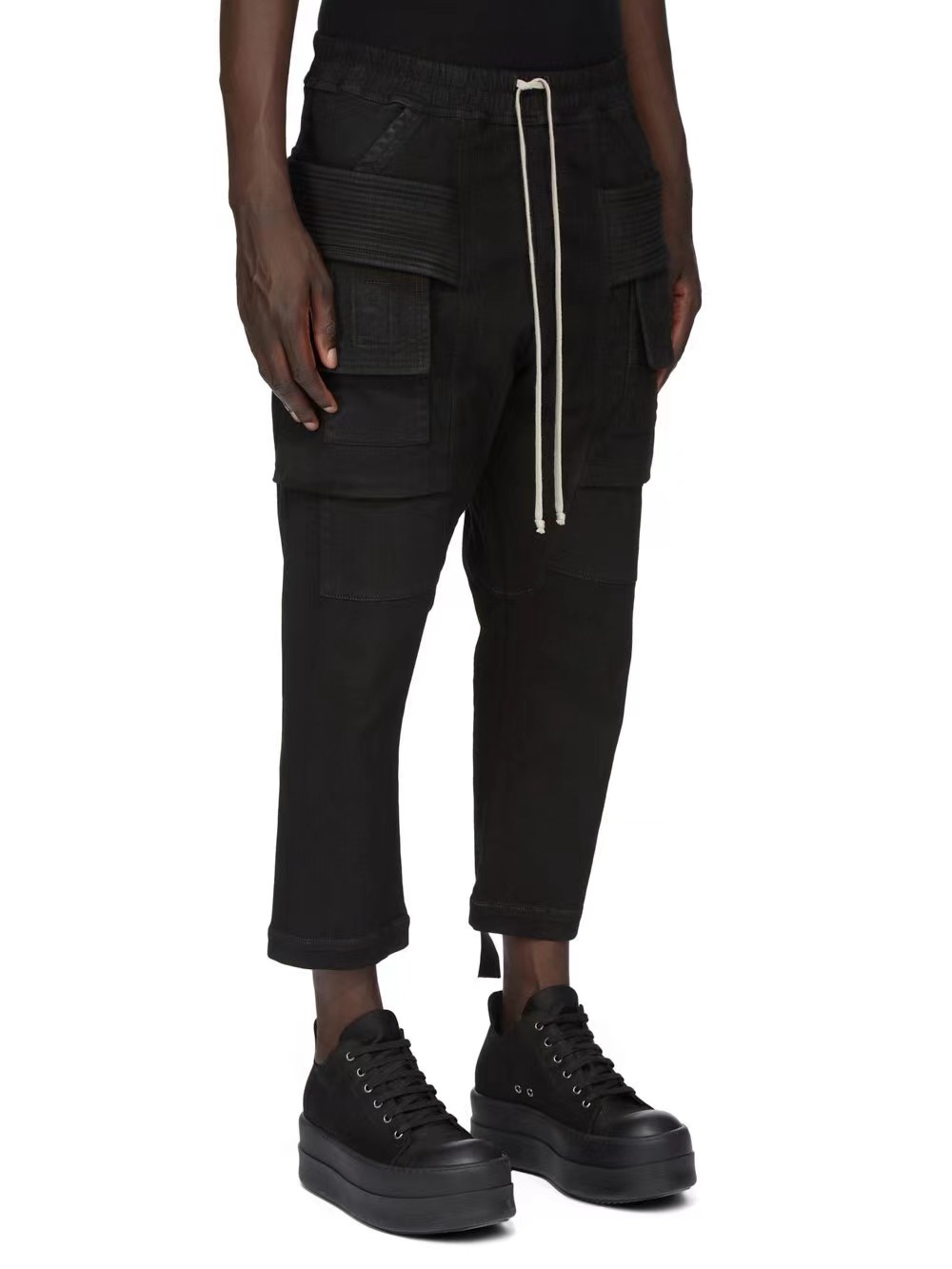 NIGO Rick Owens Men's Spring and Autumn Black Large Pocket Cotton Lace-Up Casual Work Pants #nigo73375