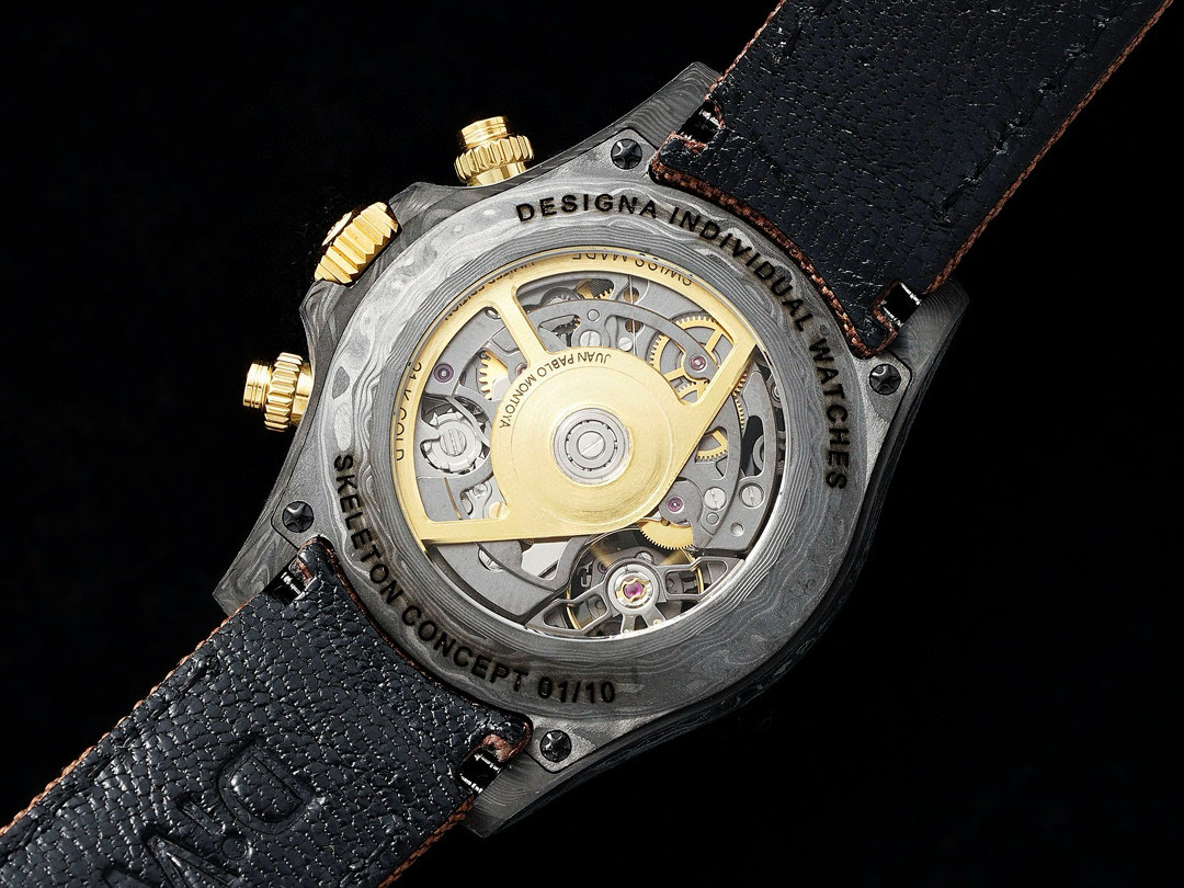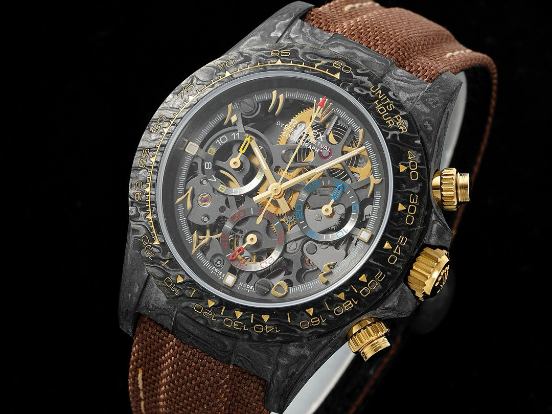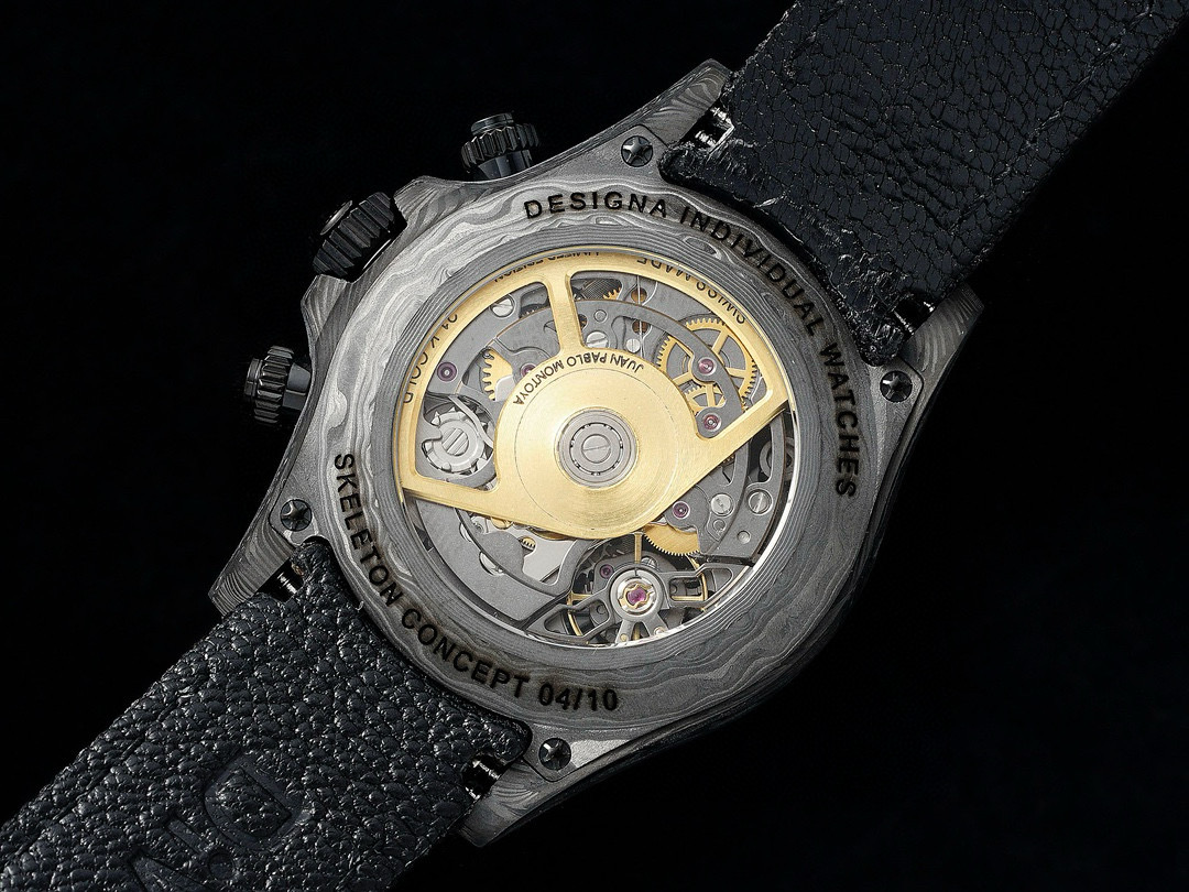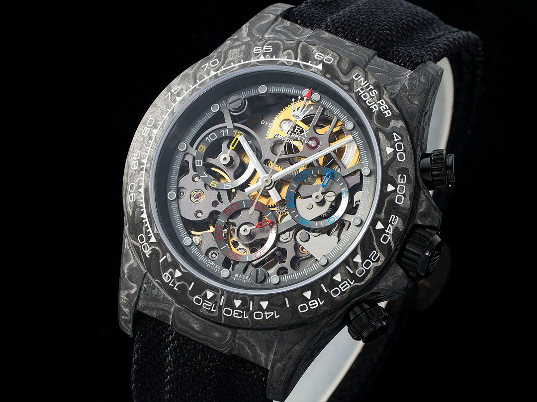 The Diw Carbon Fibre Daytona presents the new "column wheel" Cal.4130 skeletonised movement, undoubtedly the best chronograph calibre available today, with legendary performance and an original architecture containing far fewer parts than a standard chronograph movement, thus increasing its reliability. The movement is anthracite grey with a matte black skeleton, making the whole watch lighter, and the avant-garde skeleton dial design allows you to see the gears turning!