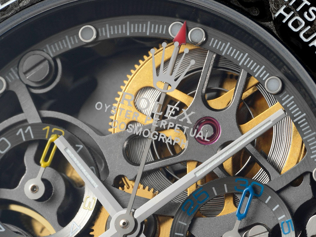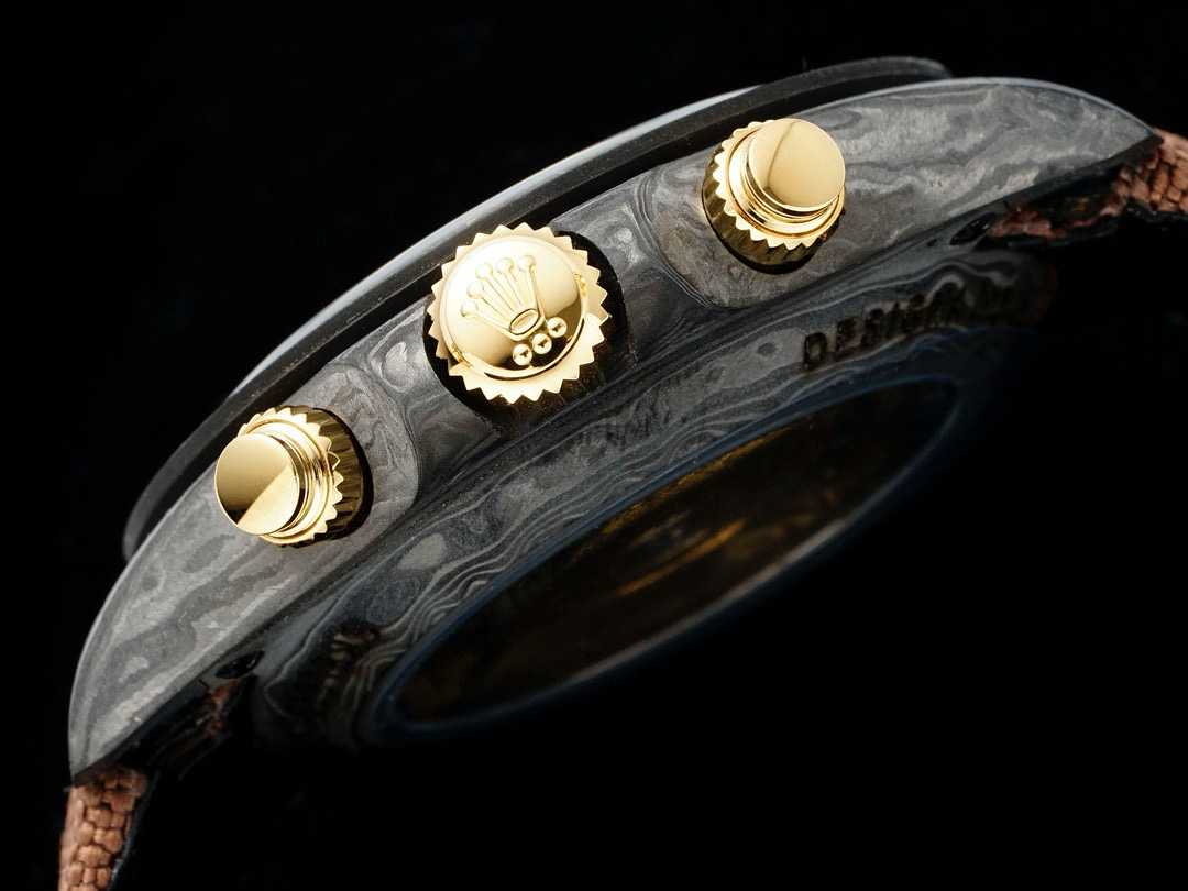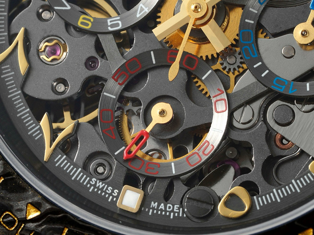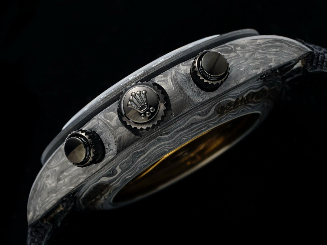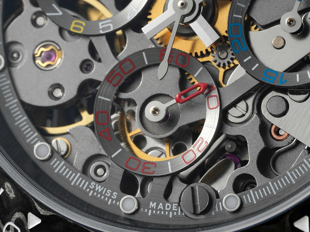 The Diw Carbon Fibre Daytona presents the new "column wheel" Cal.4130 skeletonised movement, undoubtedly the best chronograph calibre available today, with legendary performance and an original architecture containing far fewer parts than a standard chronograph movement, thus increasing its reliability. The movement is anthracite grey with a matte black skeleton, making the whole watch lighter, and the avant-garde skeleton dial design allows you to see the gears turning!