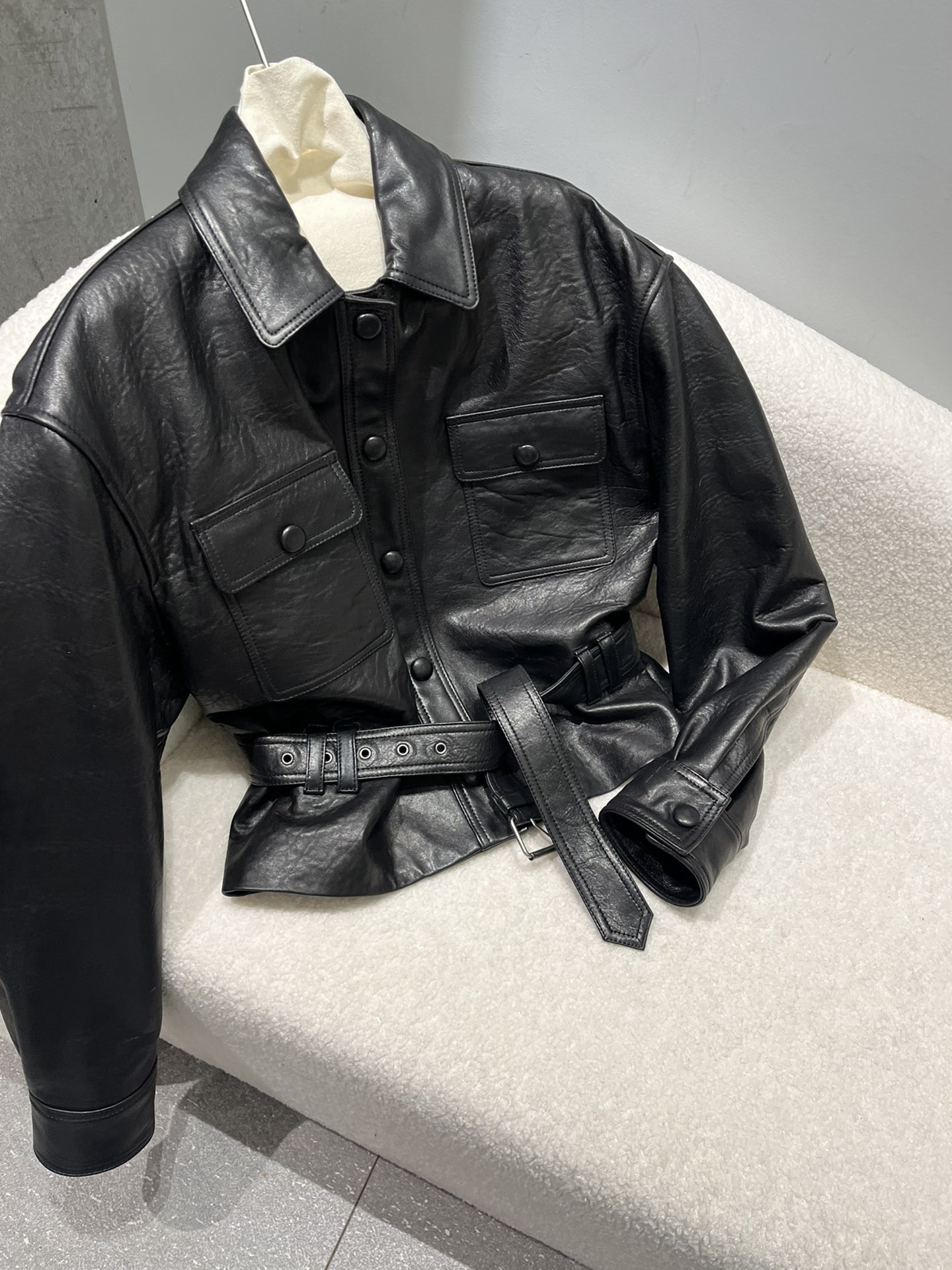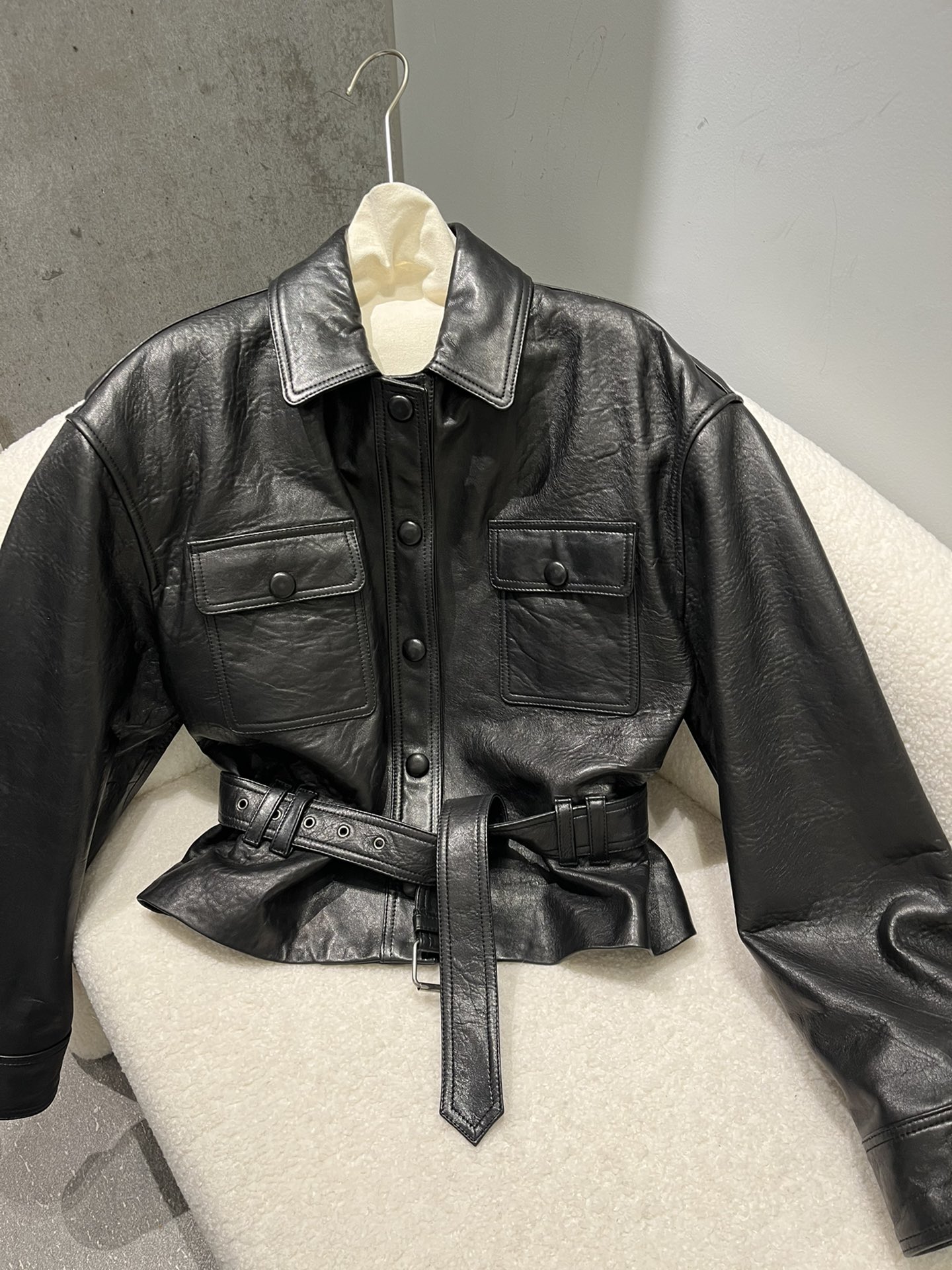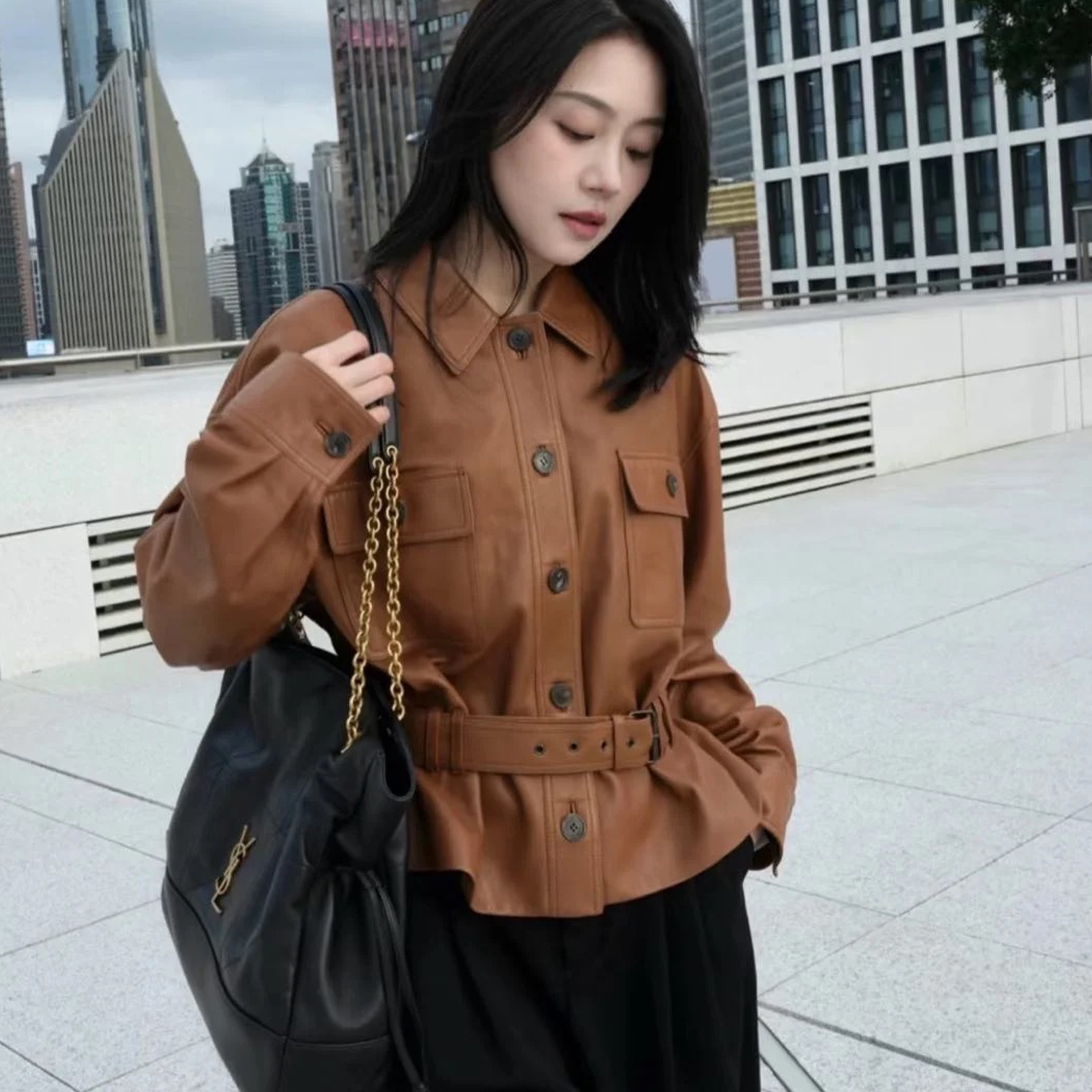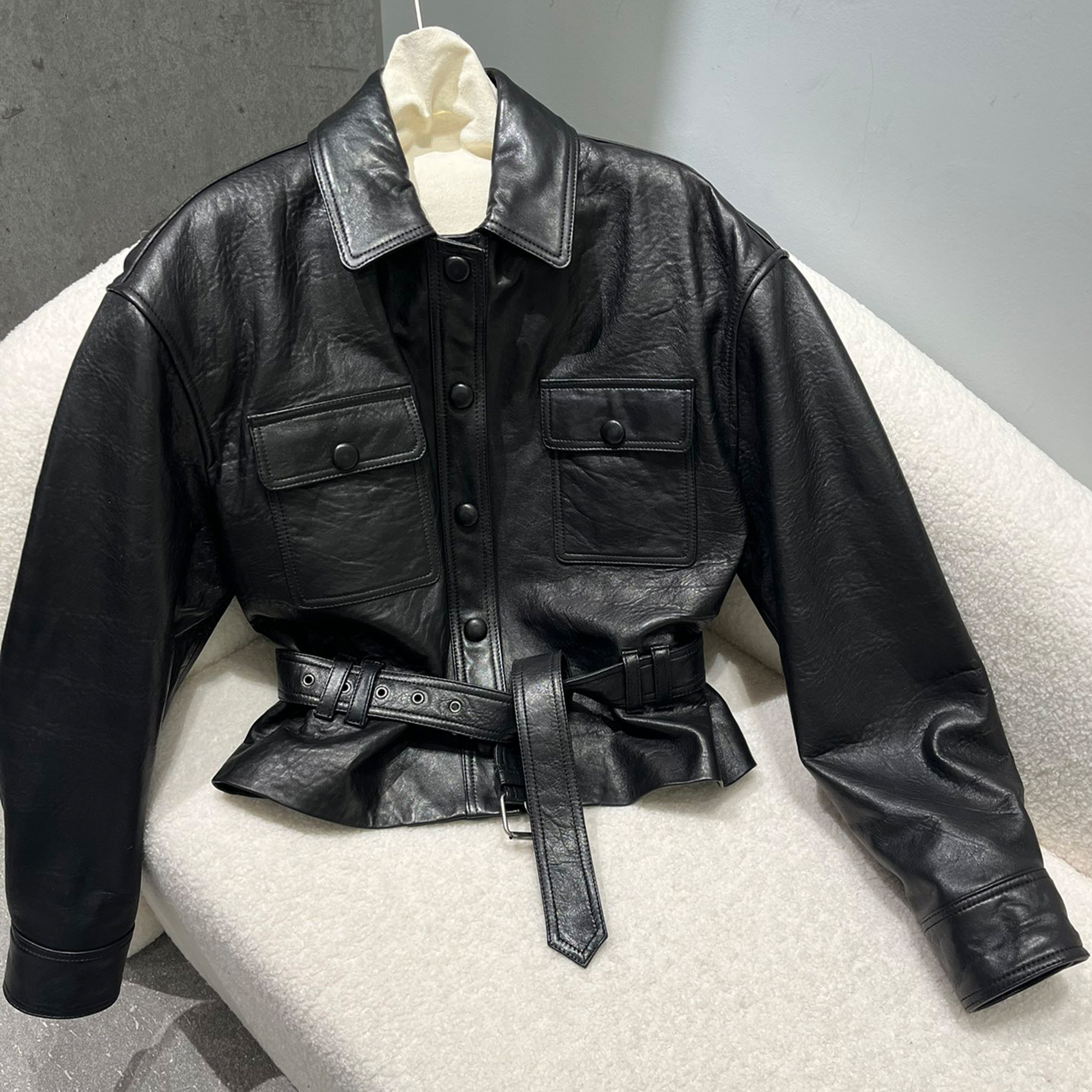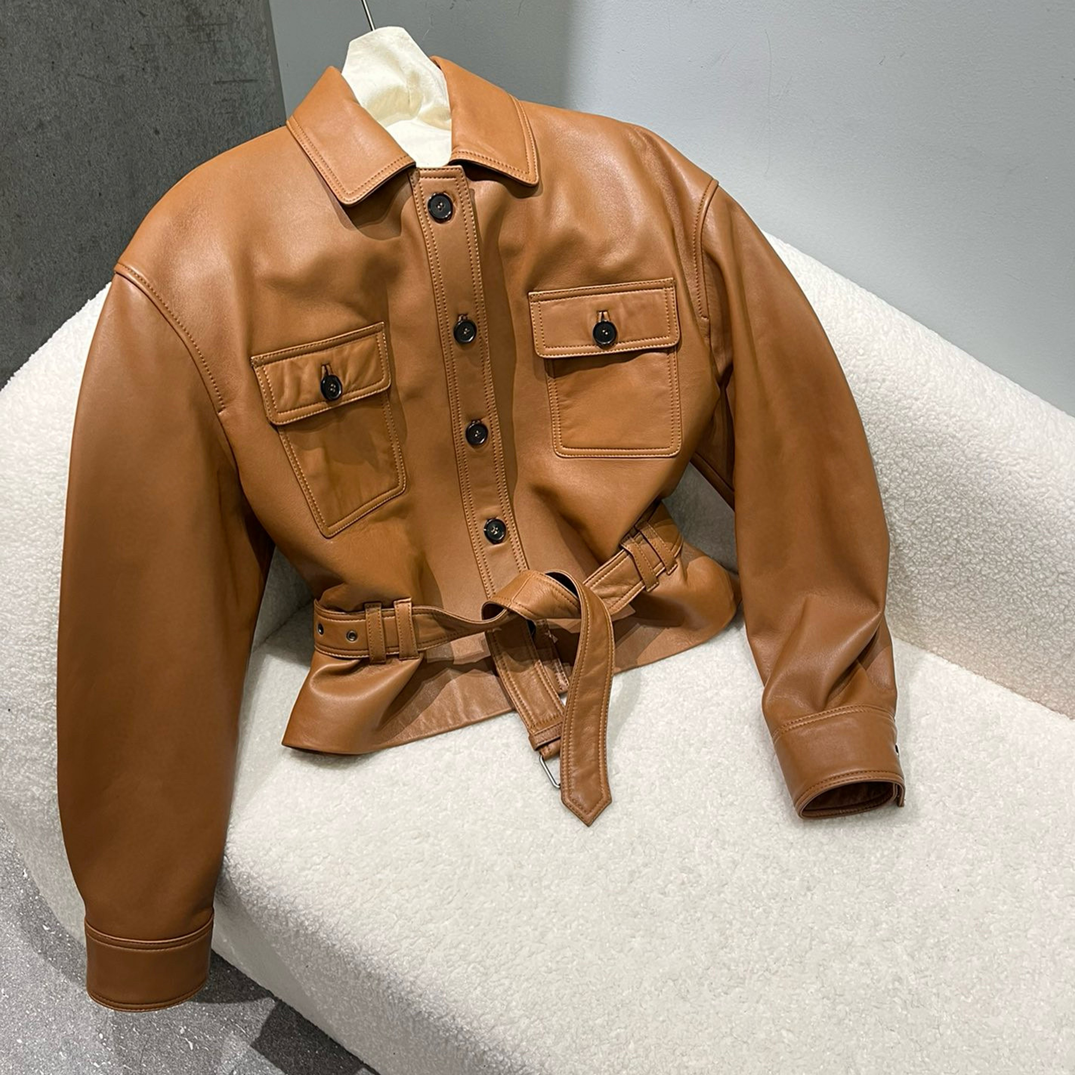 NIGO SAINT LAURENT Women's Fashion Luxury Temperament Leather Jacket Lace-up Short Jacket Lapel Long Sleeve Belt Slim Solid Colour Leather Jacket Ngvp #nigo1277