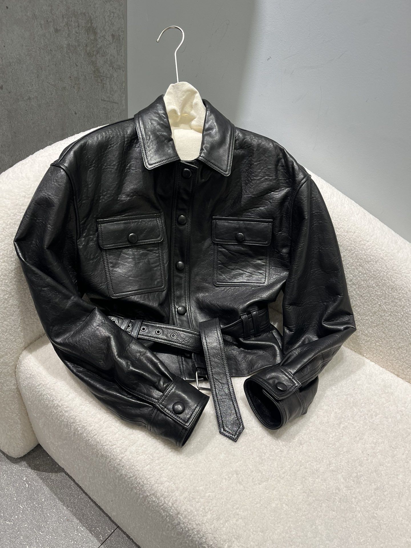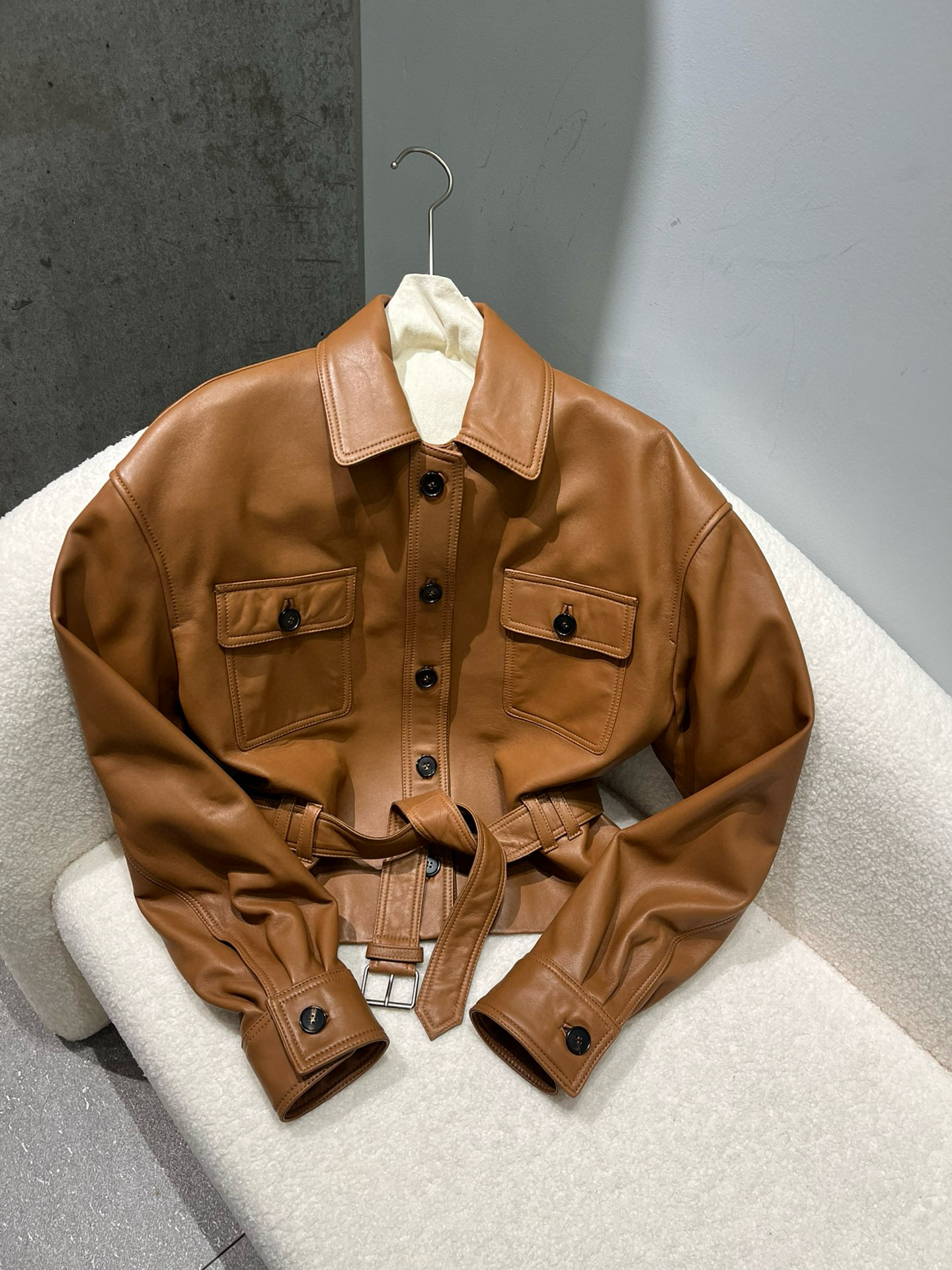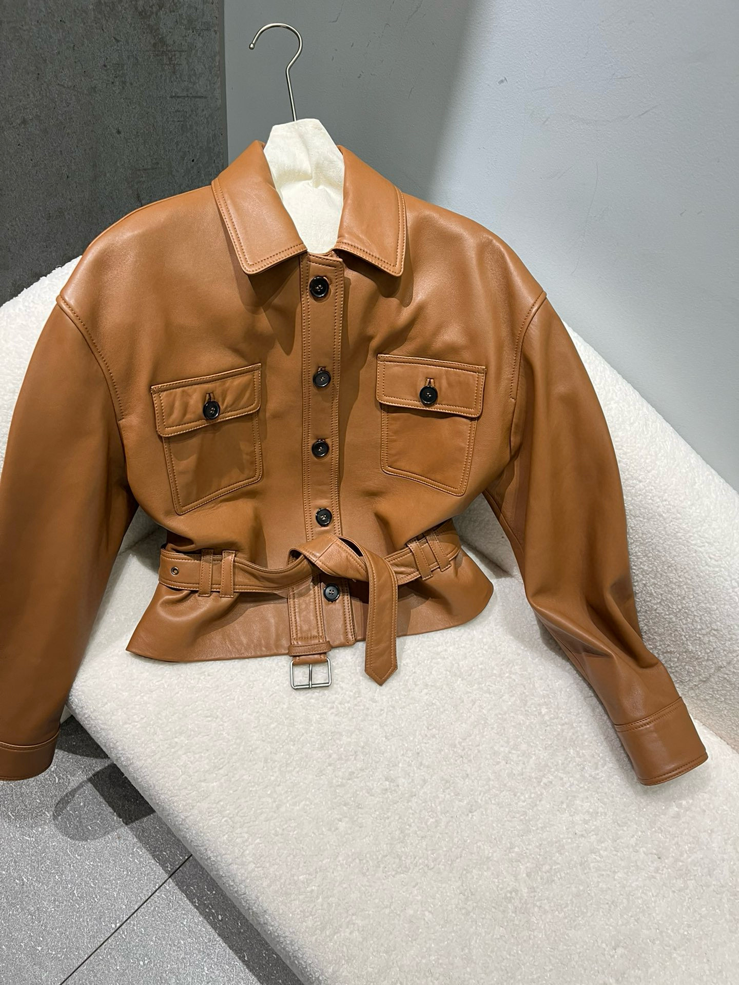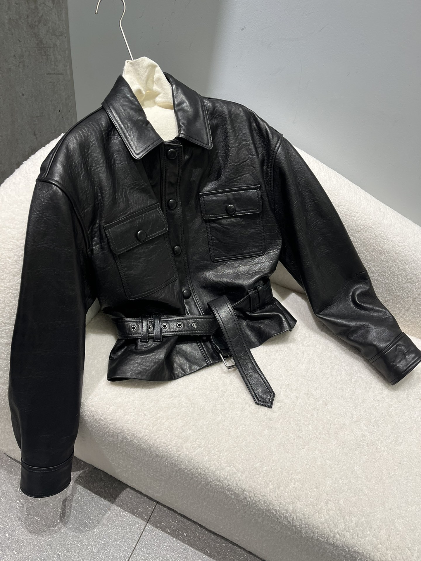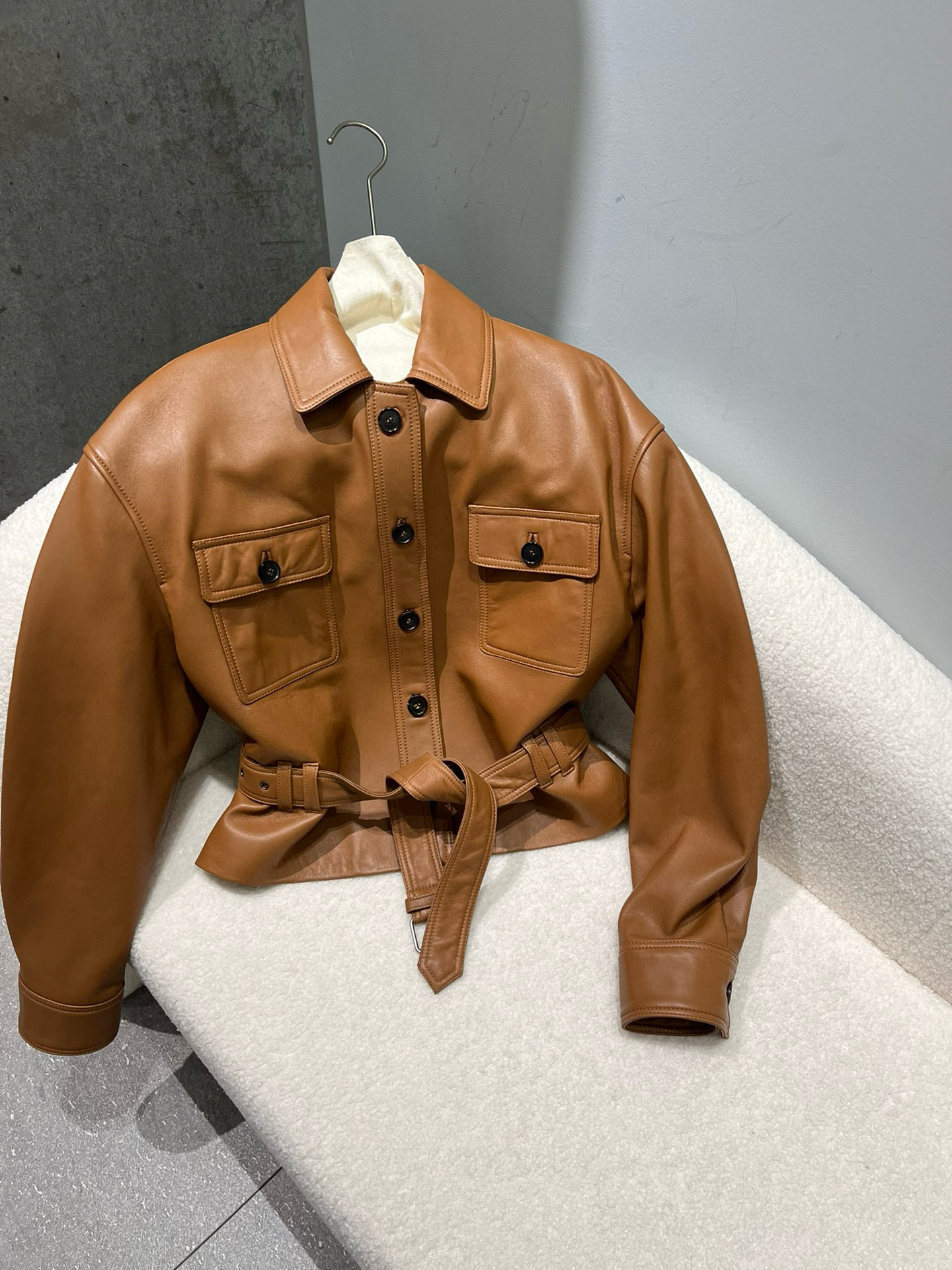 NIGO SAINT LAURENT Women's Fashion Luxury Temperament Leather Jacket Lace-up Short Jacket Lapel Long Sleeve Belt Slim Solid Colour Leather Jacket Ngvp #nigo1277