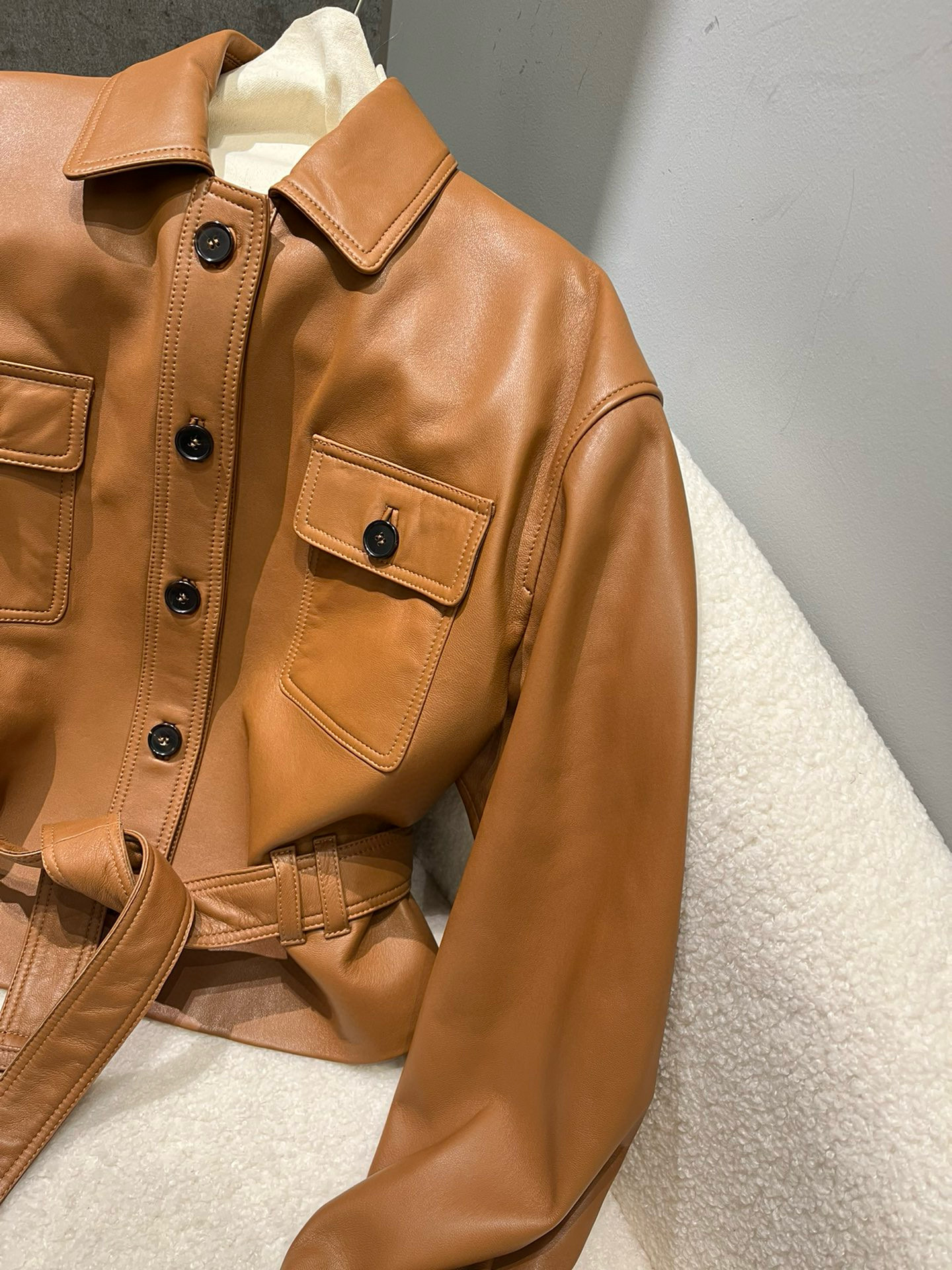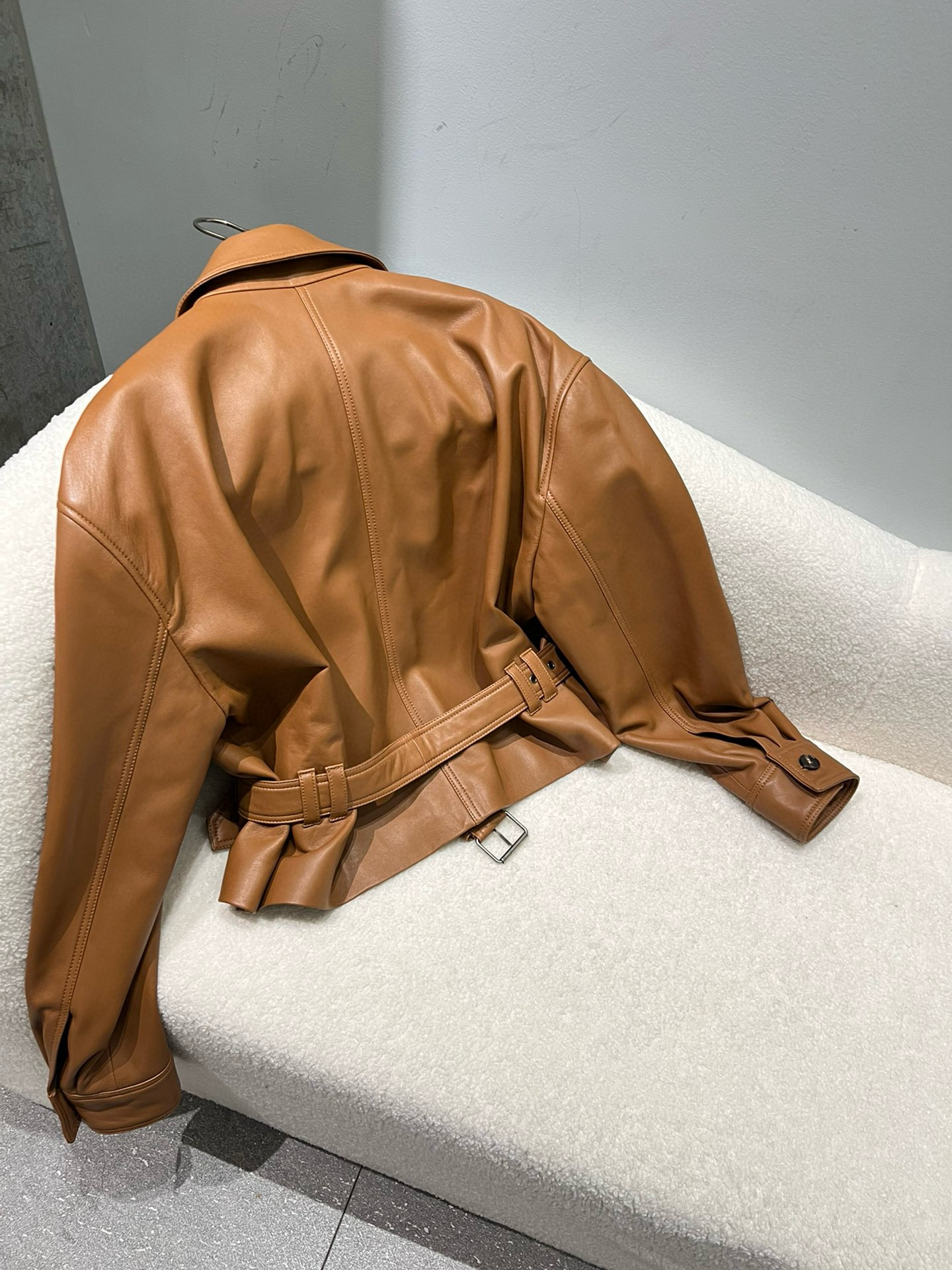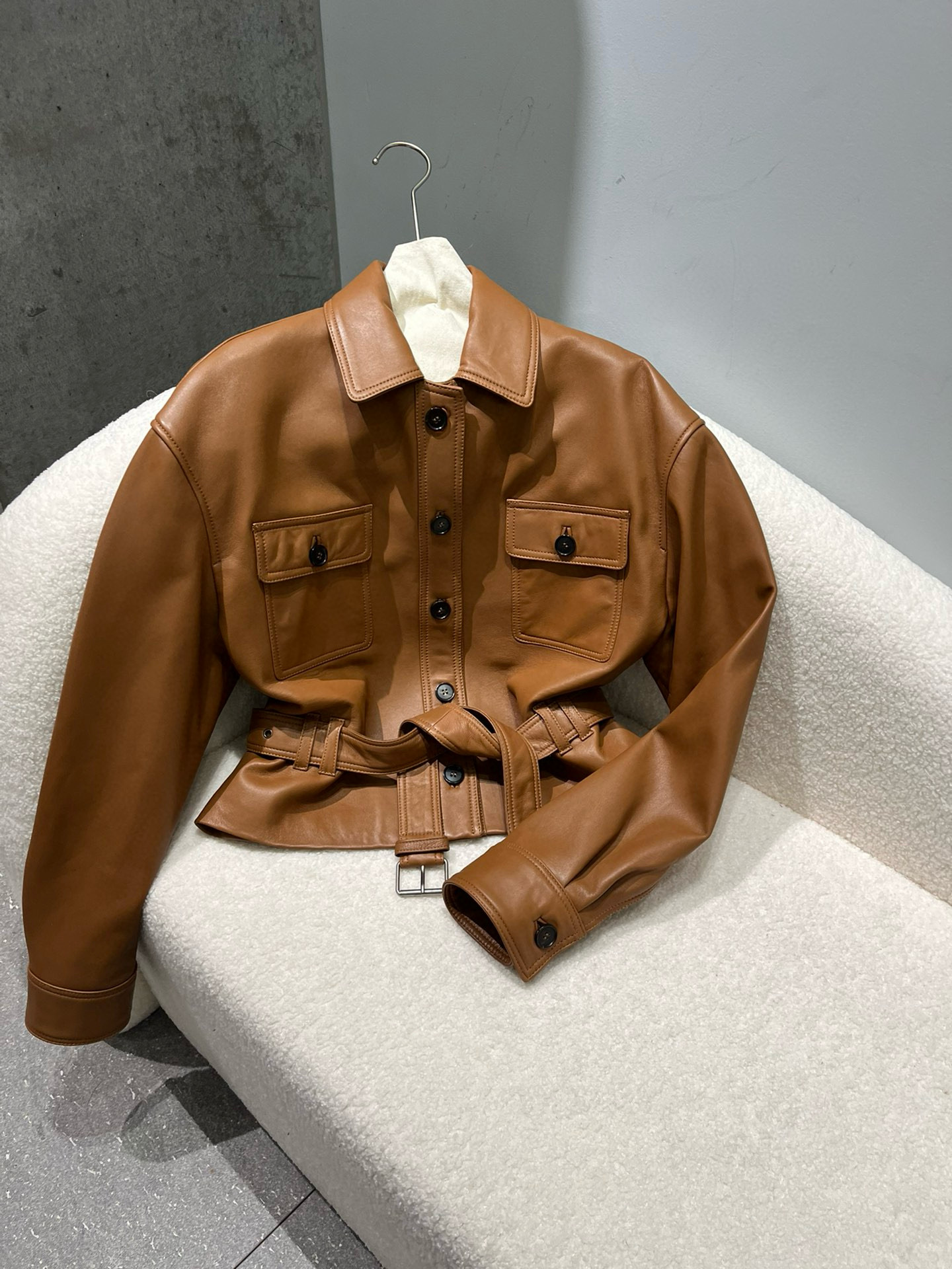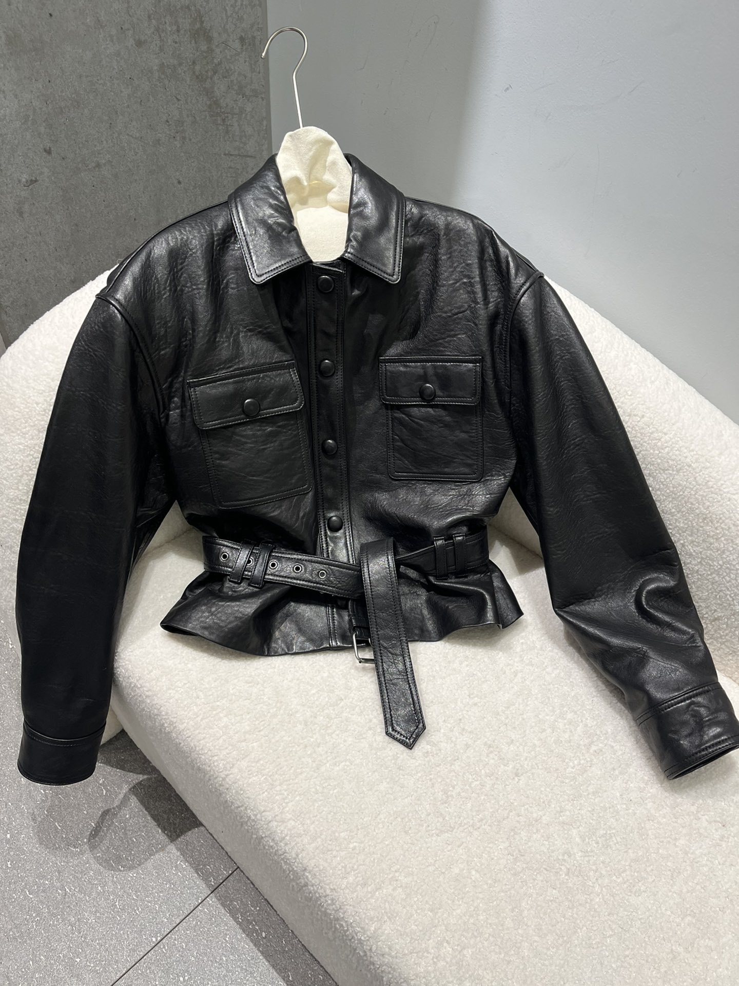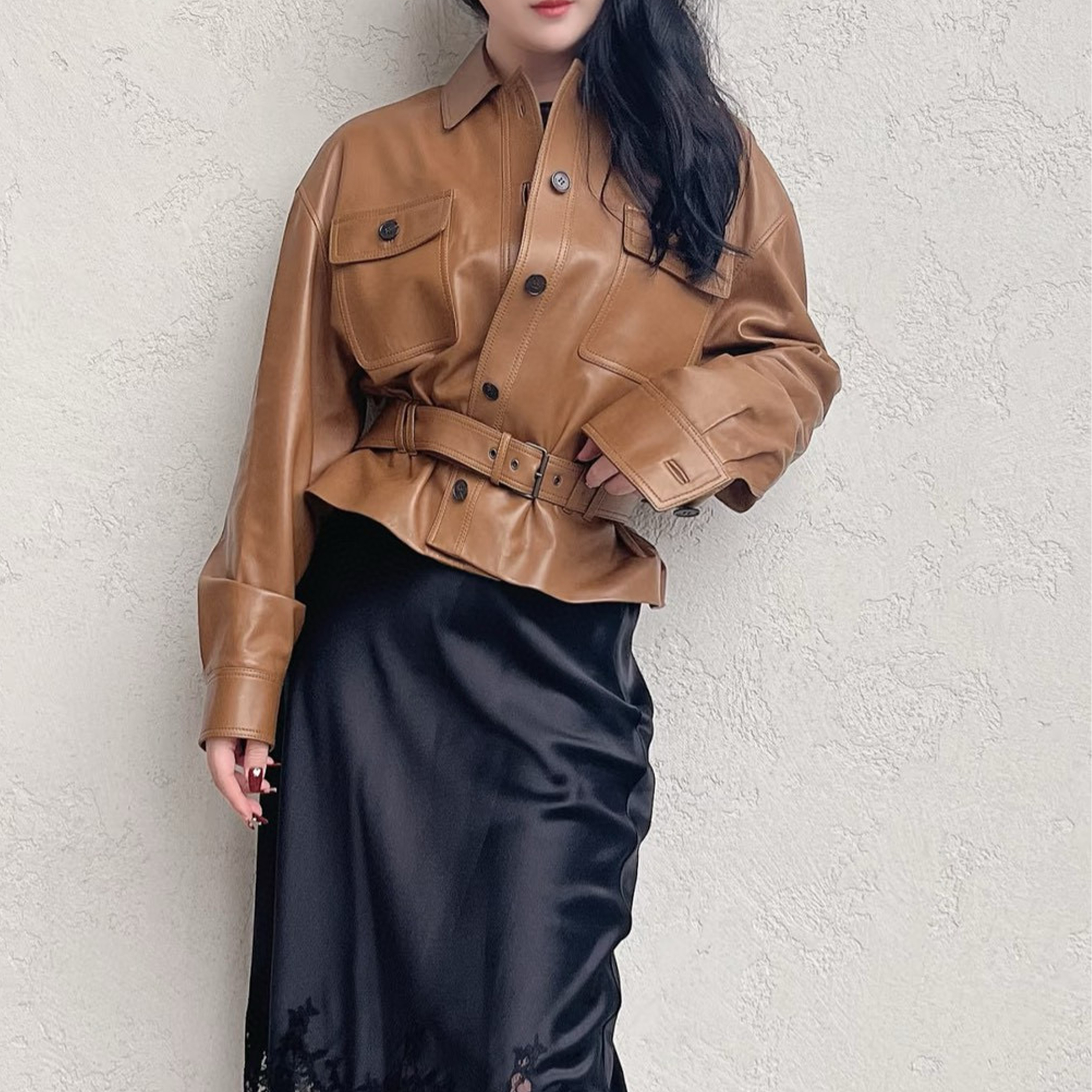 NIGO SAINT LAURENT Women's Fashion Luxury Temperament Leather Jacket Lace-up Short Jacket Lapel Long Sleeve Belt Slim Solid Colour Leather Jacket Ngvp #nigo1277