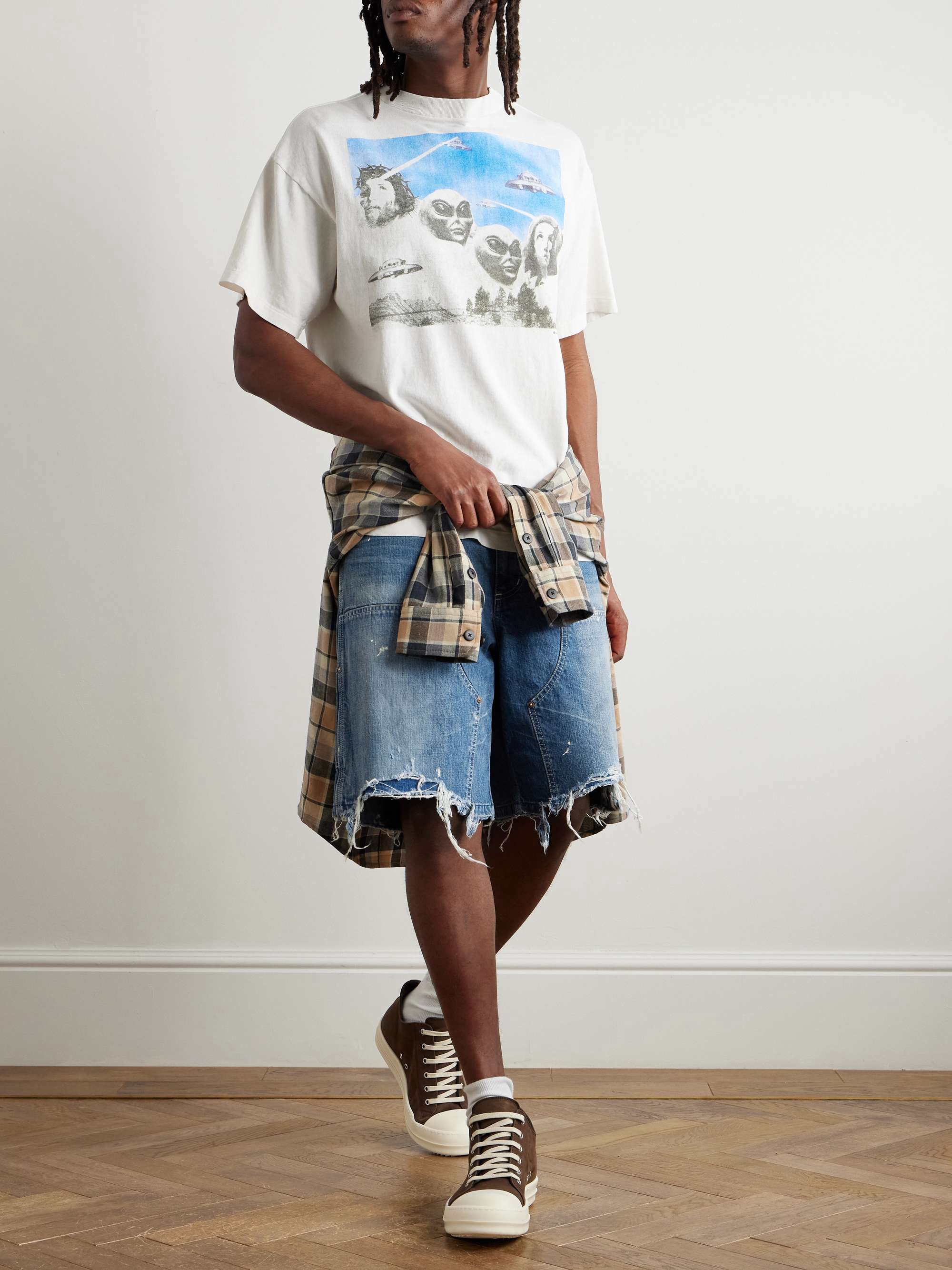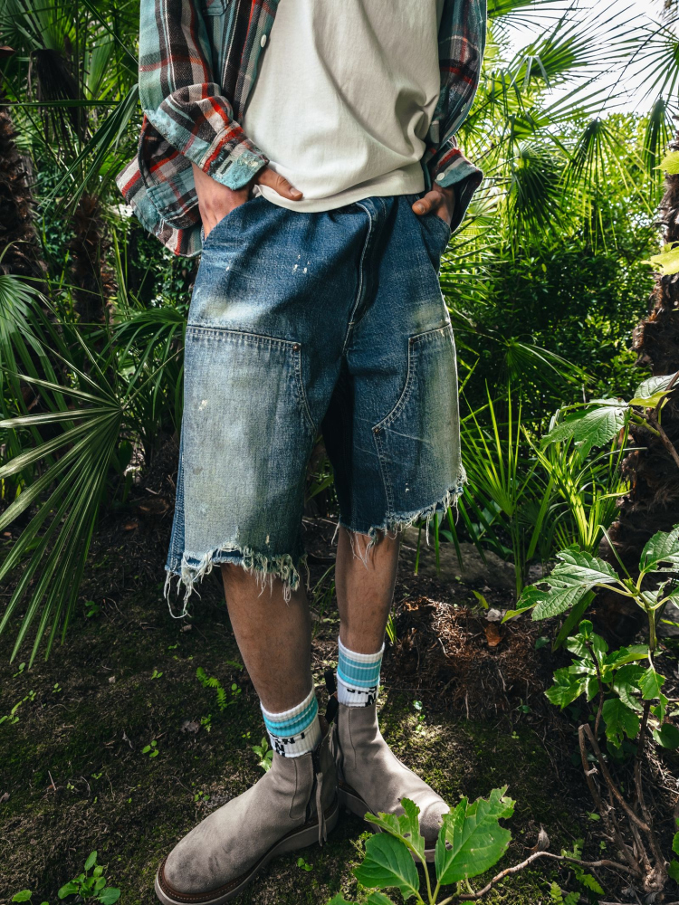 NIGO Saint Michael Men's And Women's Summer Distressed Vintage Loose-Fit Denim Shorts Solid Color Straight Leg Splash Print Hem Ripped Shorts Ngvp #nigo2275