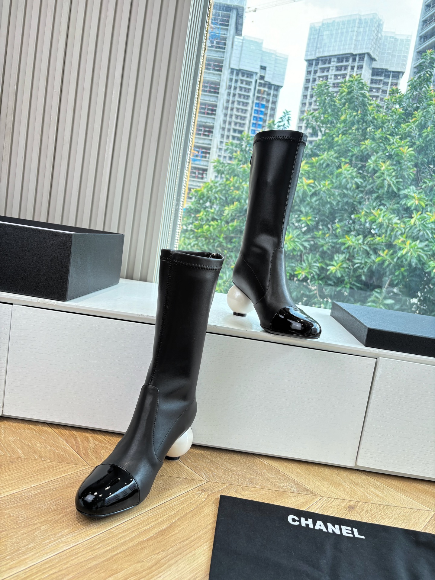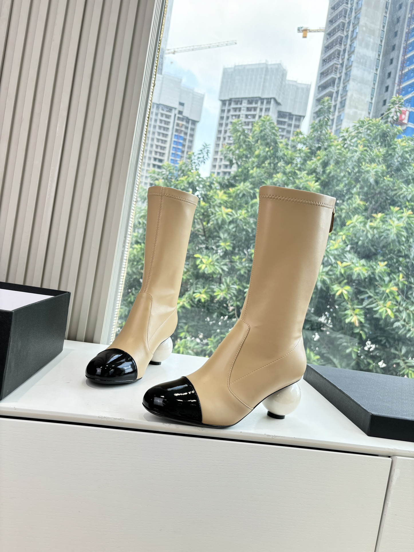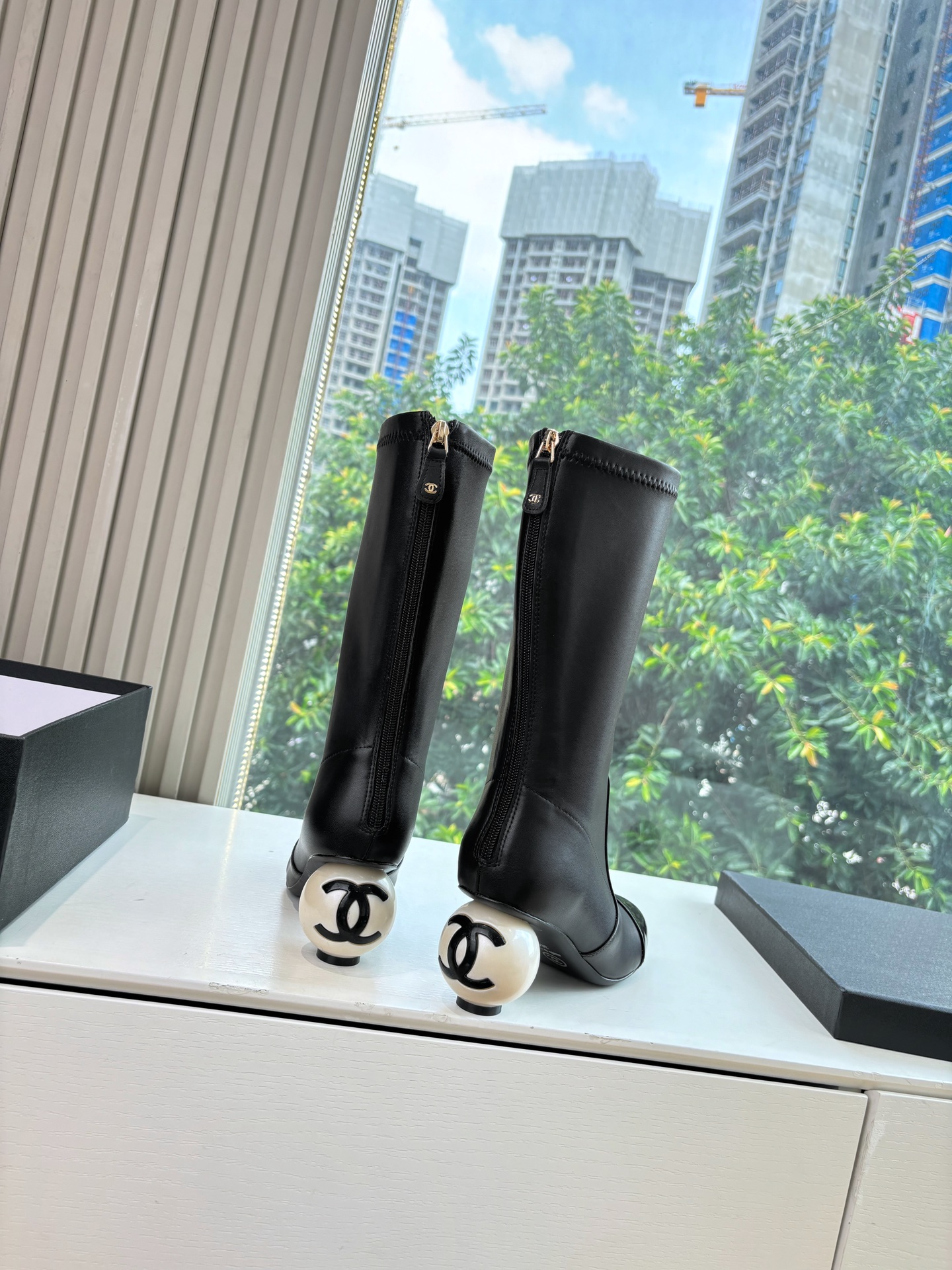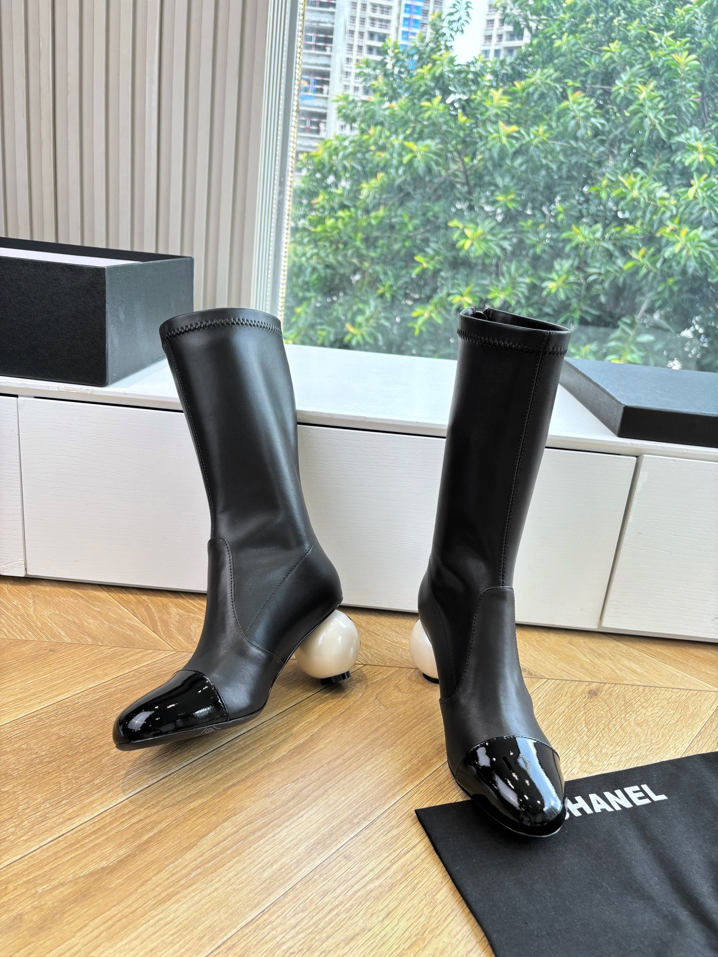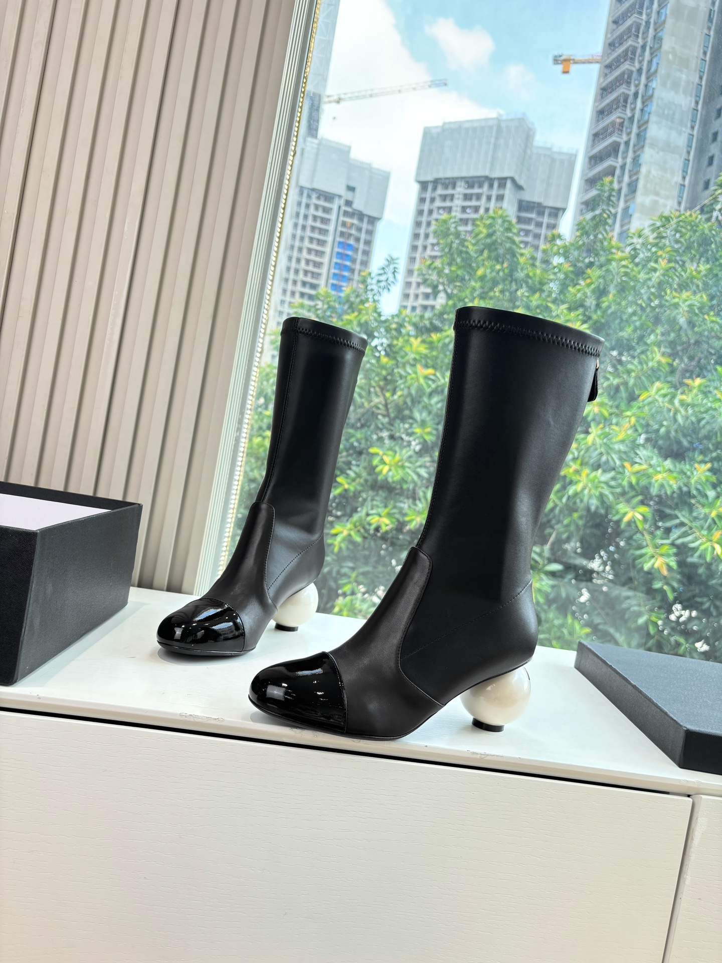 NIGO Chanel Women's Fall/winter Fashion Classic Round Toe Sheepskin Double C Oversized Pearl Heel Stretch Mid Calf Boots Long Boots Shoes #nigo78546