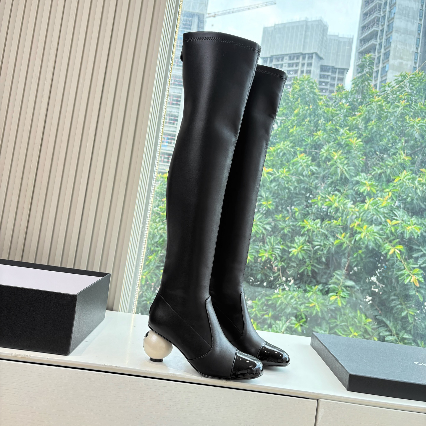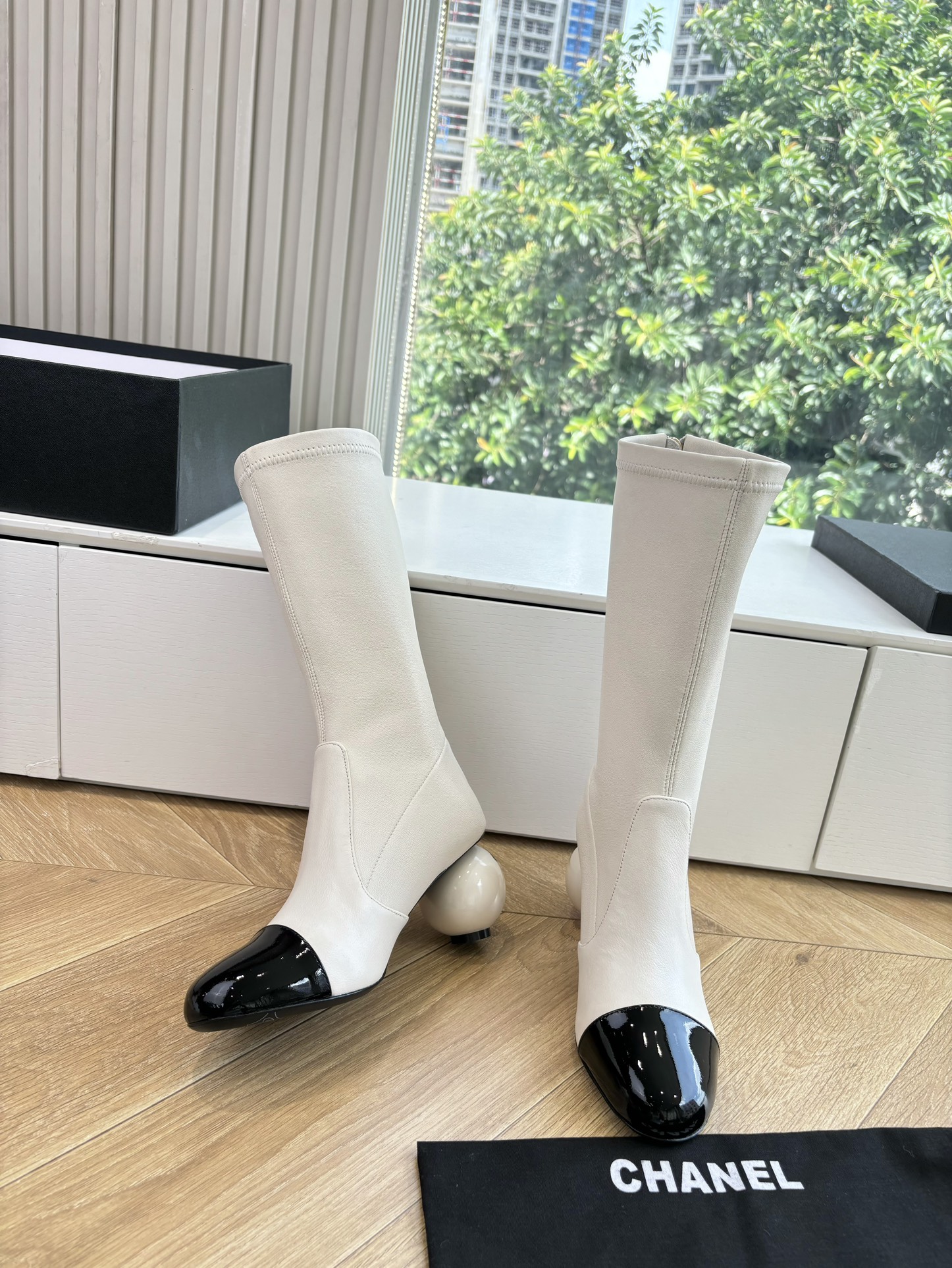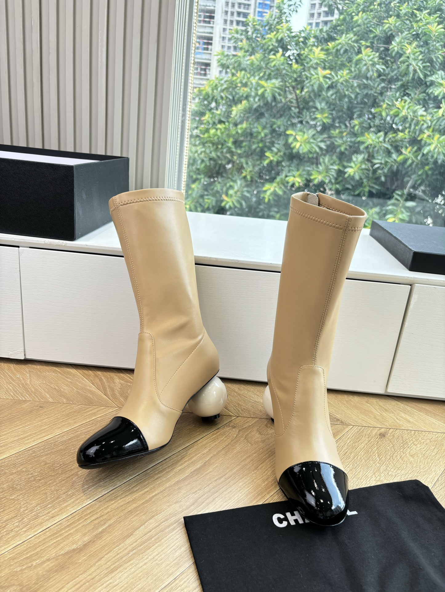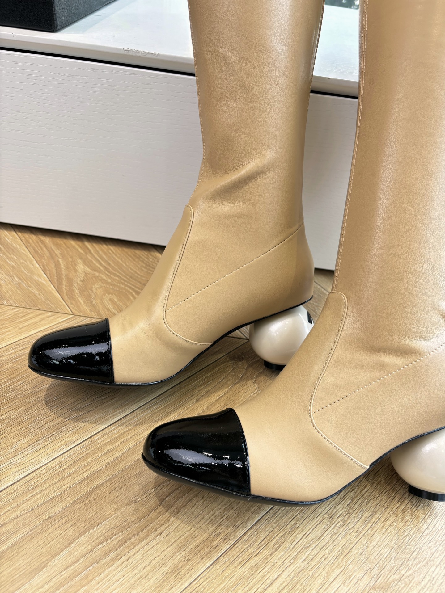 NIGO Chanel Women's Fall/winter Fashion Classic Round Toe Sheepskin Double C Oversized Pearl Heel Stretch Mid Calf Boots Long Boots Shoes #nigo78546
