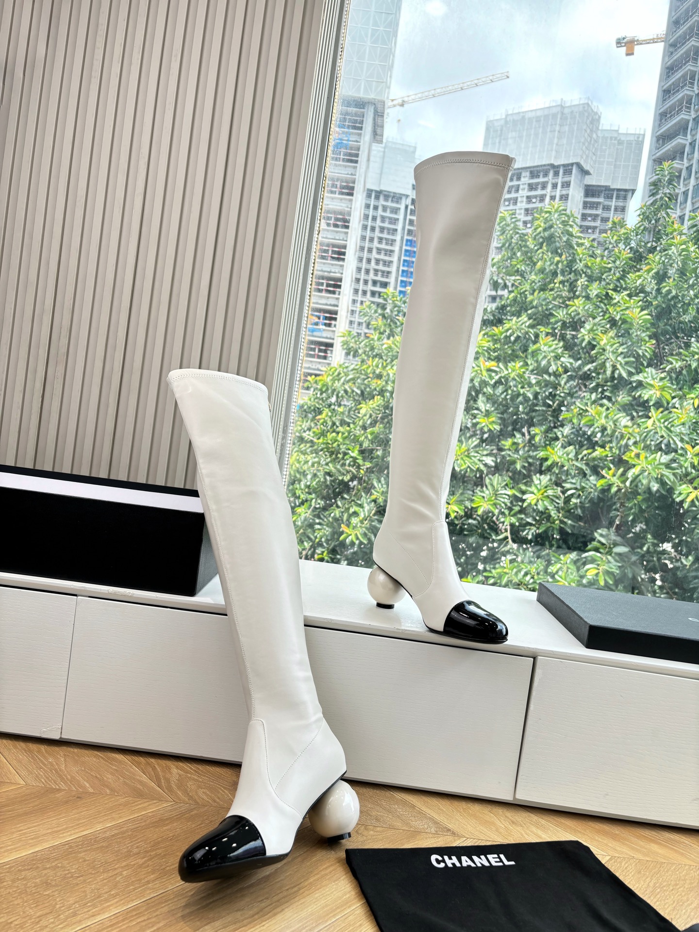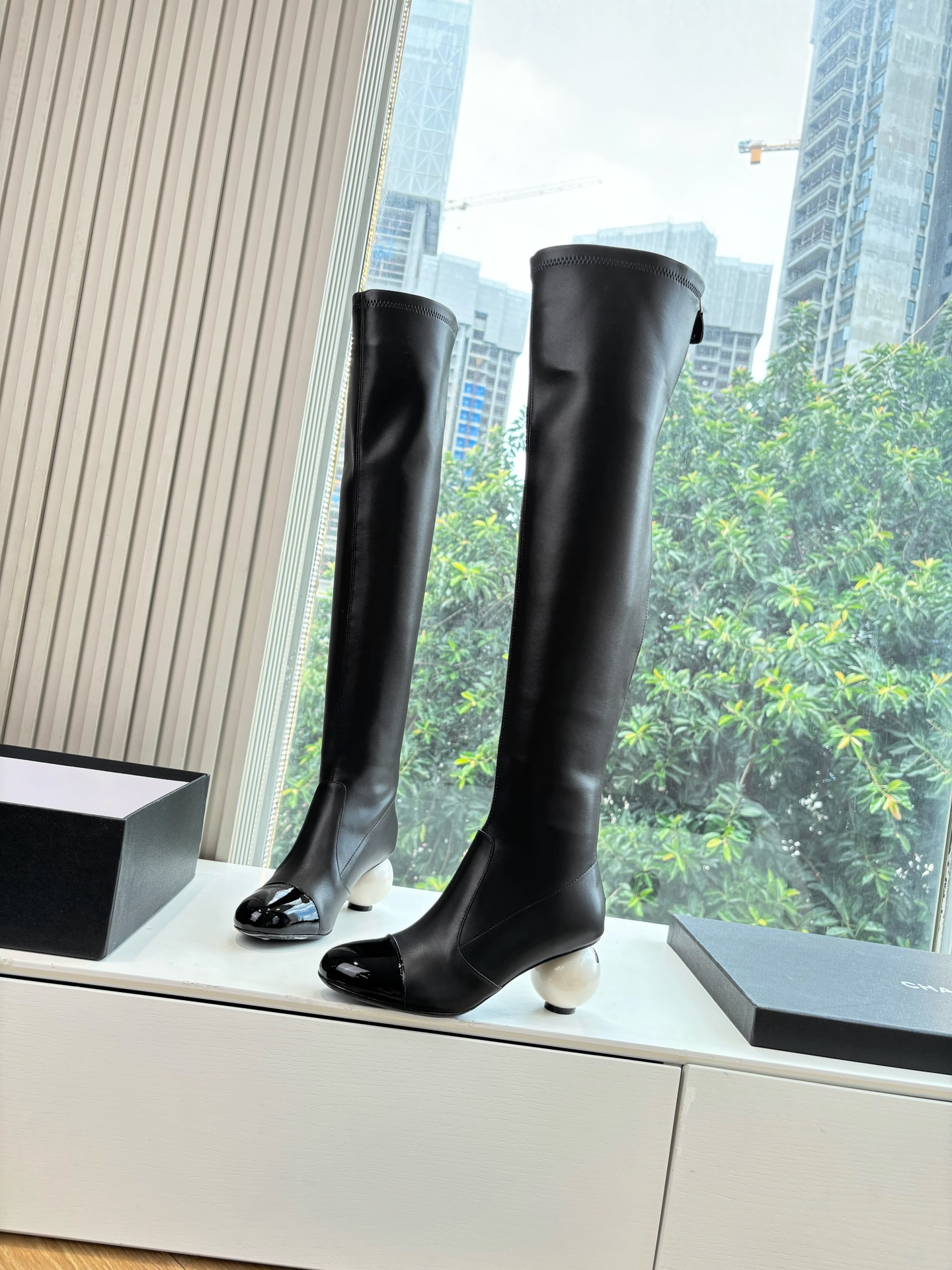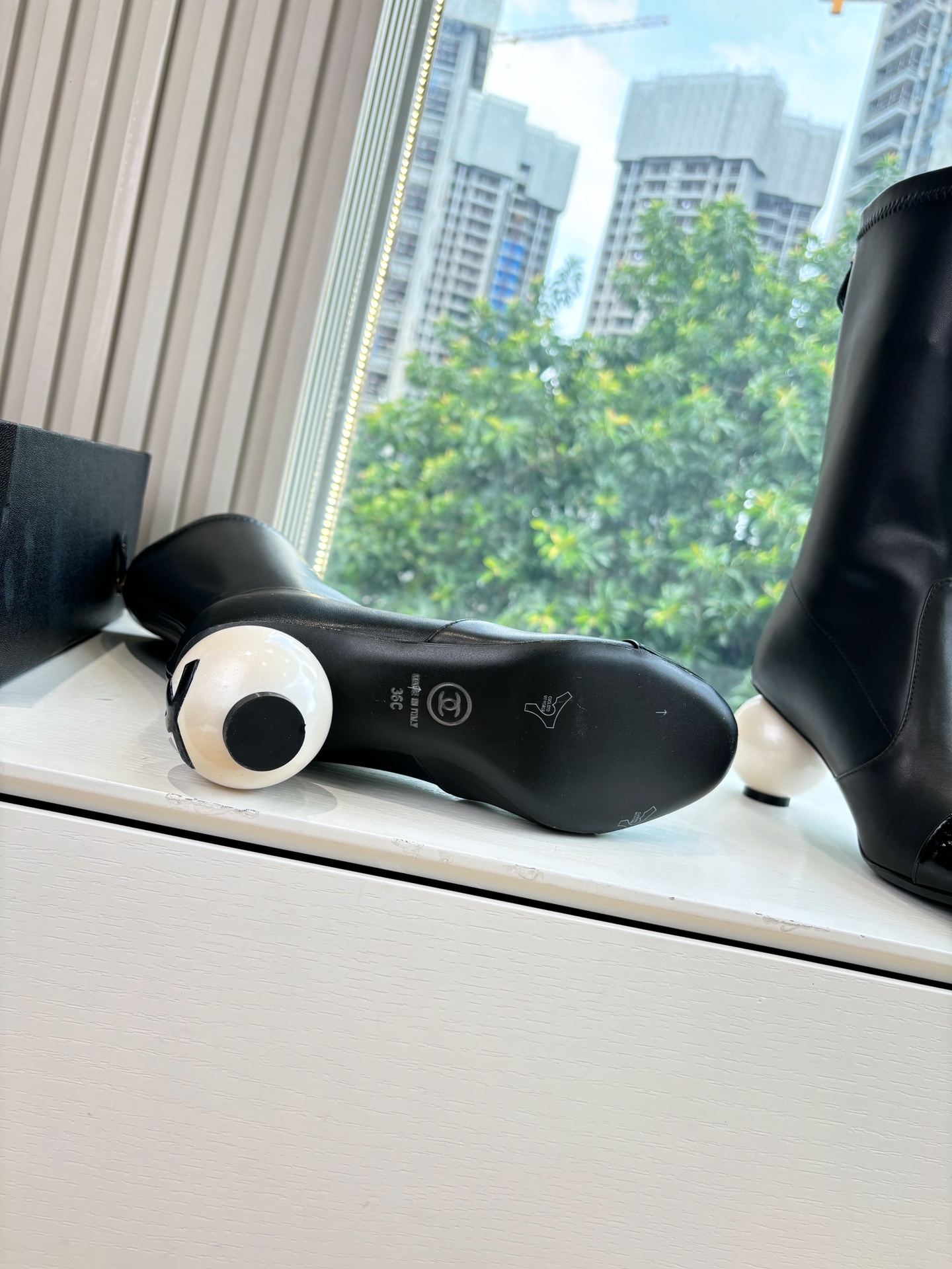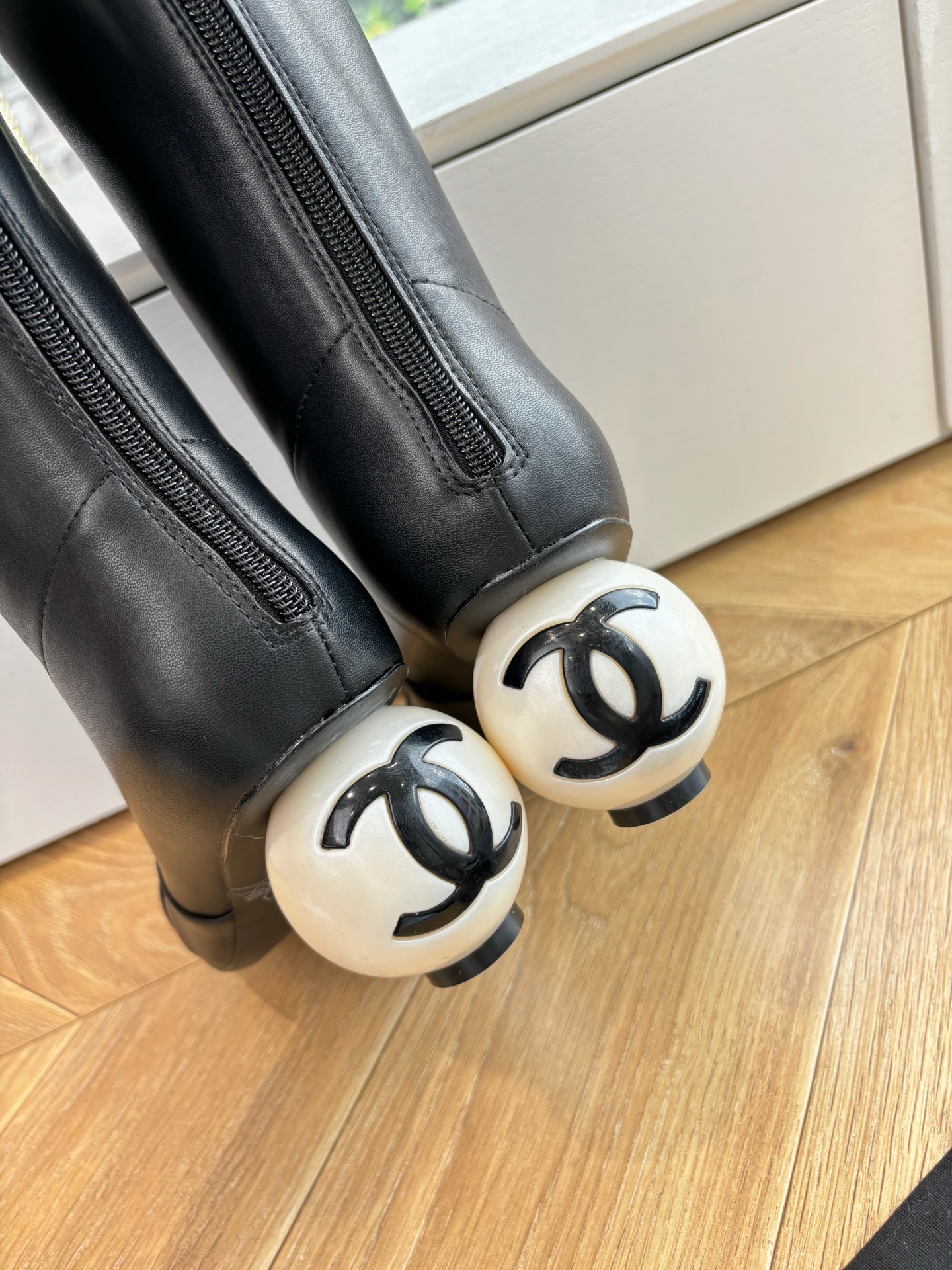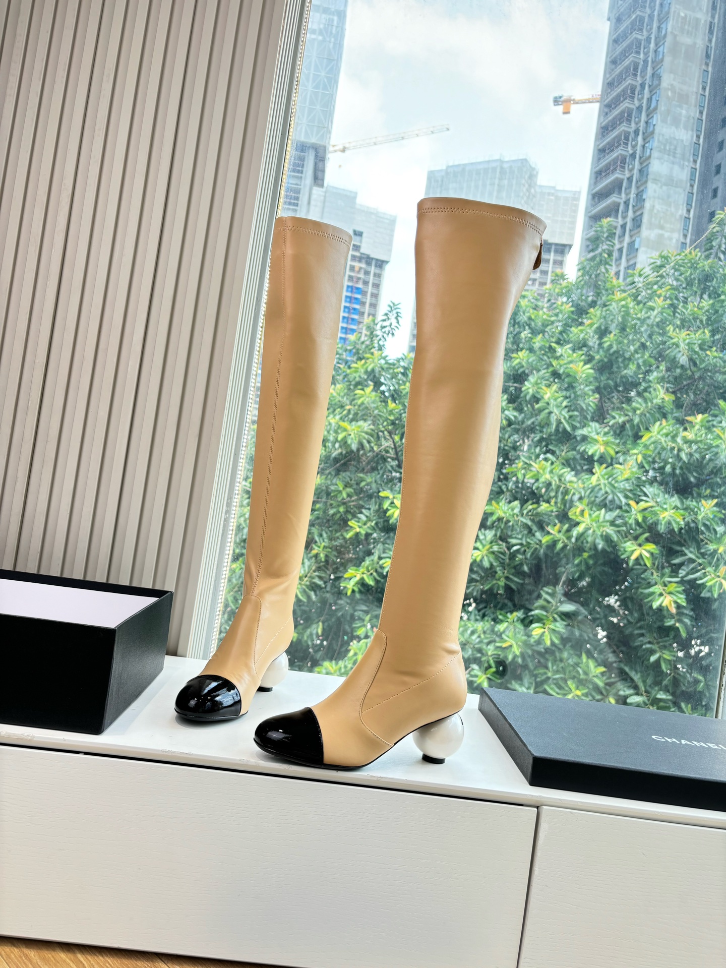 NIGO Chanel Women's Fall/winter Fashion Classic Round Toe Sheepskin Double C Oversized Pearl Heel Stretch Mid Calf Boots Long Boots Shoes #nigo78546