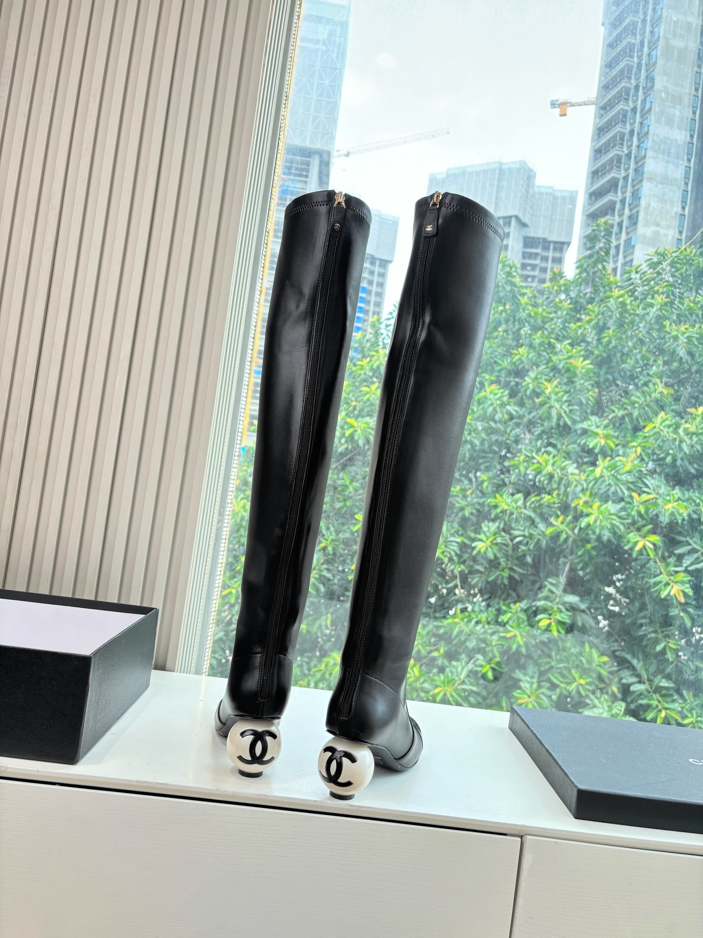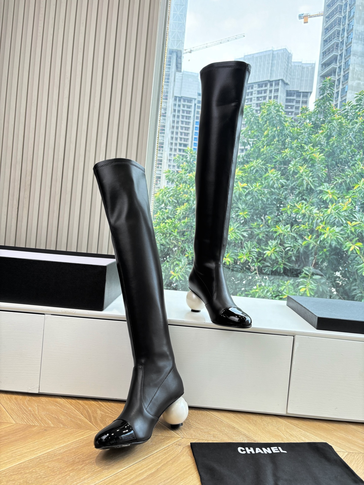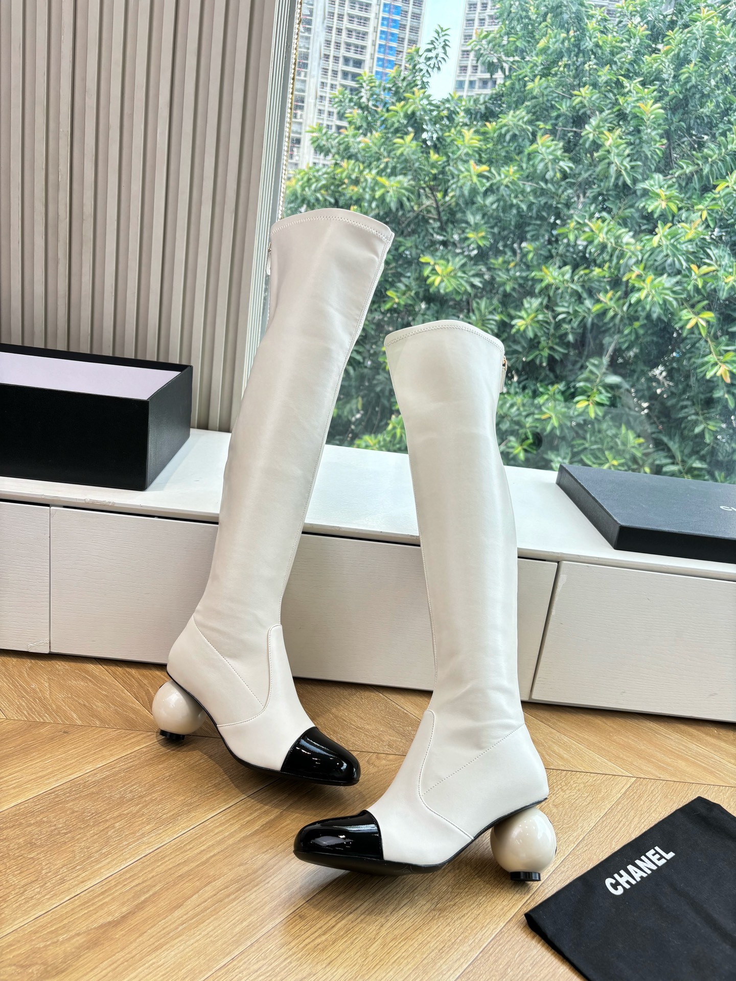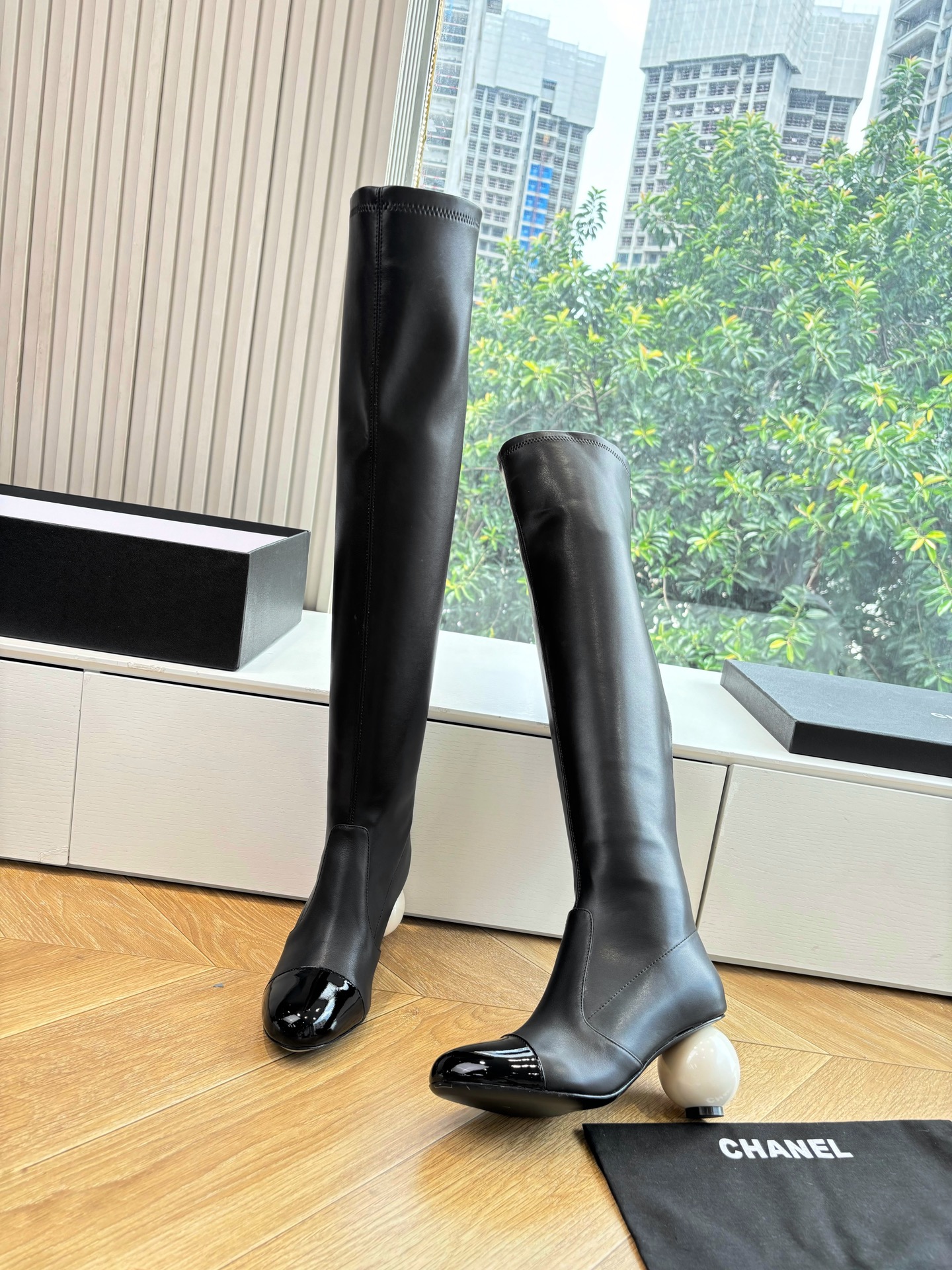 NIGO Chanel Women's Fall/winter Fashion Classic Round Toe Sheepskin Double C Oversized Pearl Heel Stretch Mid Calf Boots Long Boots Shoes #nigo78546