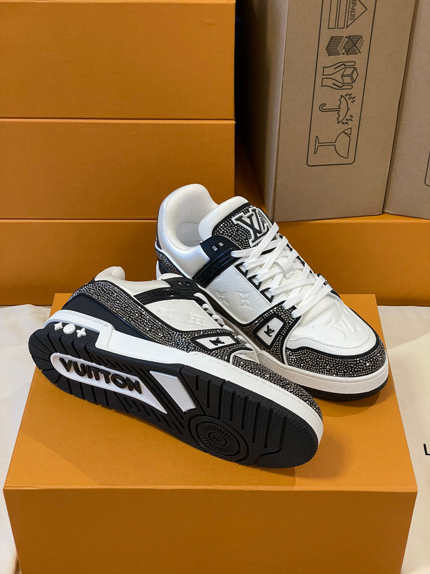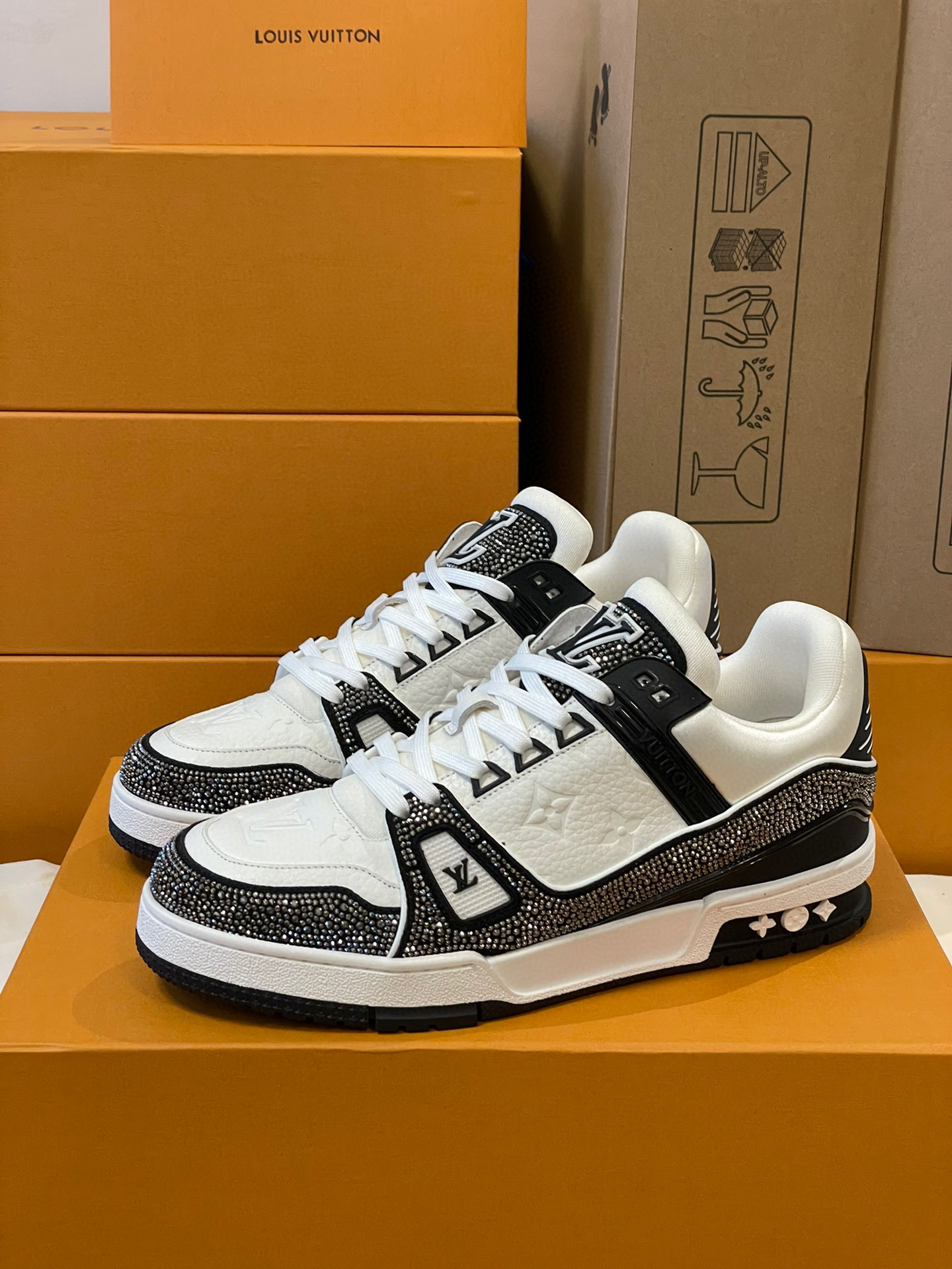 NIGO Louis Vuitton Men's and Women's LV Trainer Sneaker Black and White Cowhide Crystal Low Top Board Shoes #nigo97249