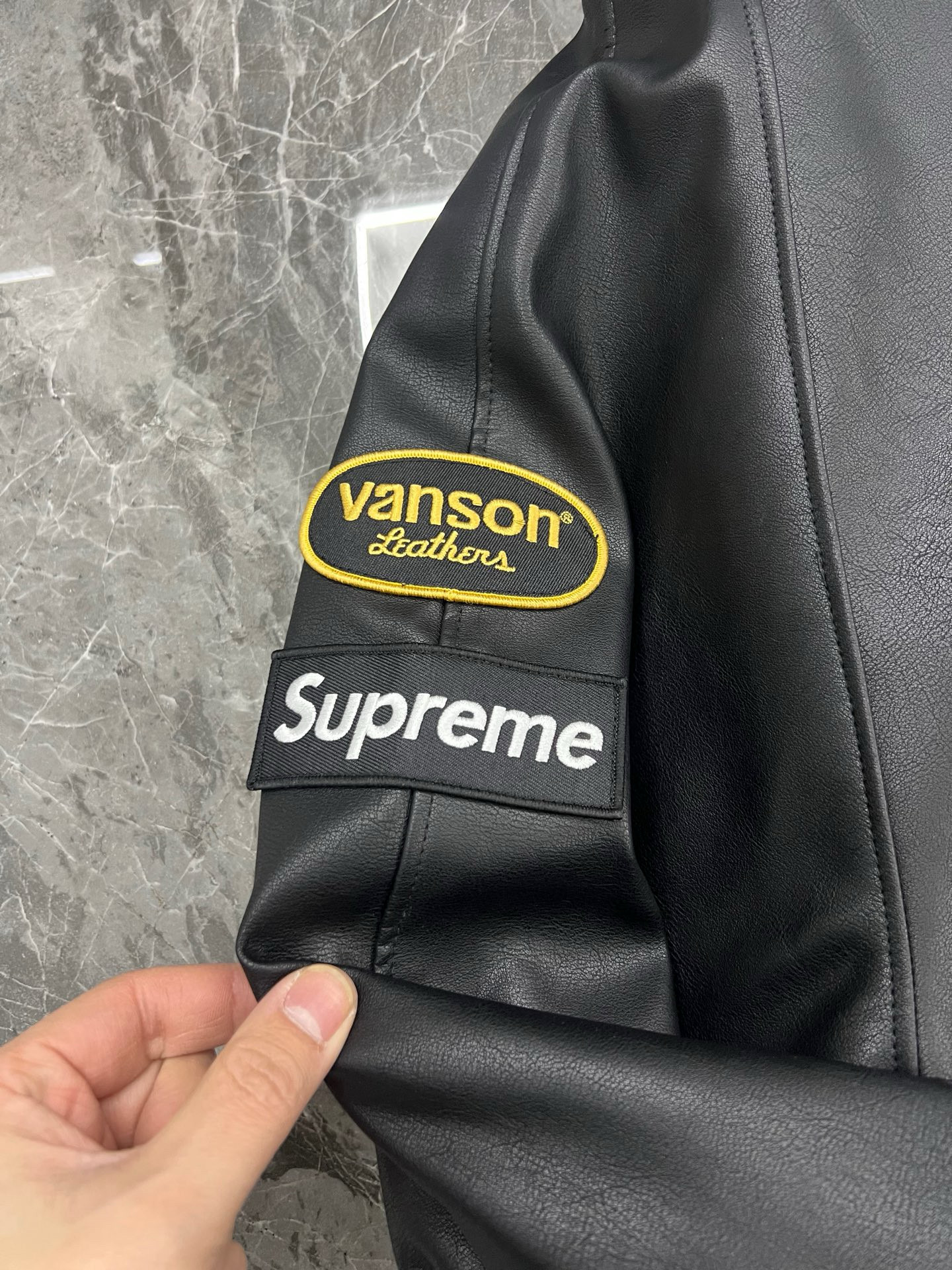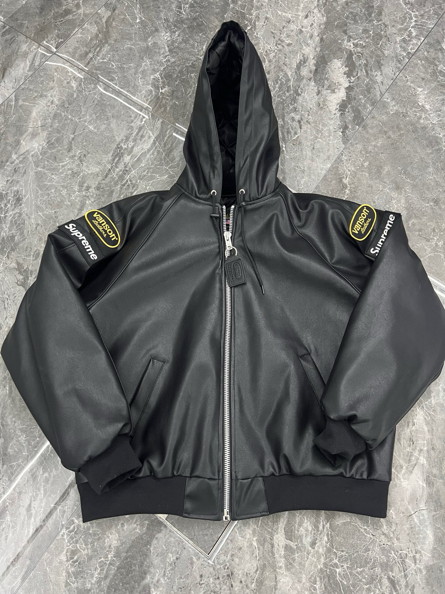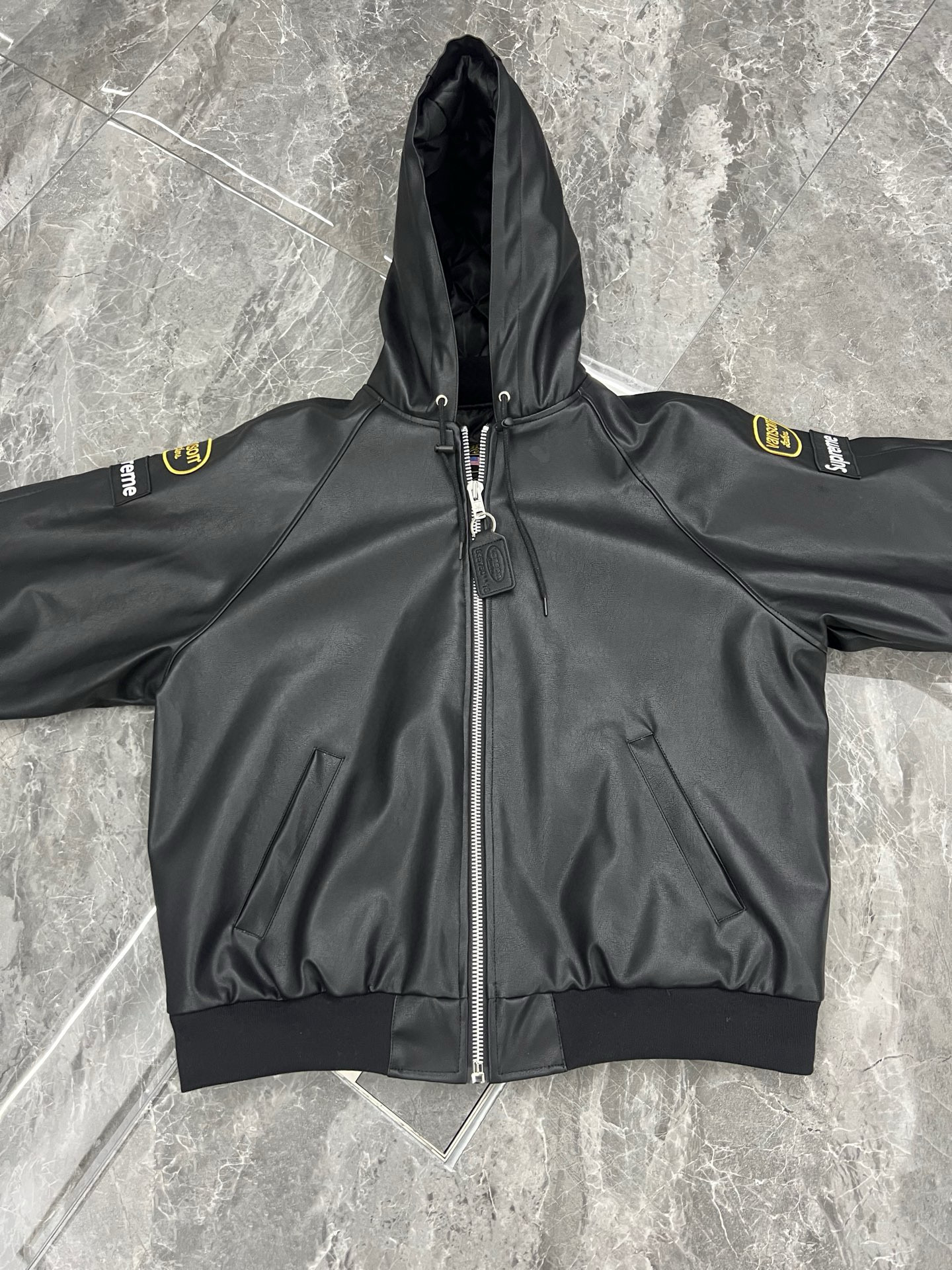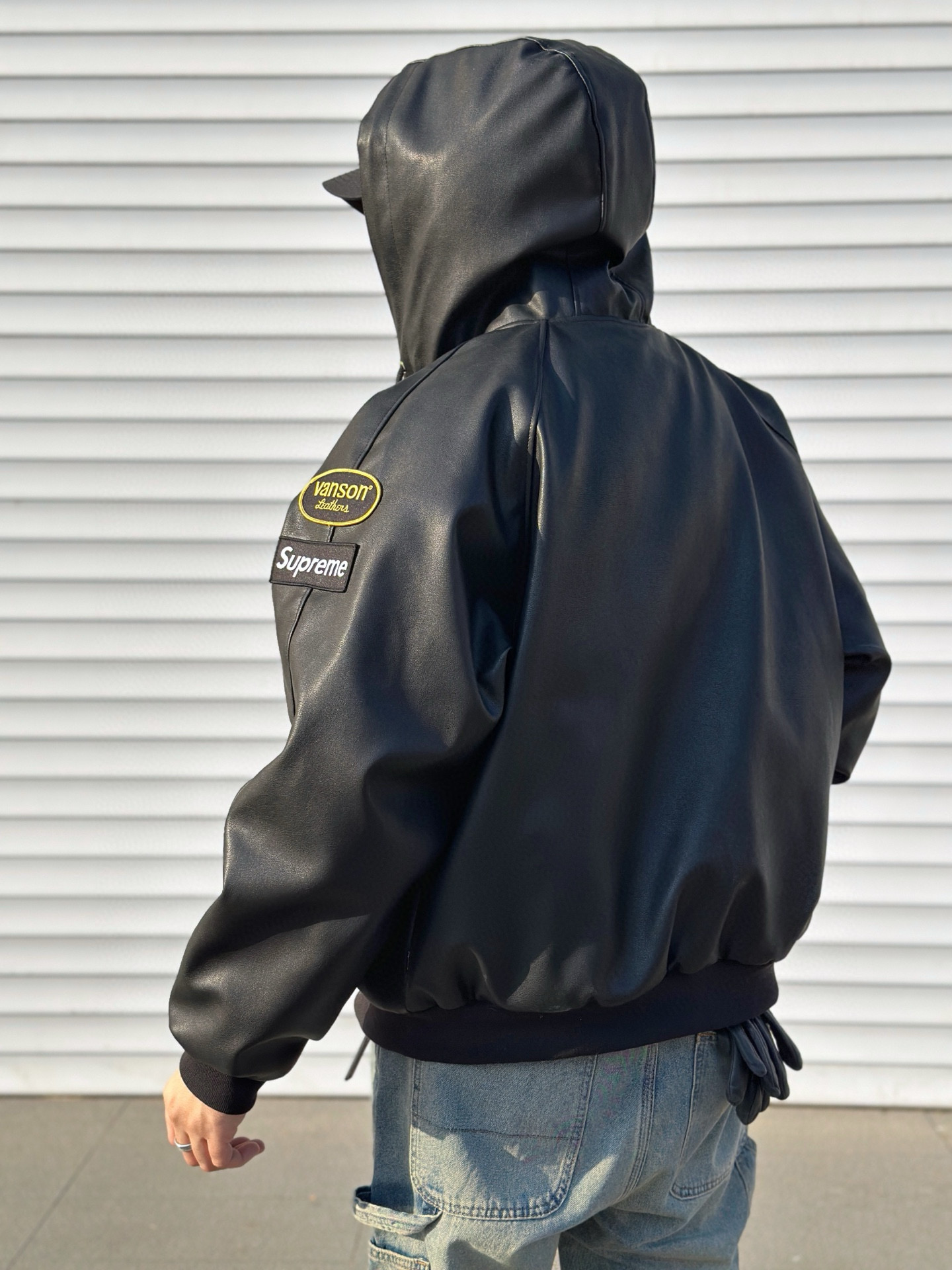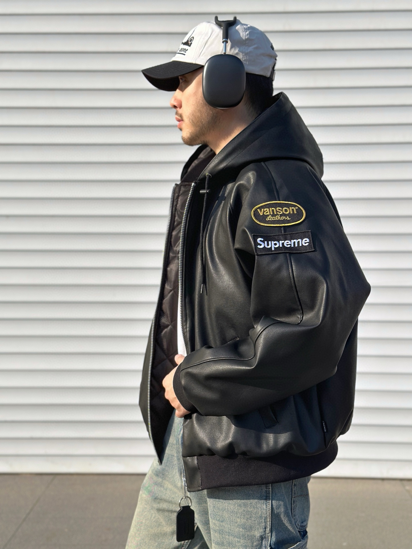 NIGO Supreme x Vanson Leathers Men's and Women's Spring and Fall Sleeve Logo Embroidered Patch Zipper Closure Hooded Leather Jacket #nigo75186