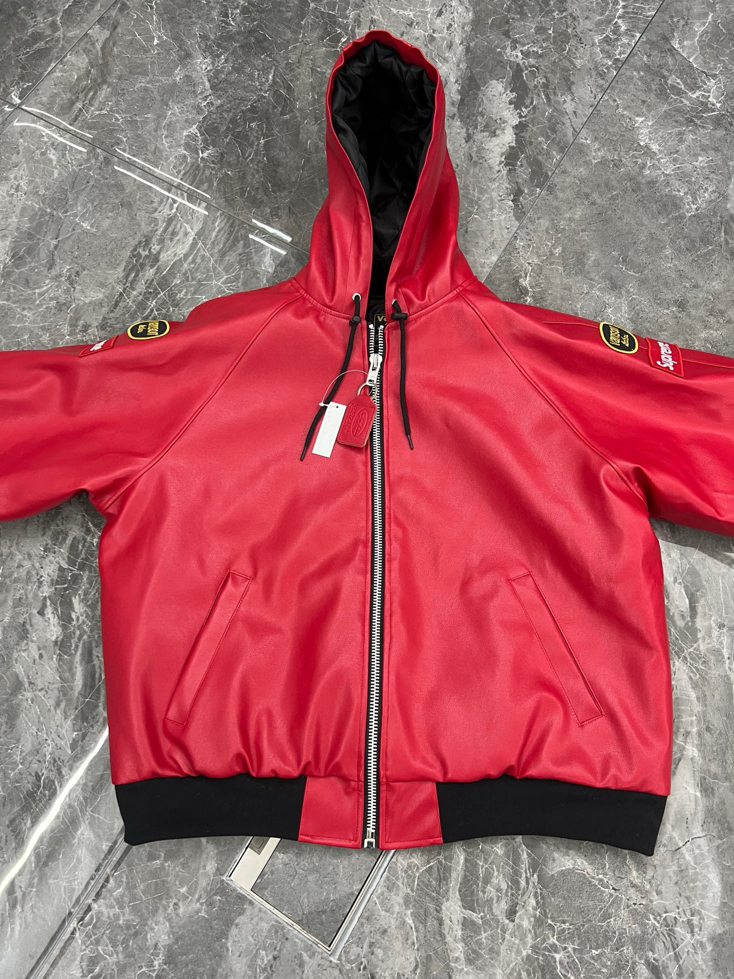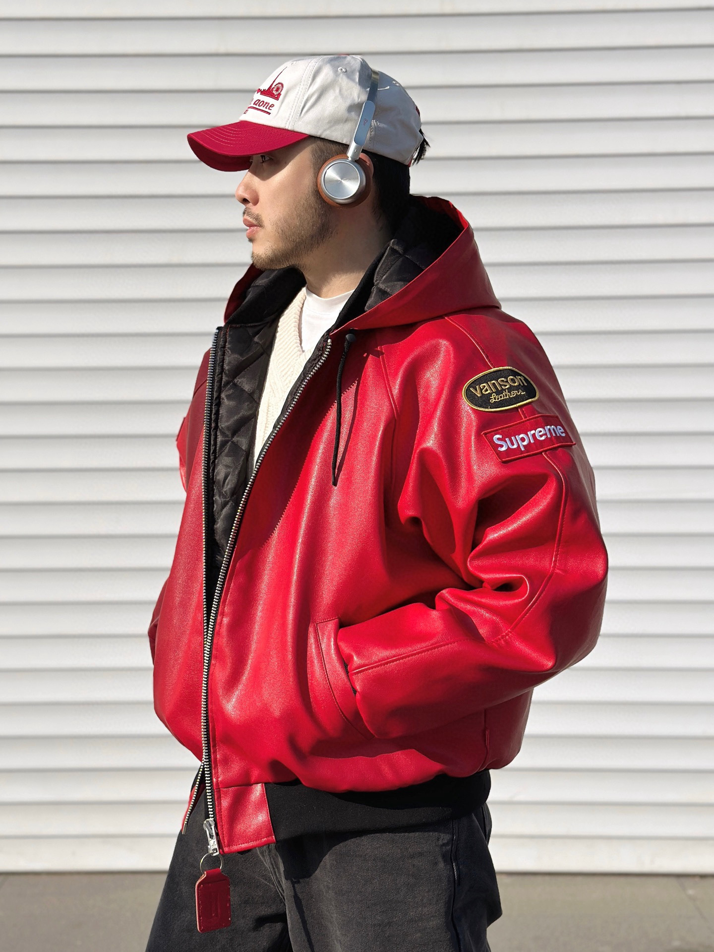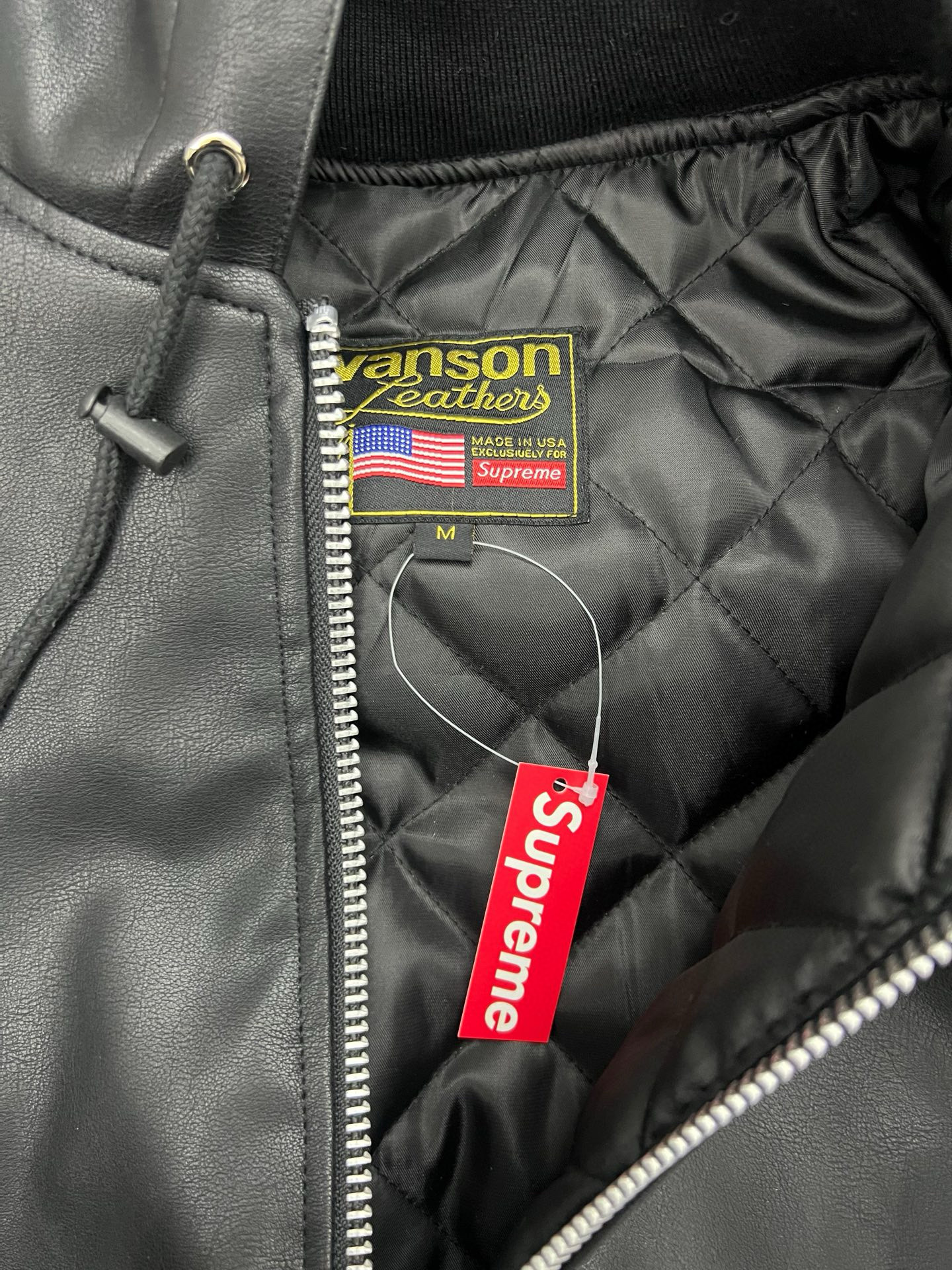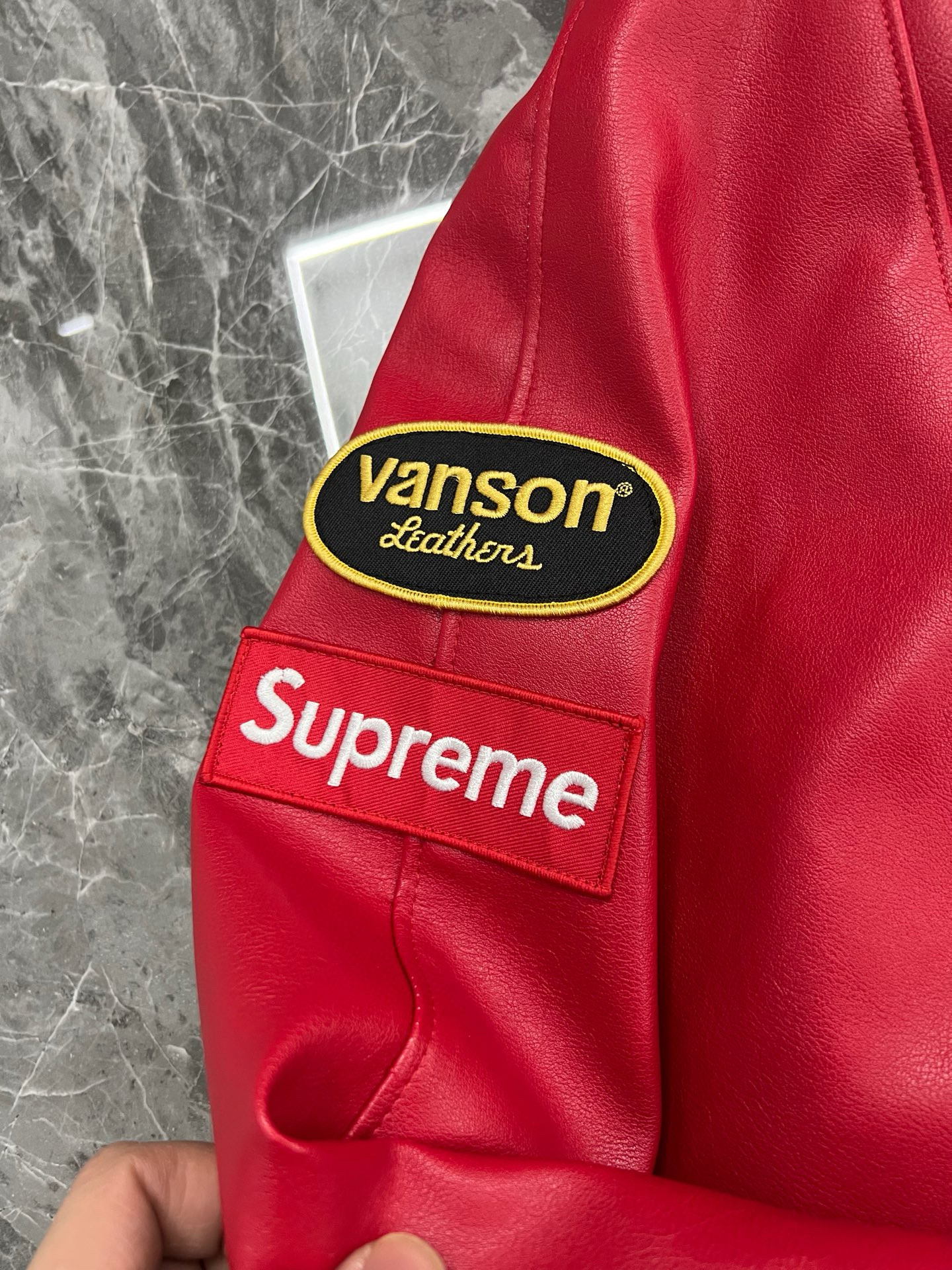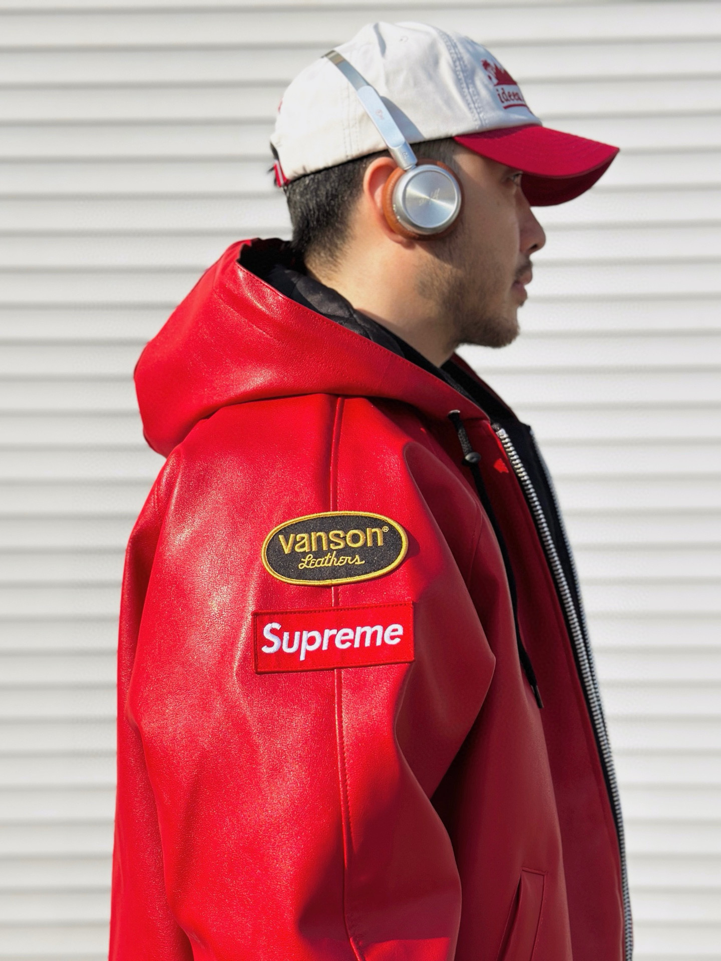 NIGO Supreme x Vanson Leathers Men's and Women's Spring and Fall Sleeve Logo Embroidered Patch Zipper Closure Hooded Leather Jacket #nigo75186