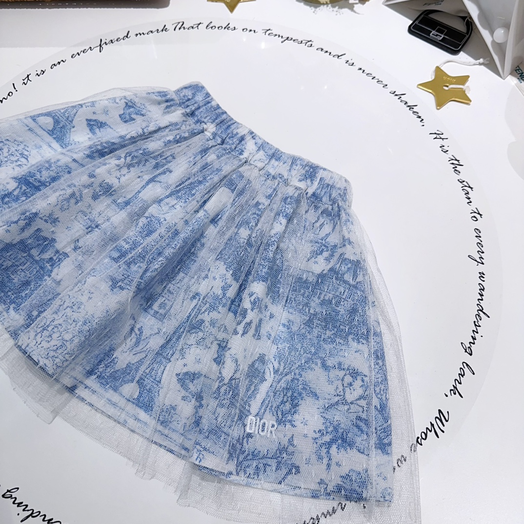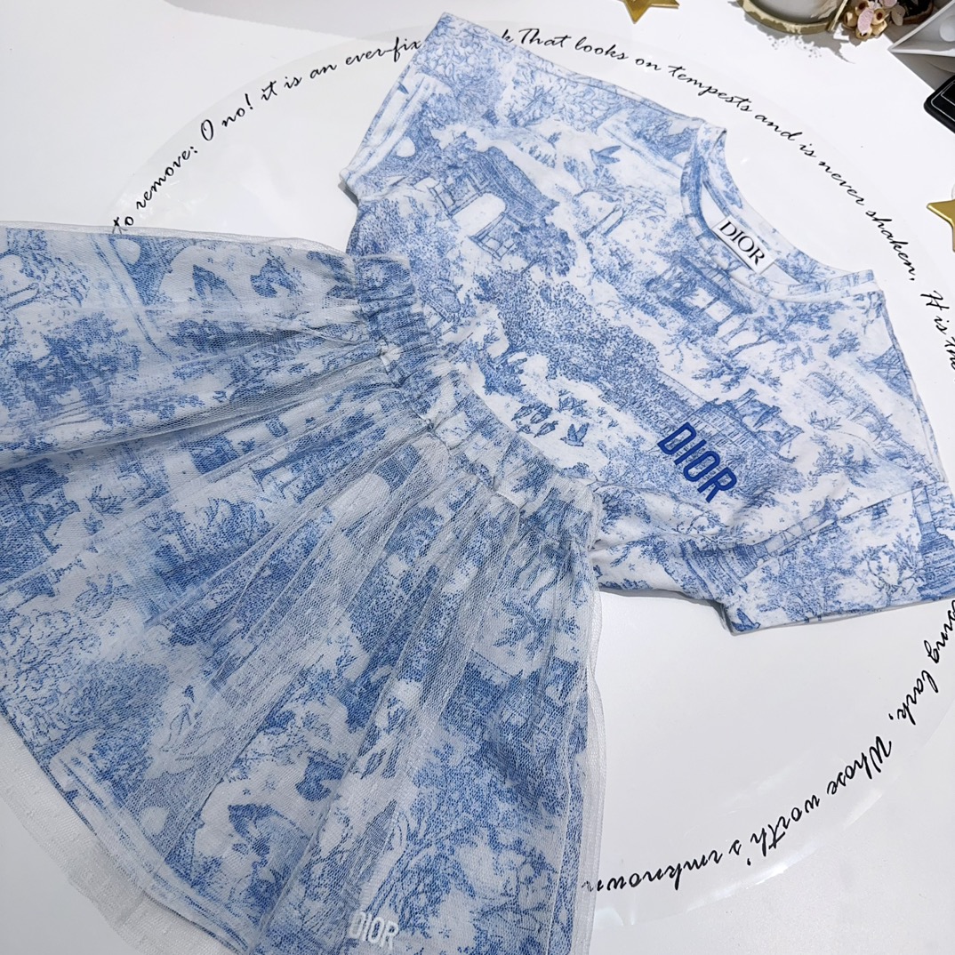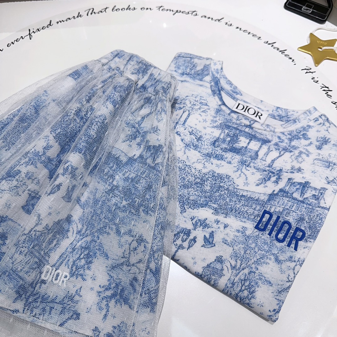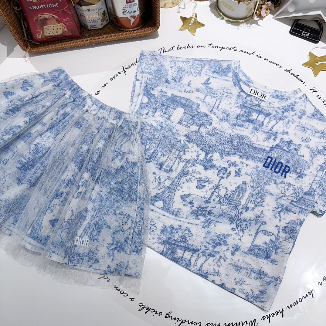 NIGO Dior Kid's Summer Logo Letter Embroidery Round Neck T-shirt Floral Printed Elastic Flared Short Half Skirt #nigo31268